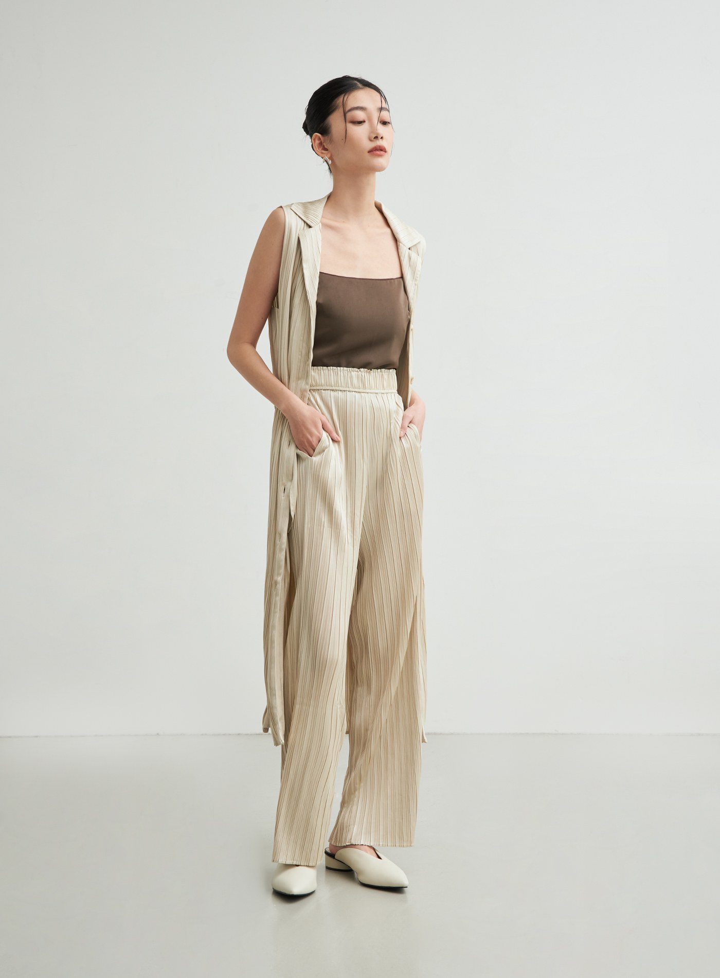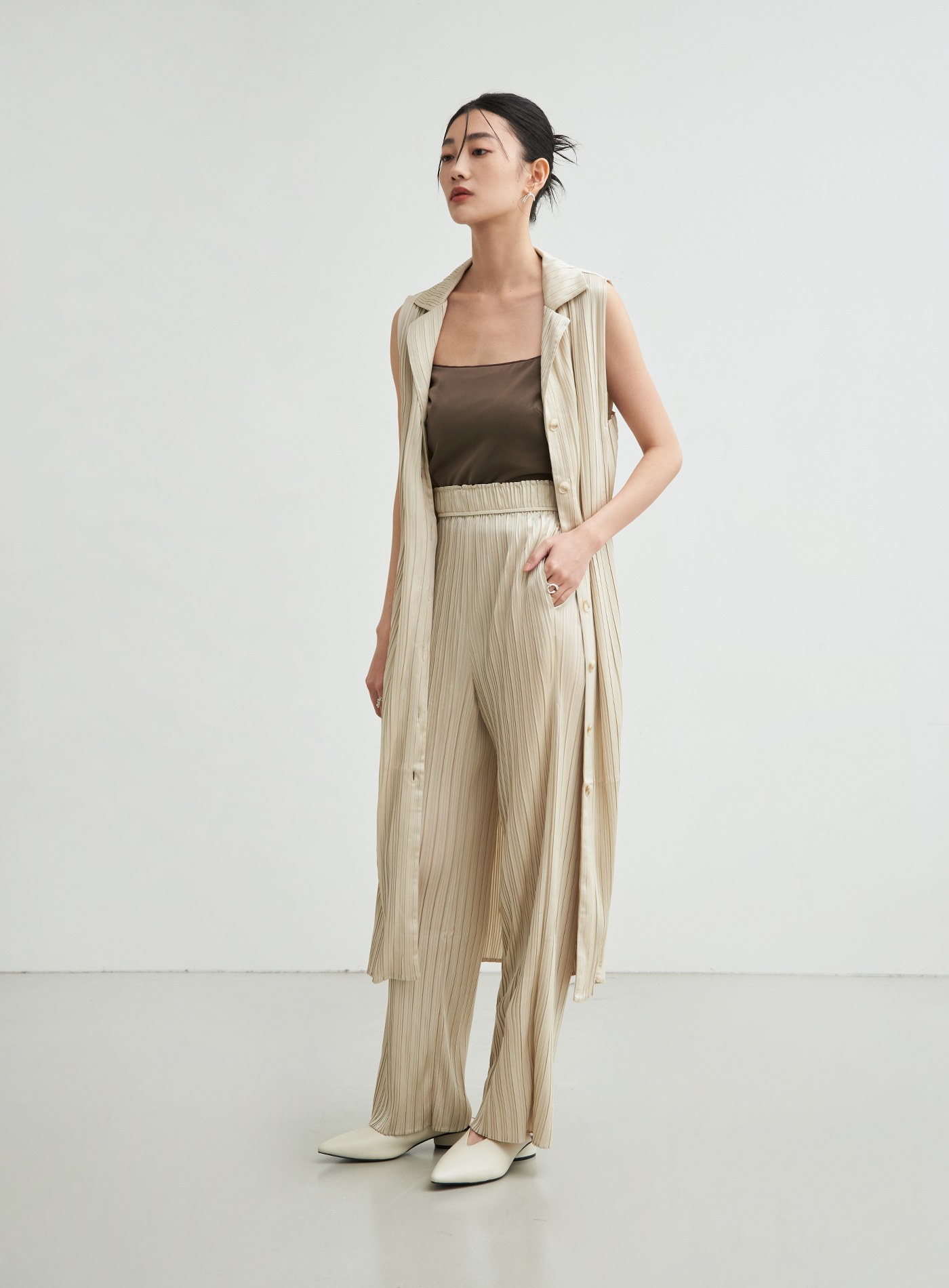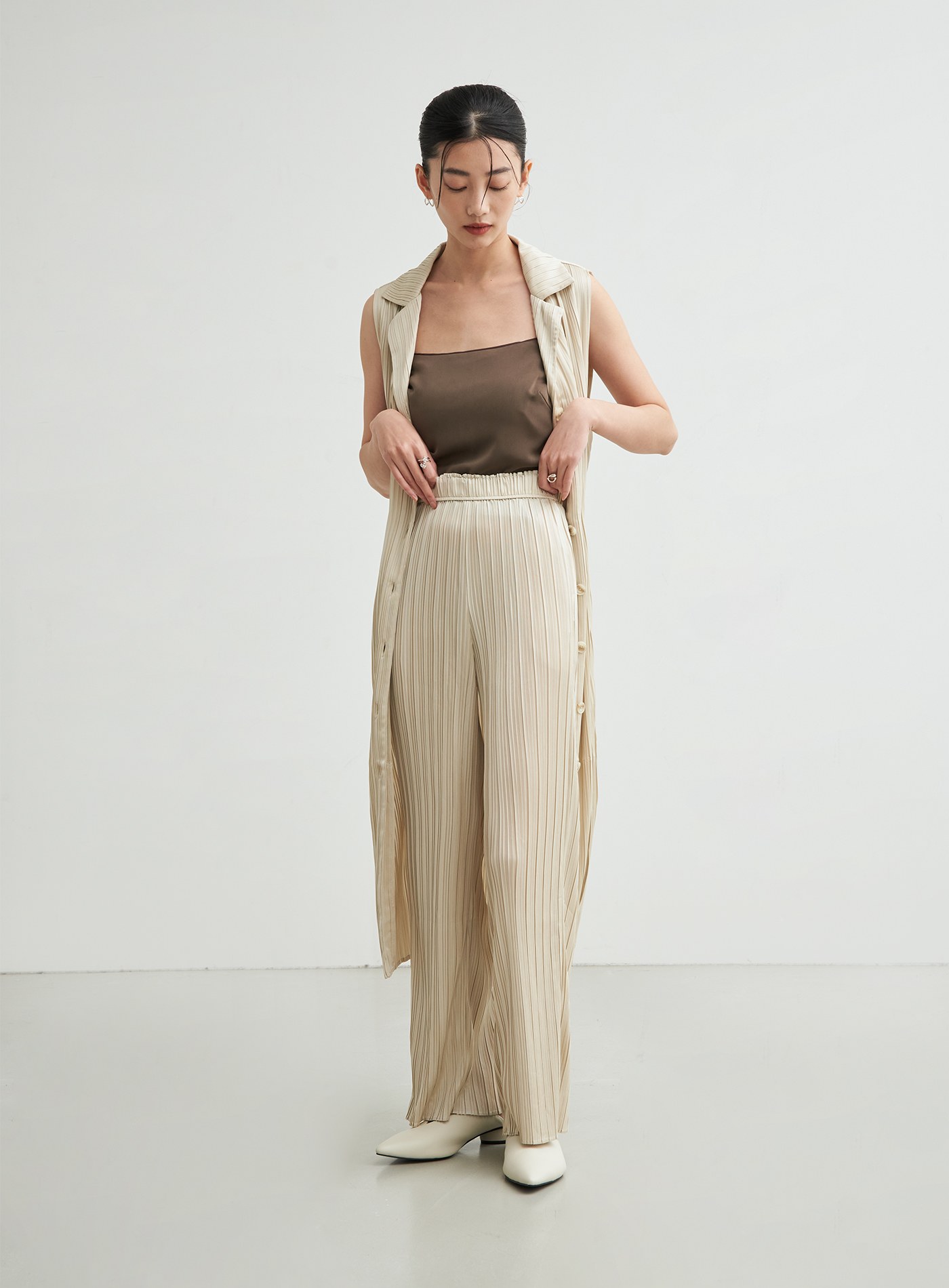 - 使用啞光緞面的輕薄針織布壓摺,穿著起來透氣舒適