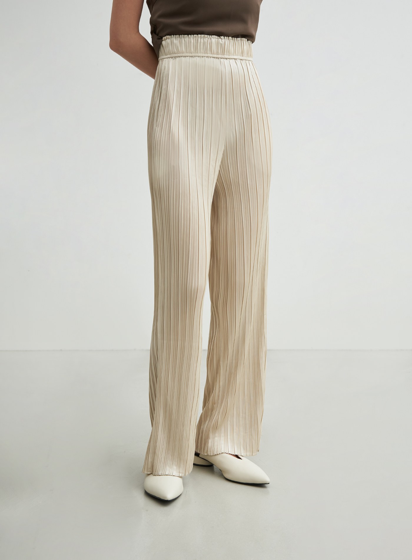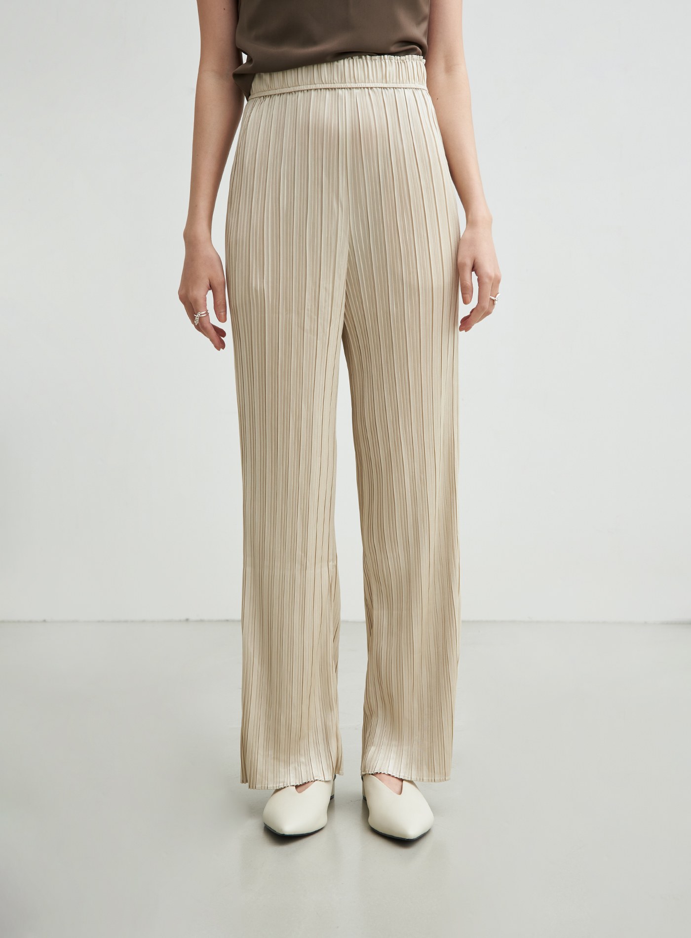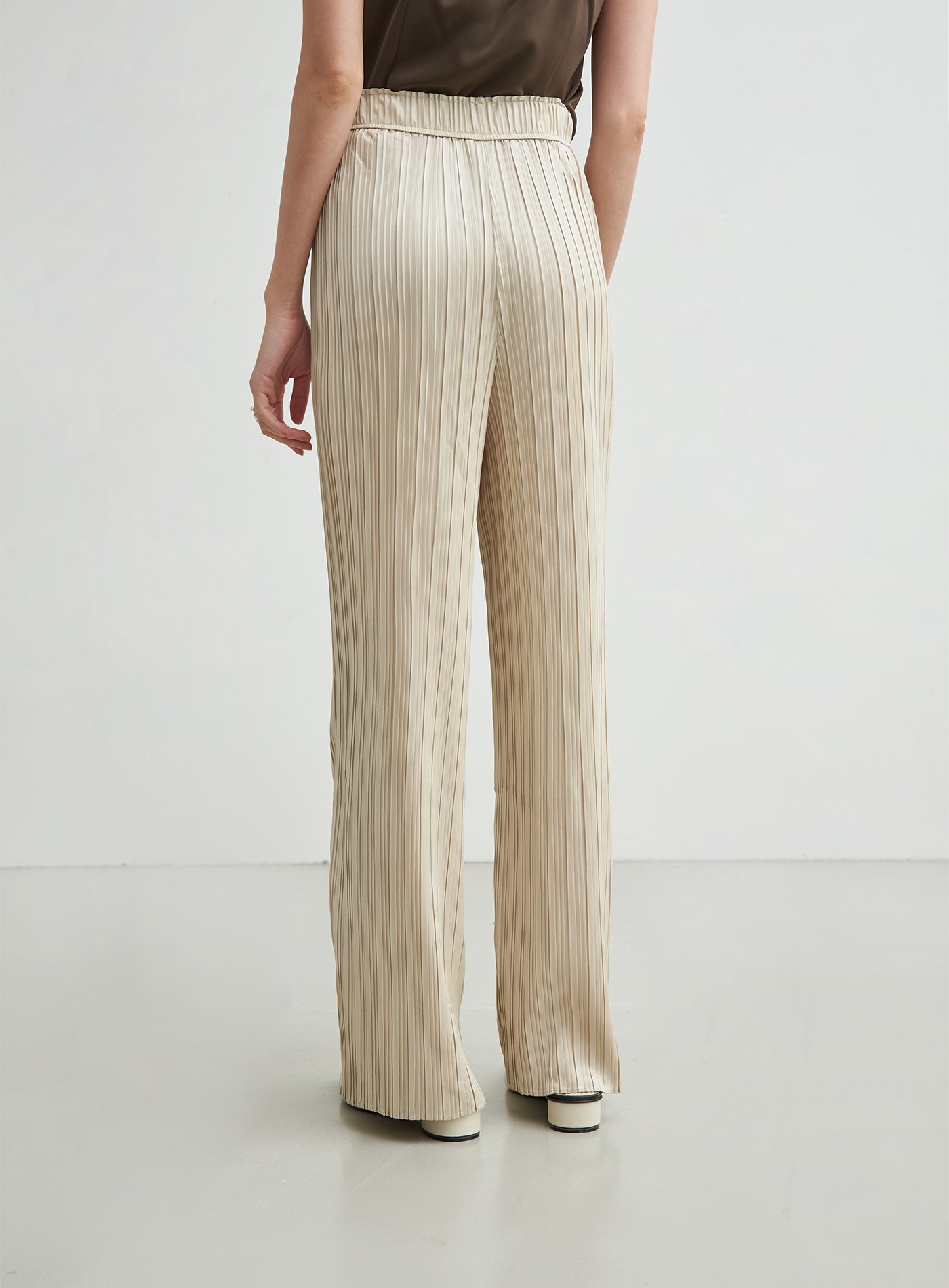 - 使用啞光緞面的輕薄針織布壓摺,穿著起來透氣舒適
