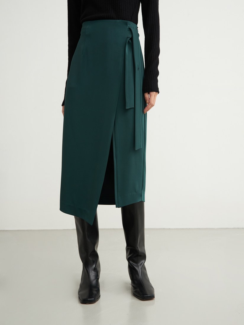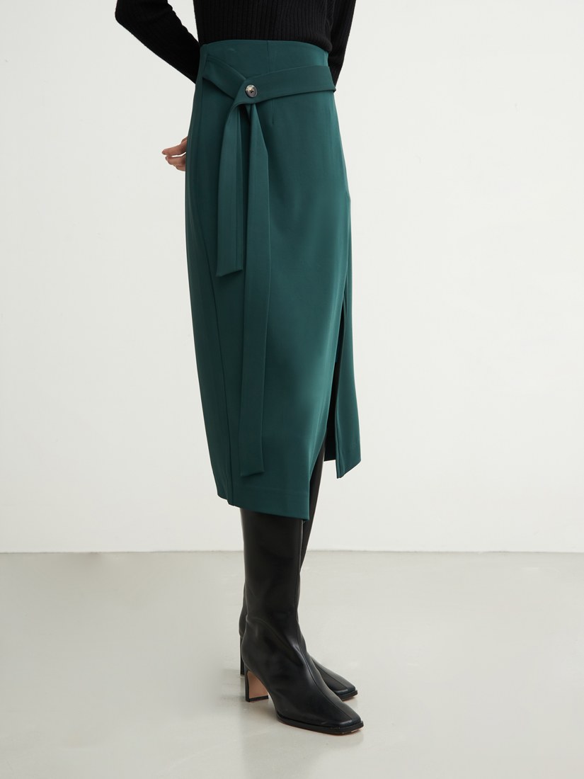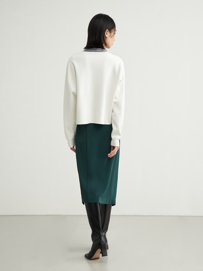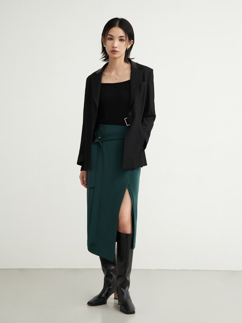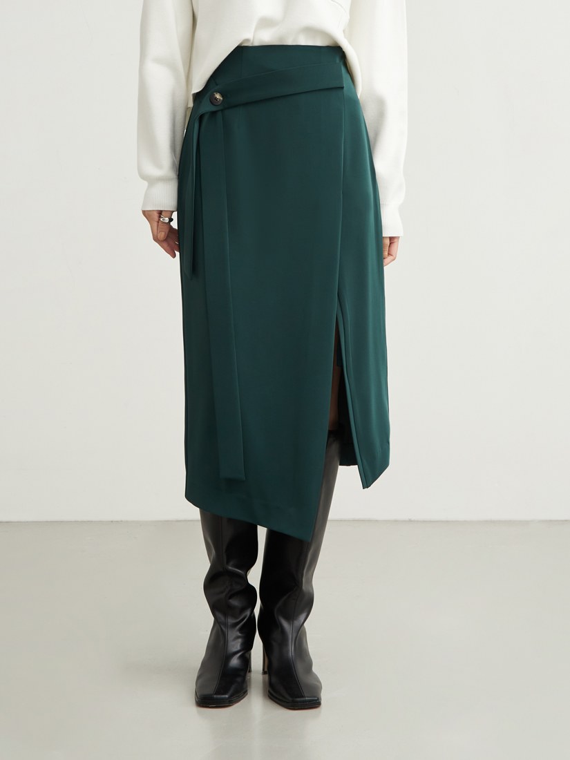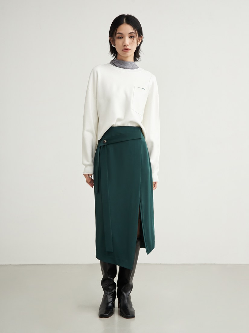 - 假圍裹式半身裙剪裁/利用車縫效果仿單片圍裹裙設計,不擔心走光
