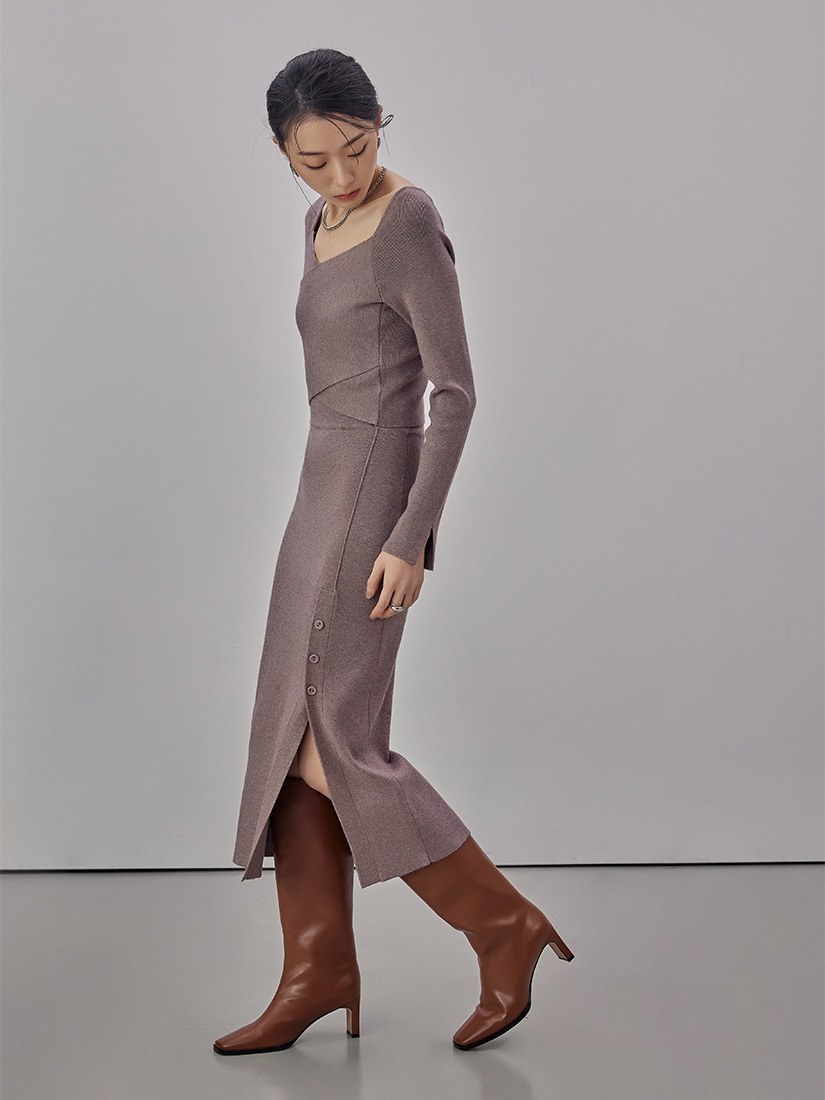 - 前身下擺開單側衩,加上開釦細節/開衩上方銜接平塔克線條設計,增加修長感