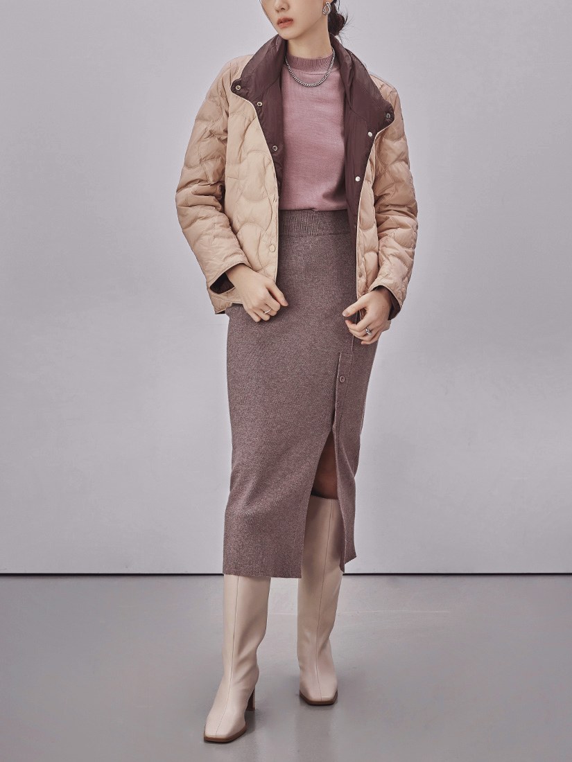 - 紗線含有彈性紗增加舒適度,面感厚實有挺度,修飾身形