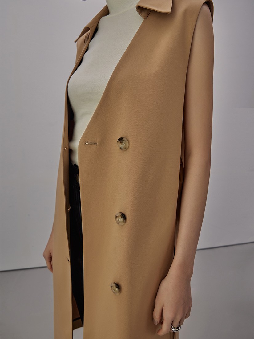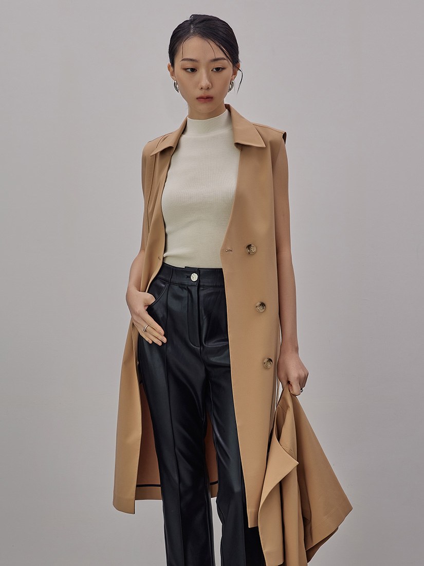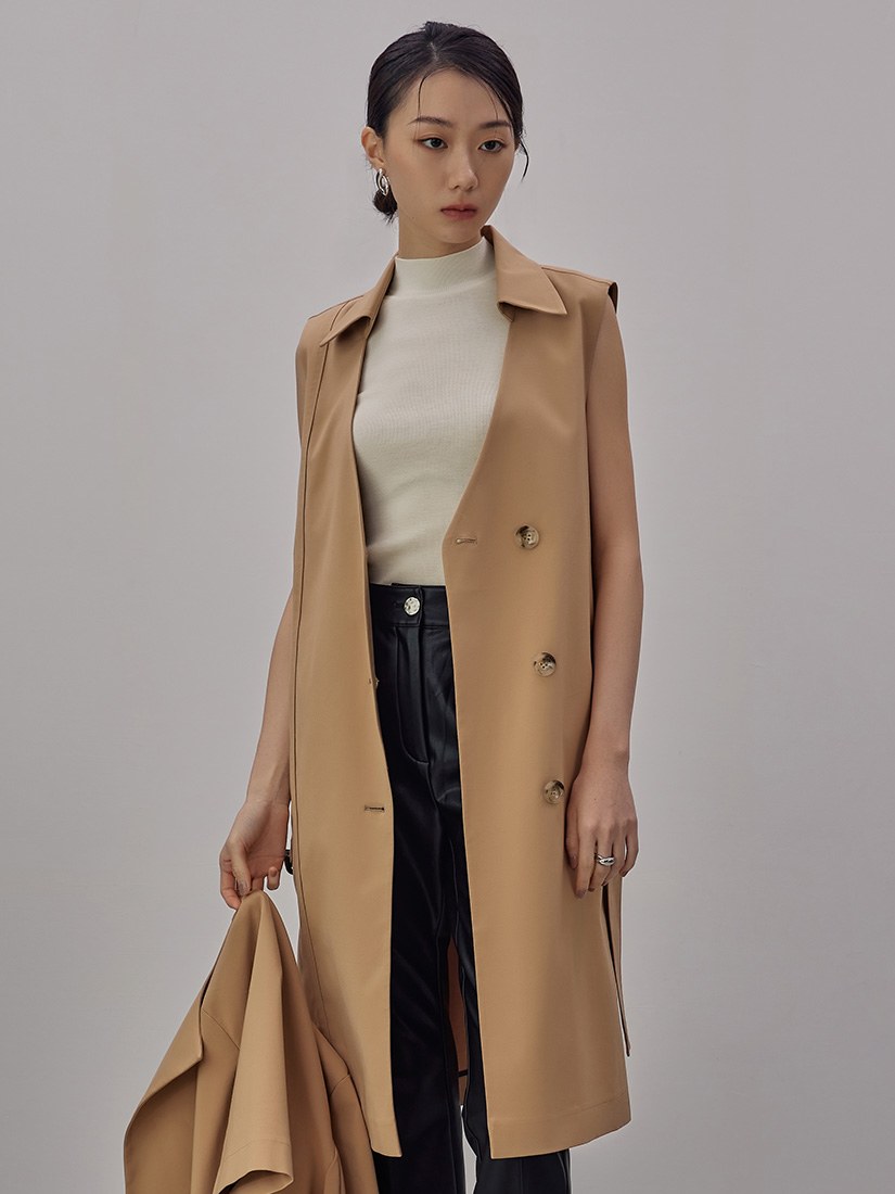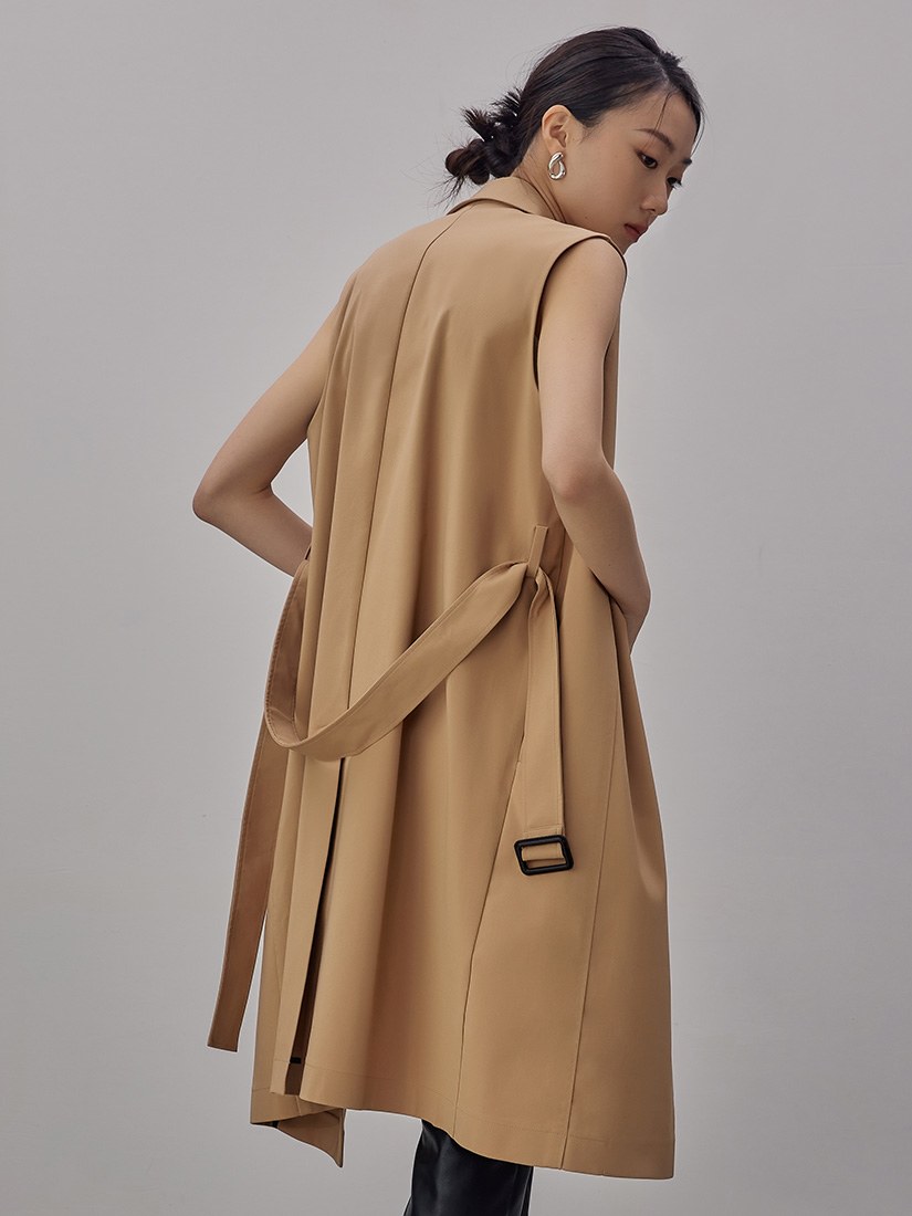 - 風衣背心長版外套/版型俐落/附可拆式腰帶/不對稱開衩/質感仿皮五金腰環