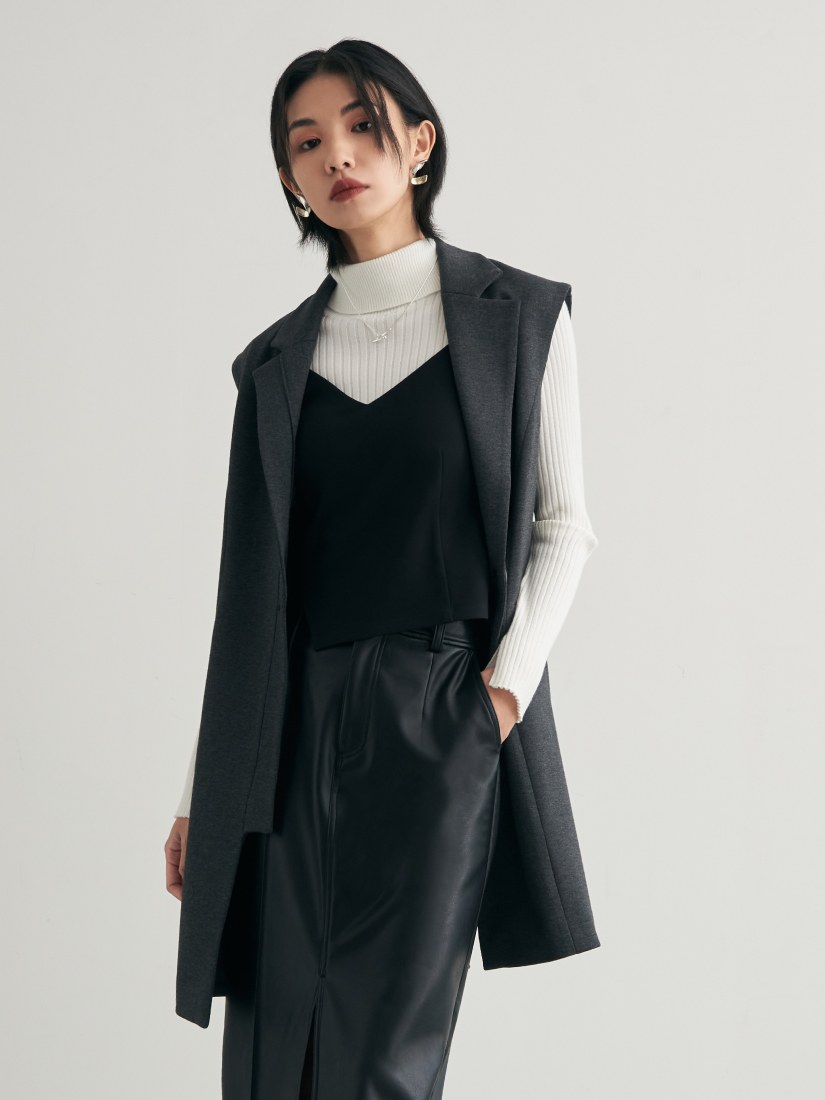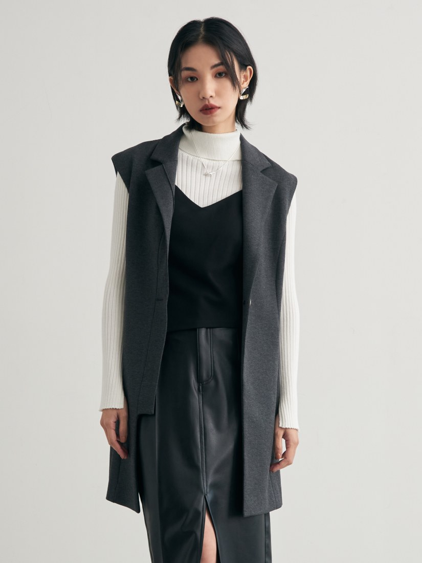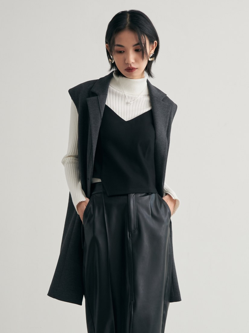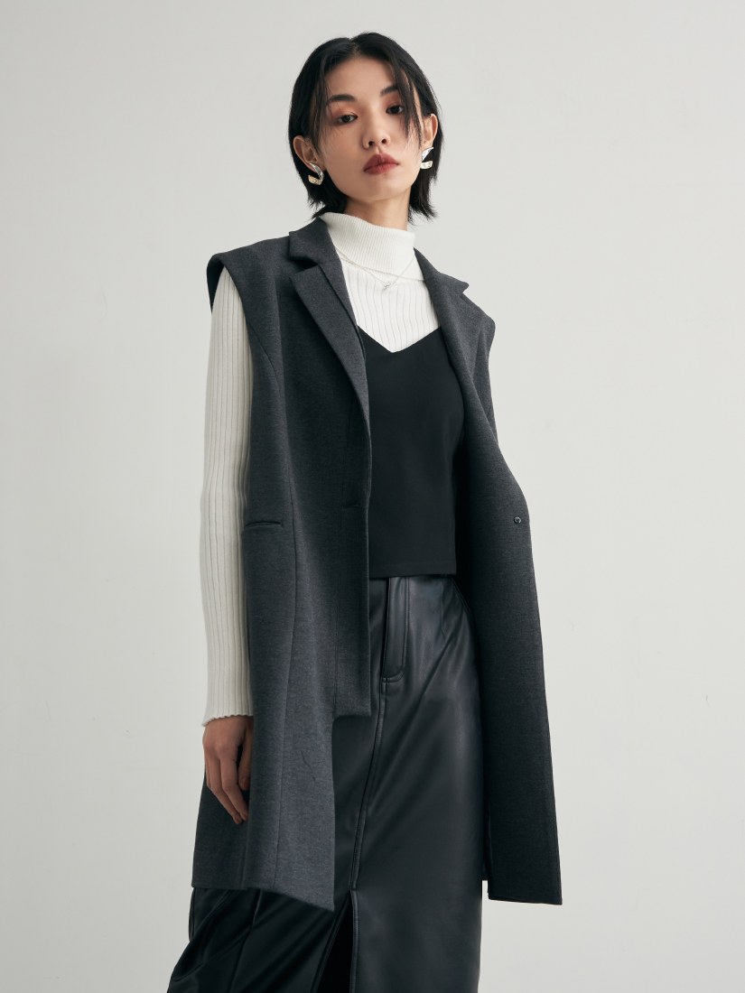 - 前身右領片立體挺縫線設計,加上不對稱門襟設計,營造假兩件效果