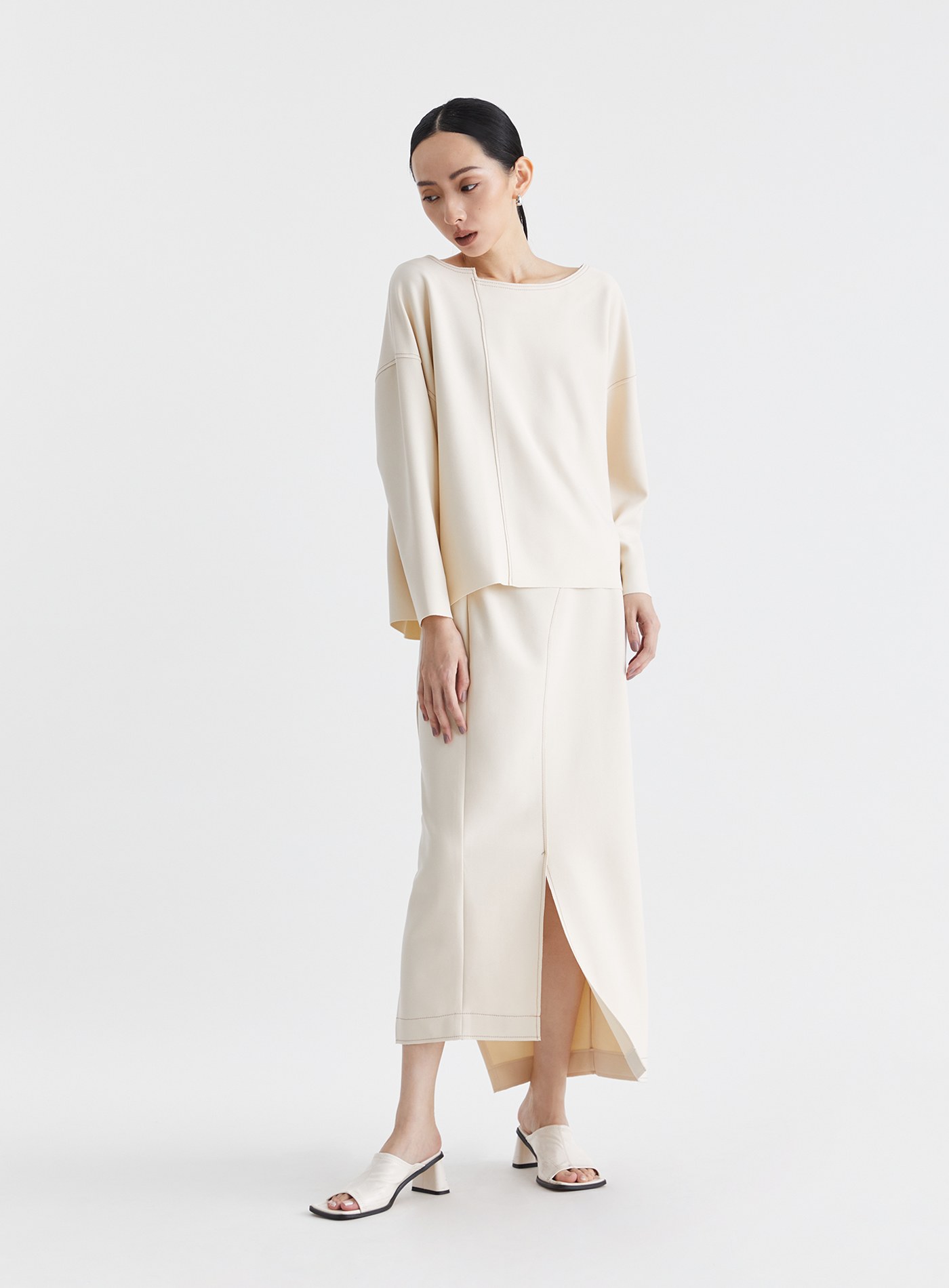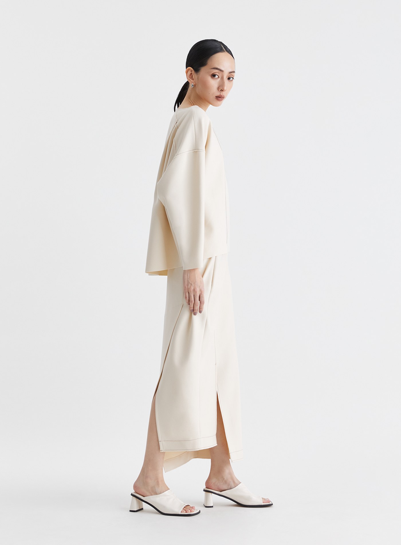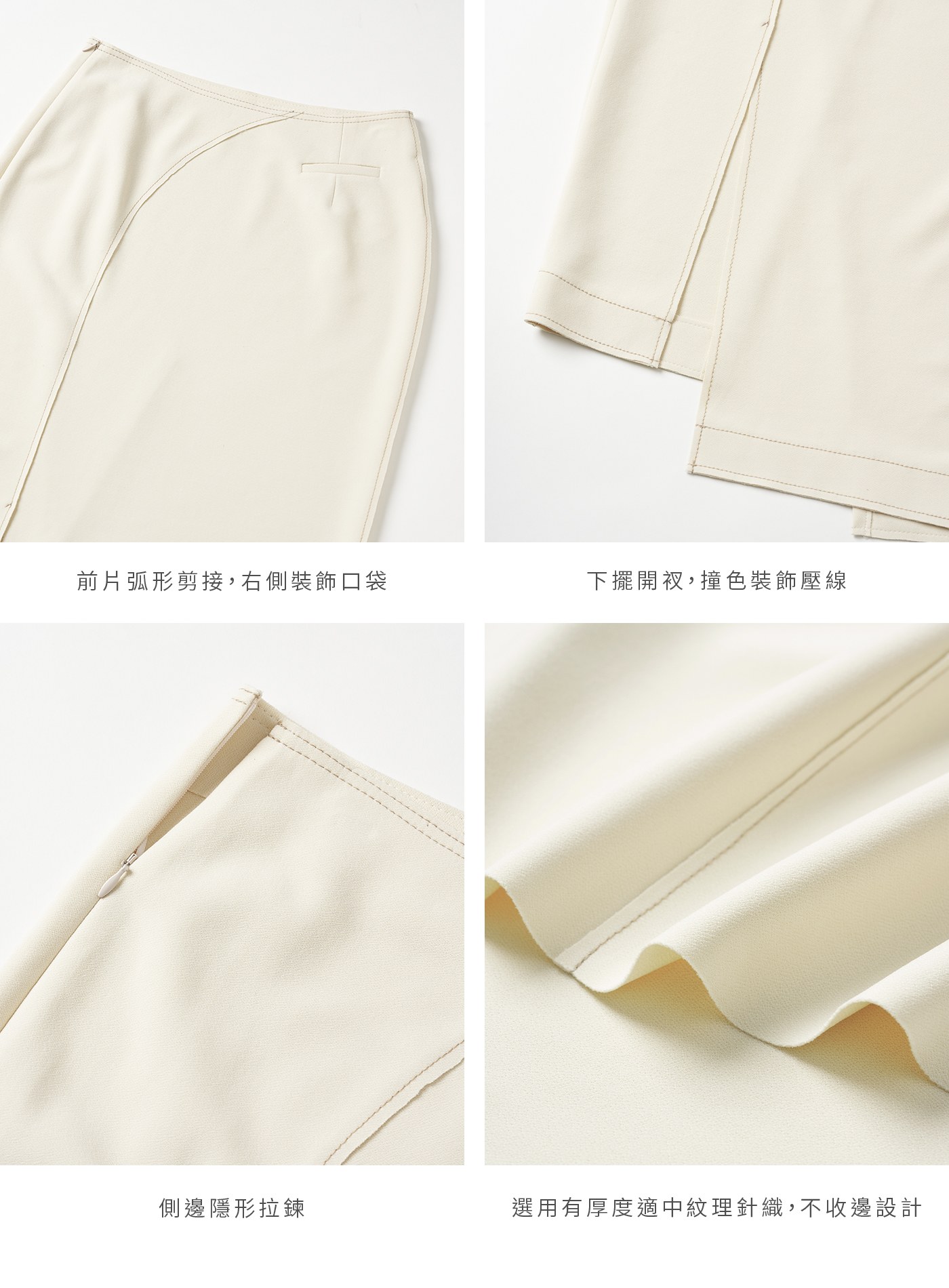 - 前片弧形剪接開衩,右側裝飾口袋,增添造型感