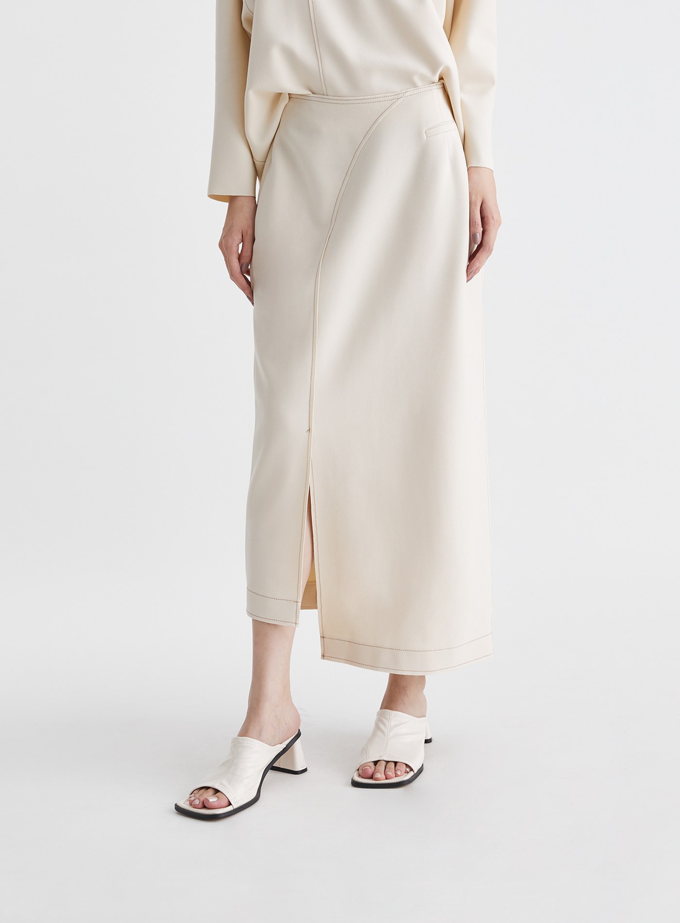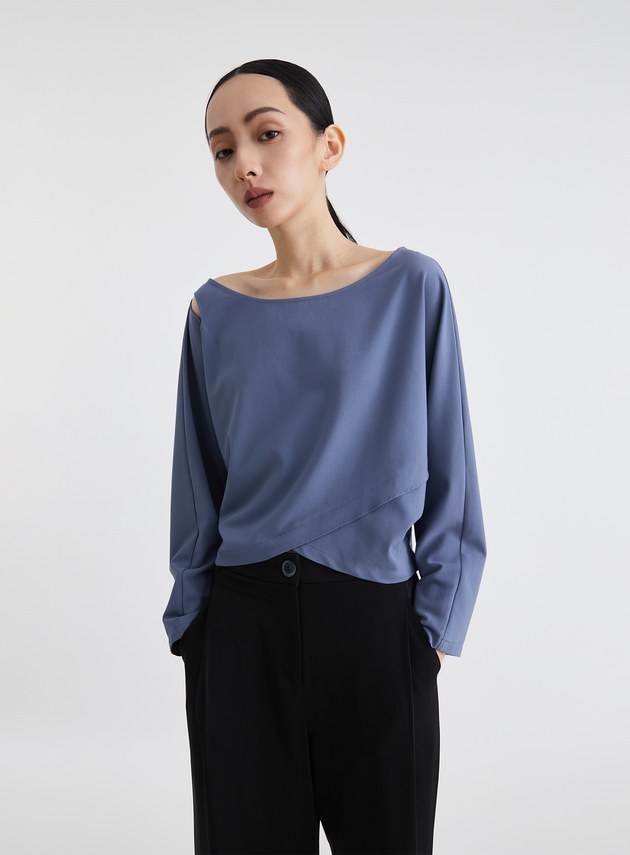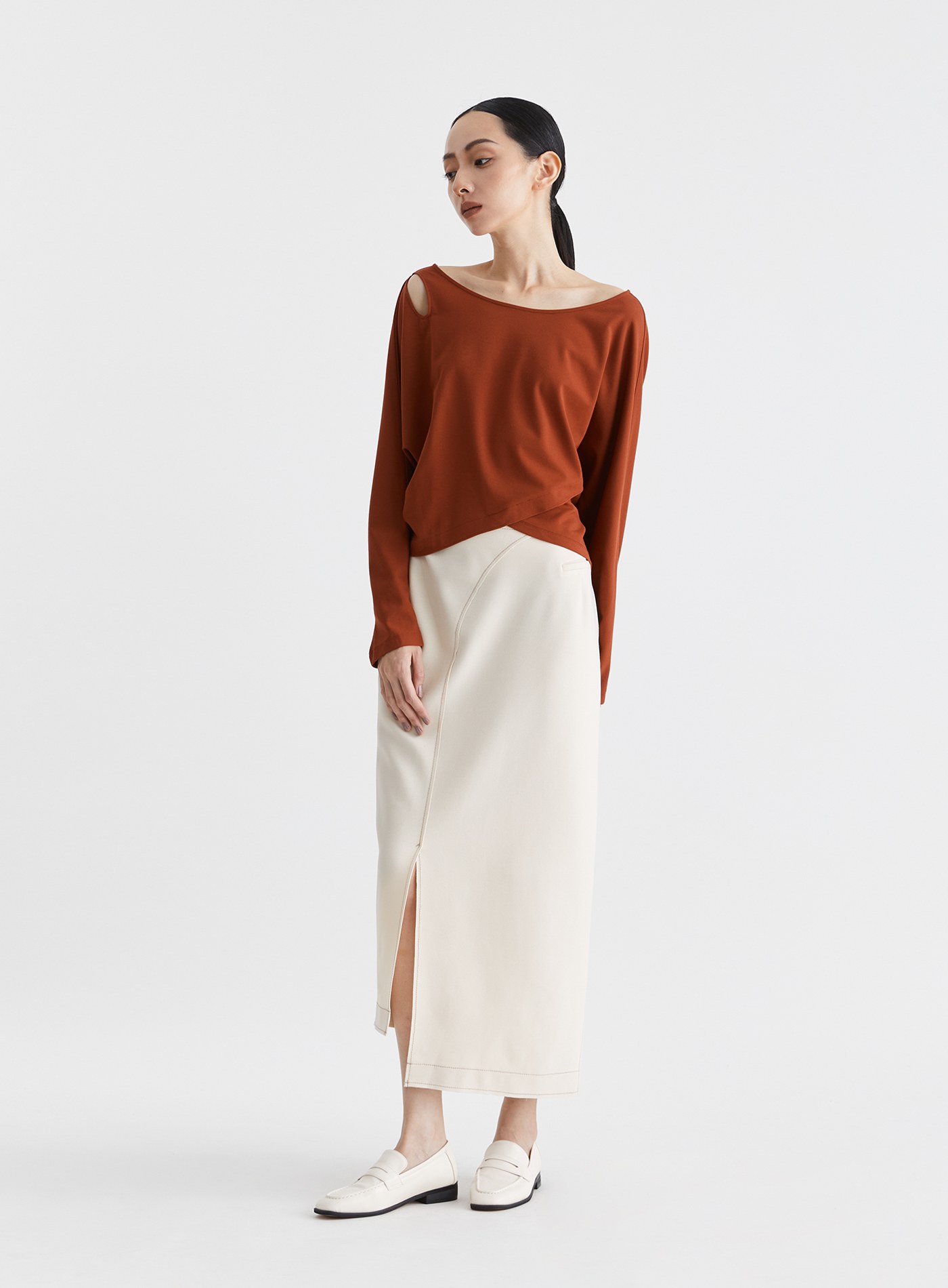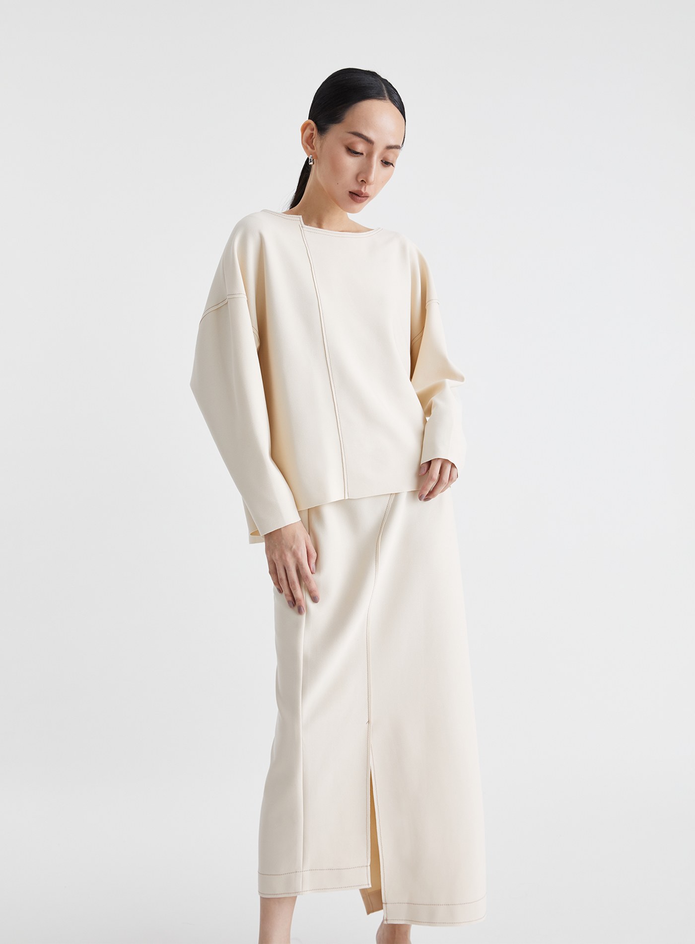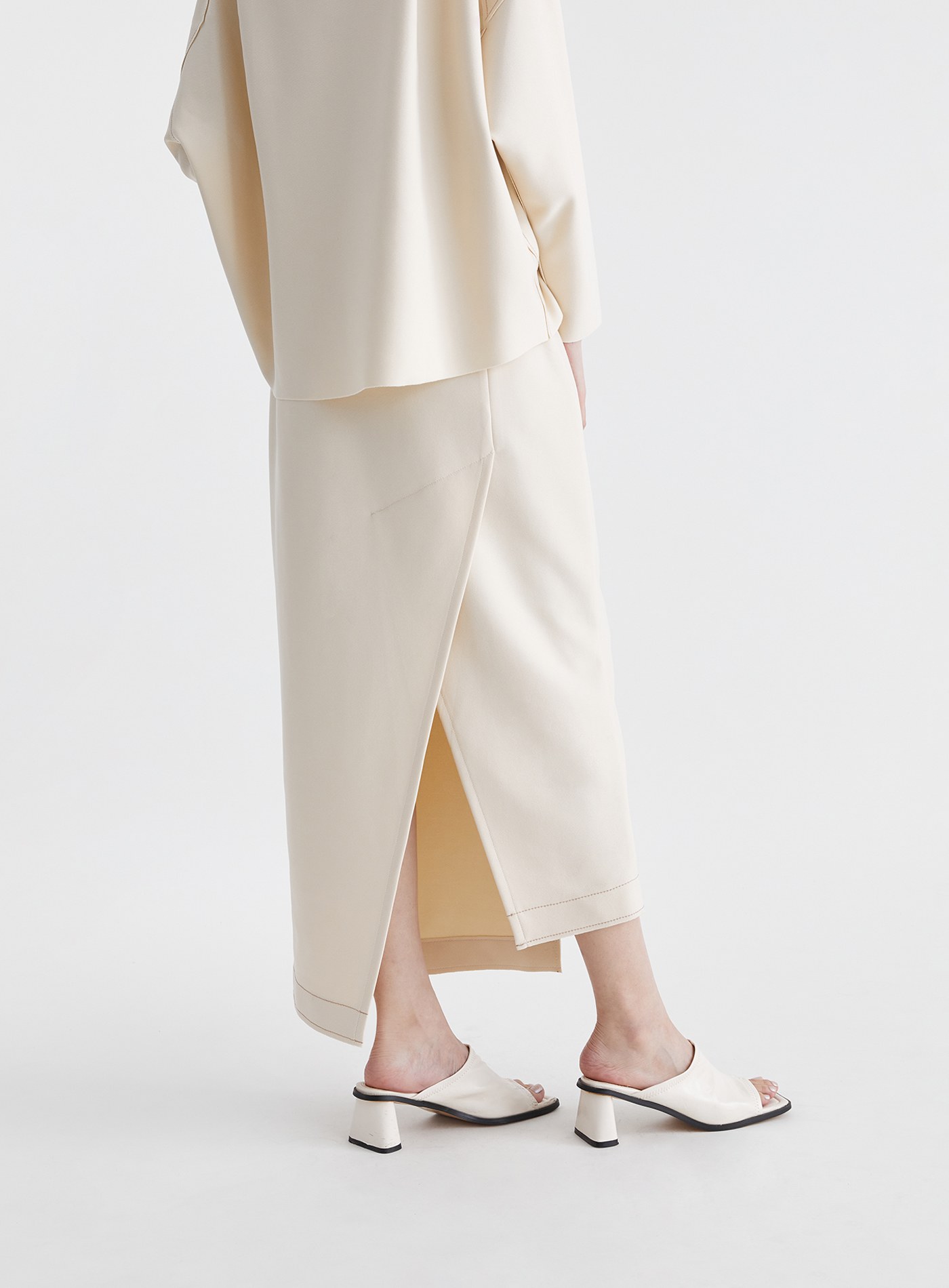 - 前片弧形剪接開衩,右側裝飾口袋,增添造型感