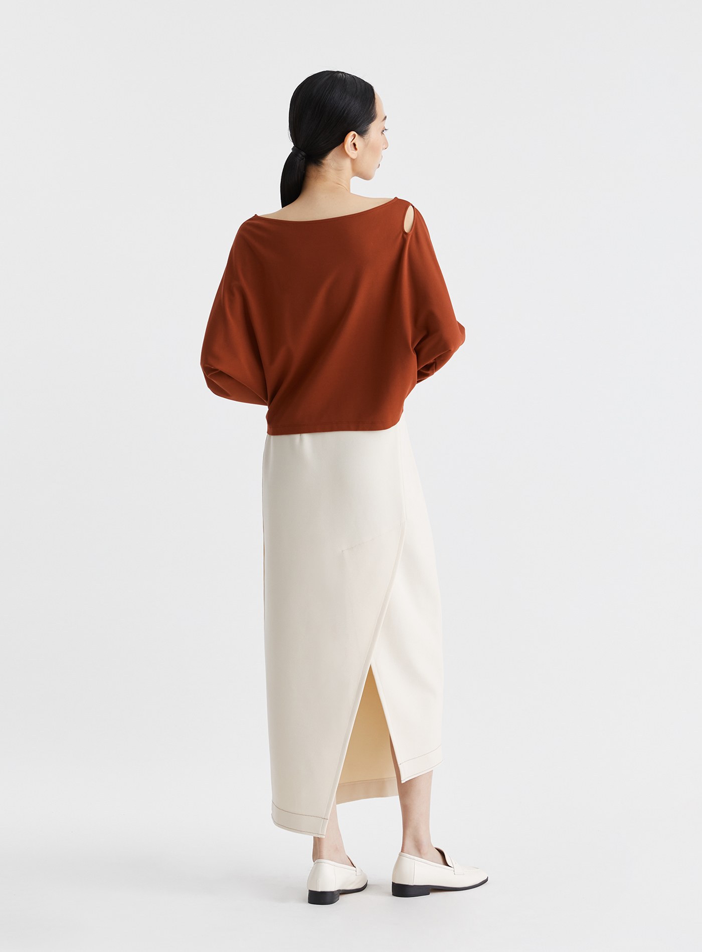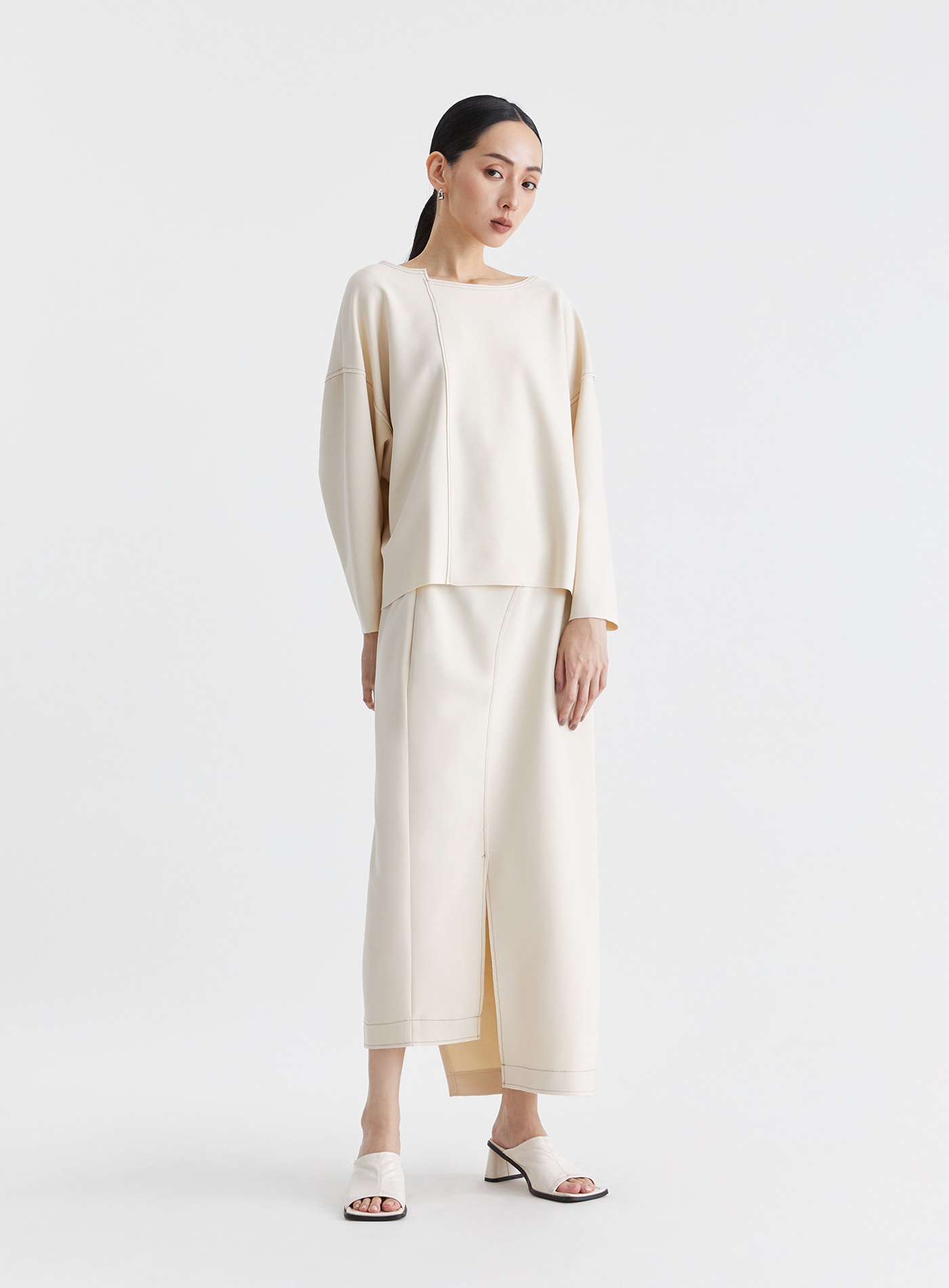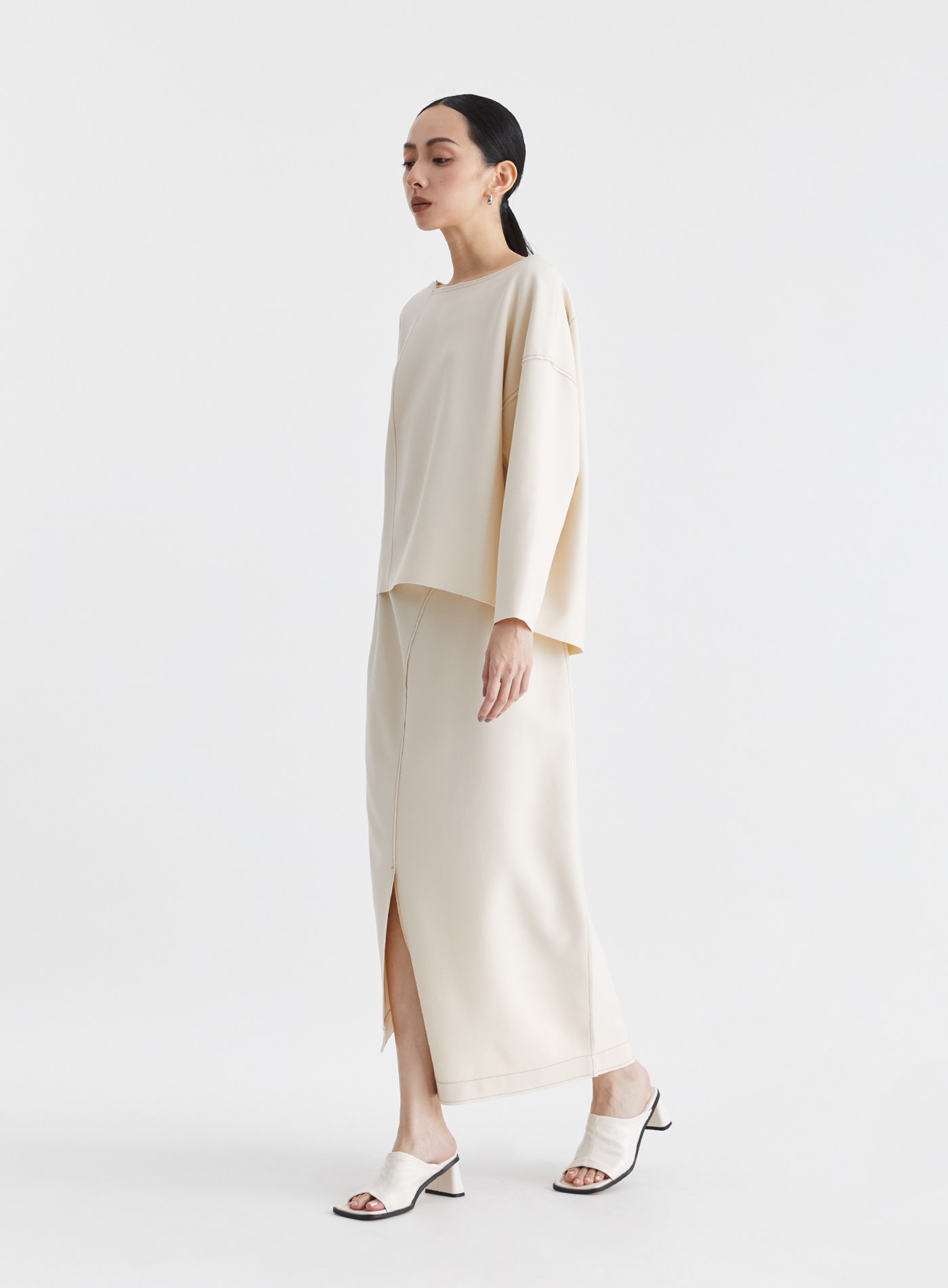 - 前片弧形剪接開衩,右側裝飾口袋,增添造型感