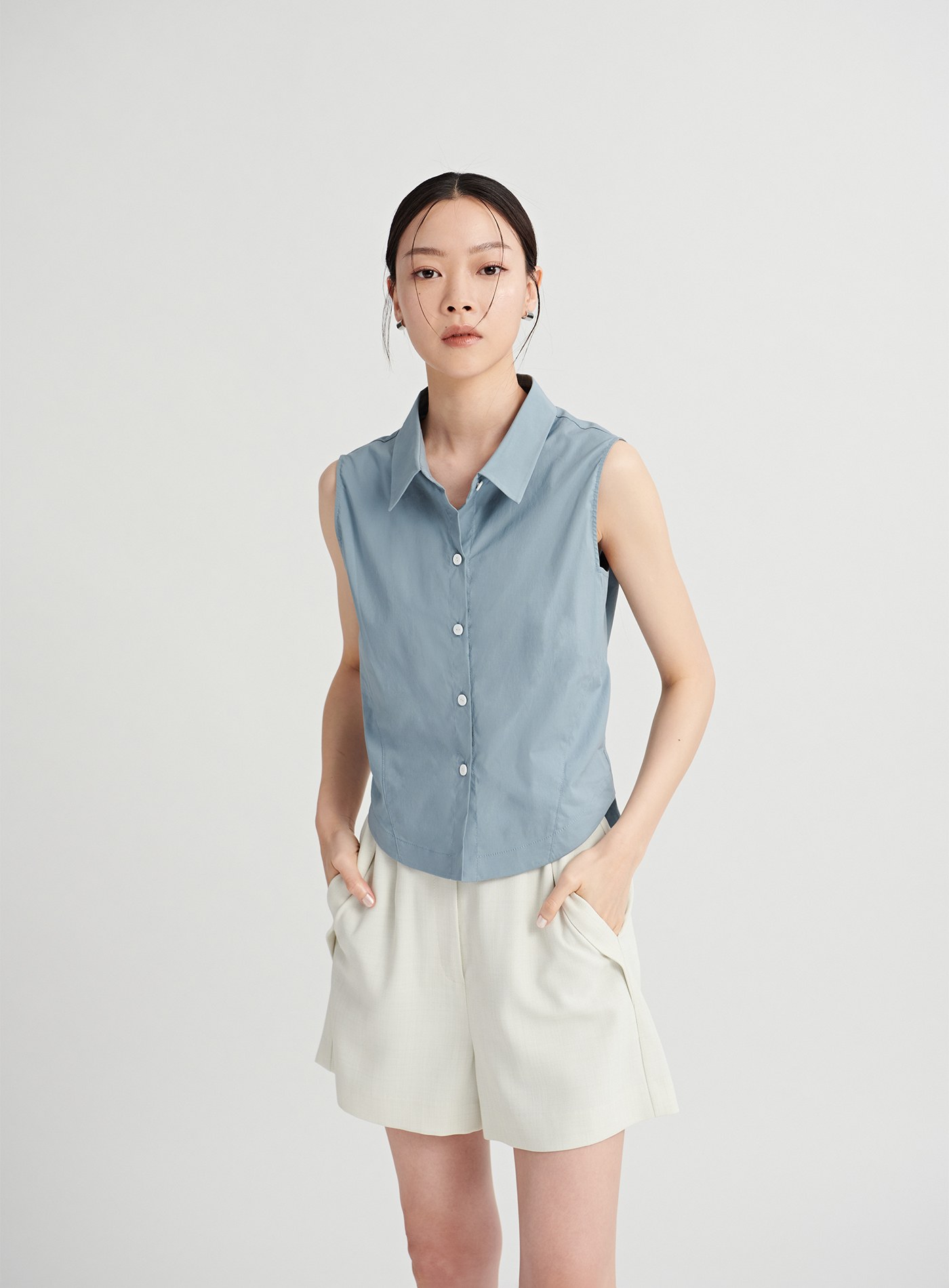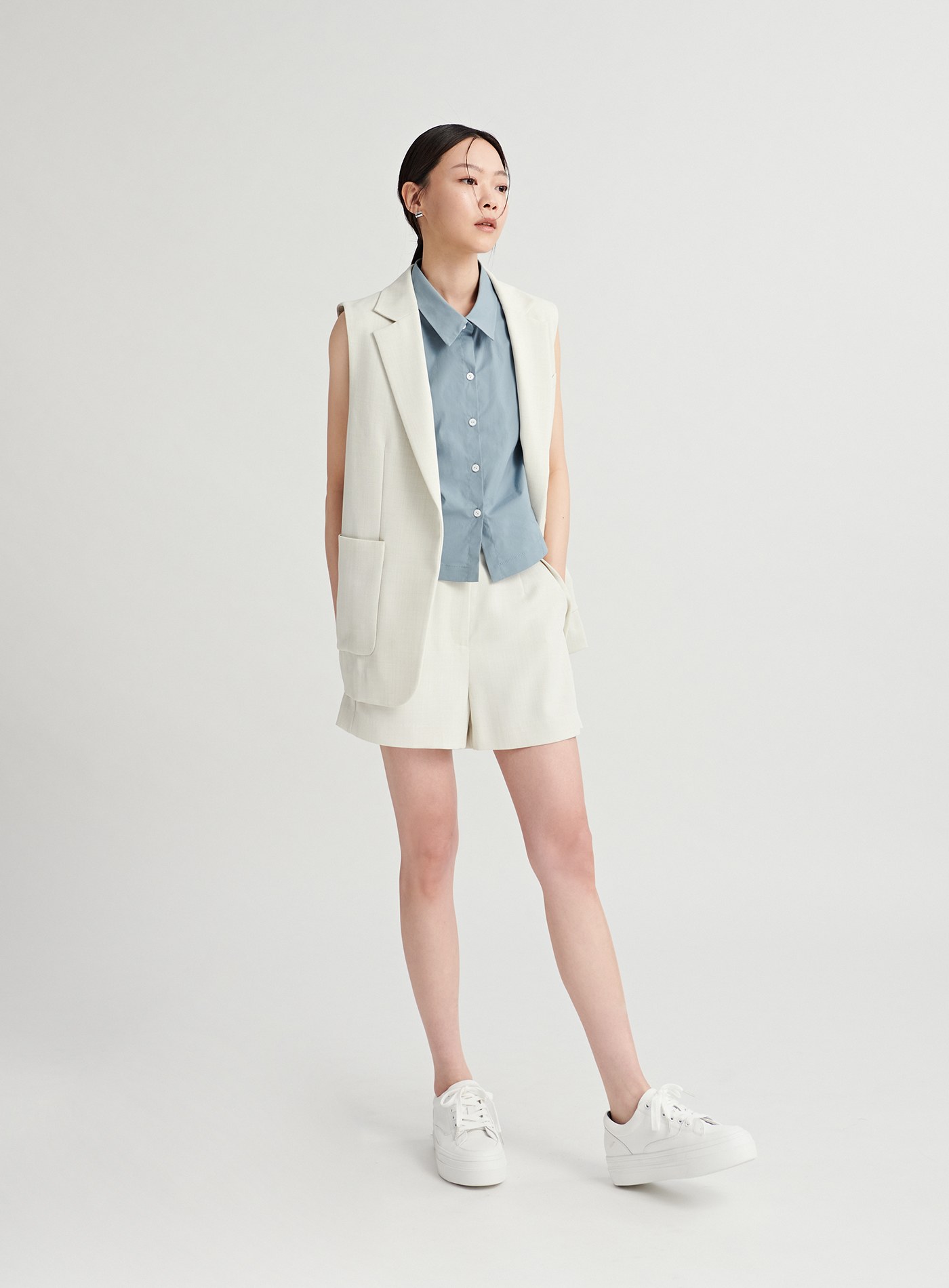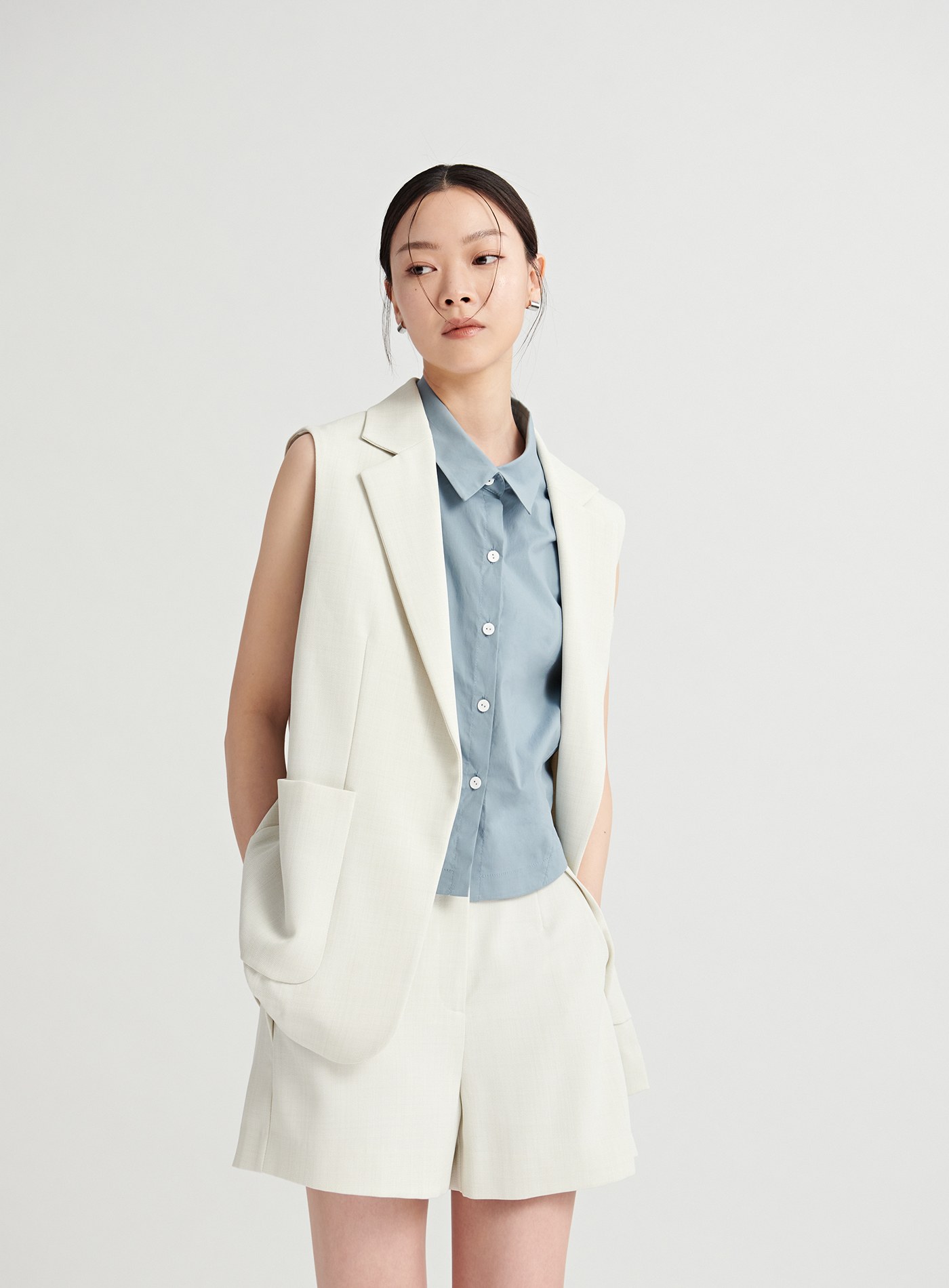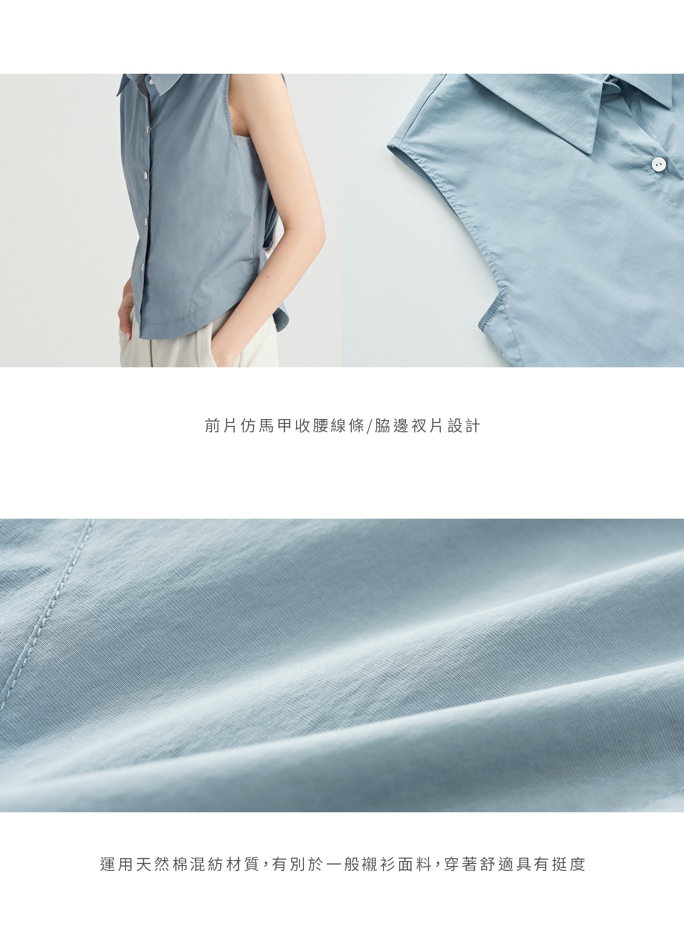 - 百搭的經典襯衫融入了馬甲收腰剪接線條與脇邊衩片設計