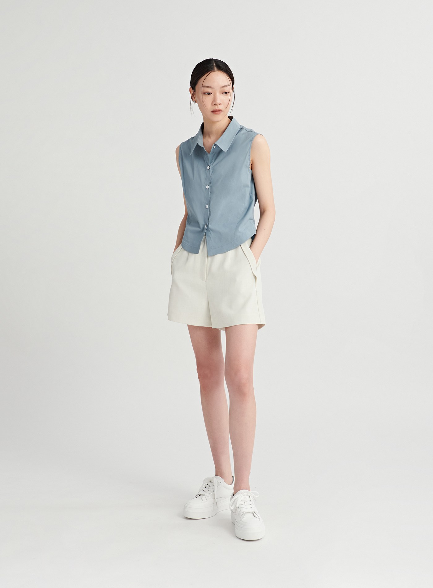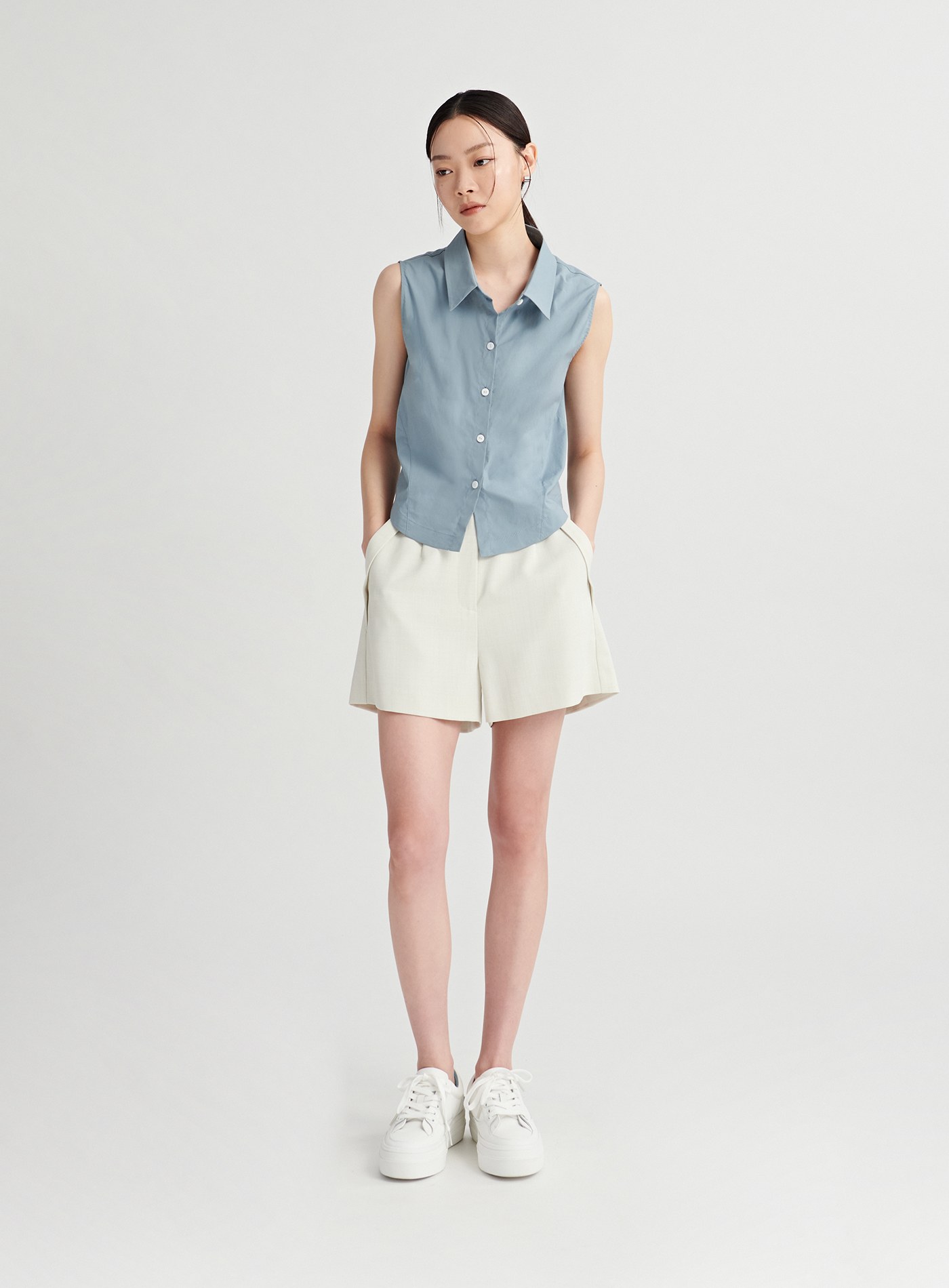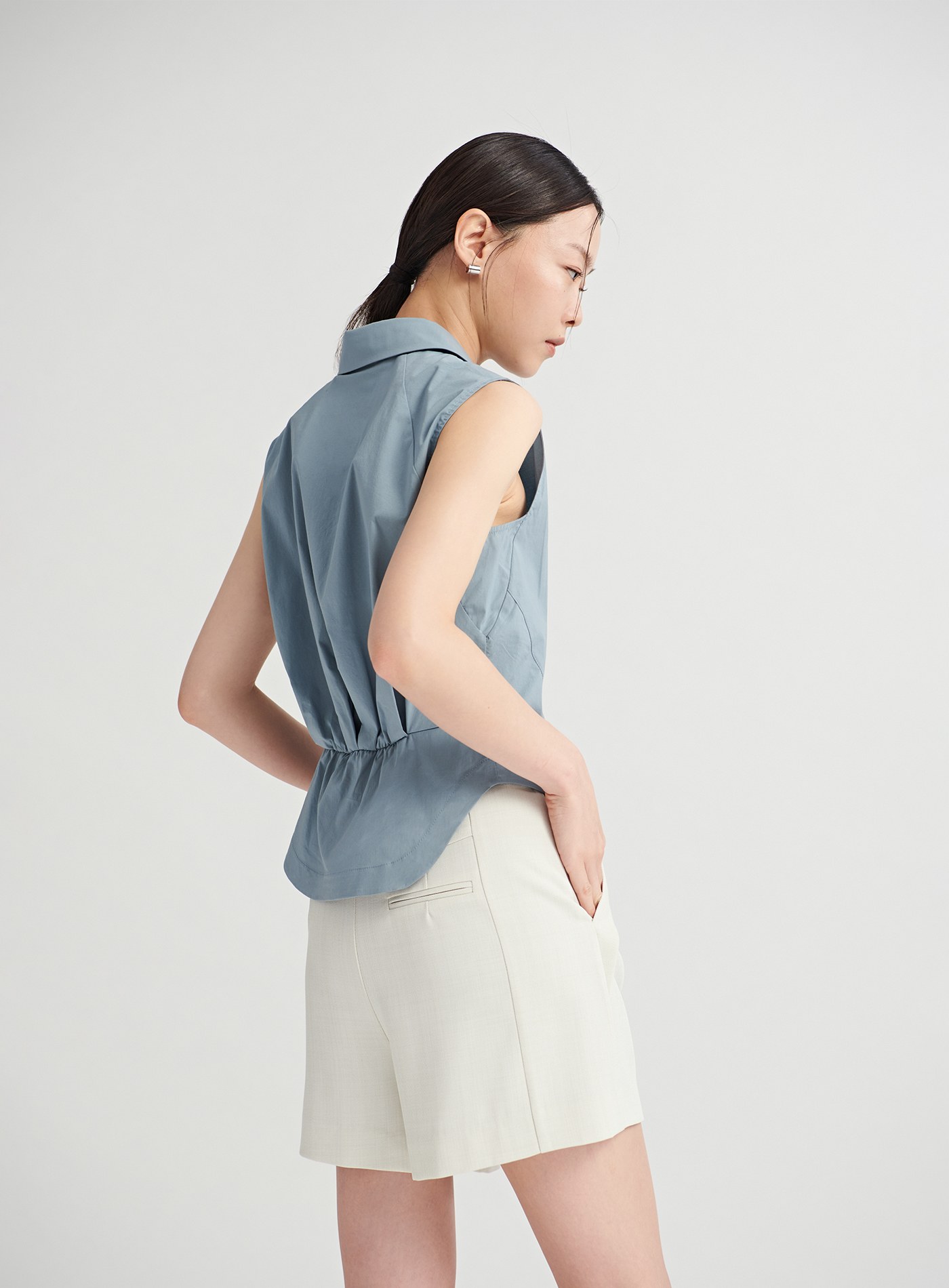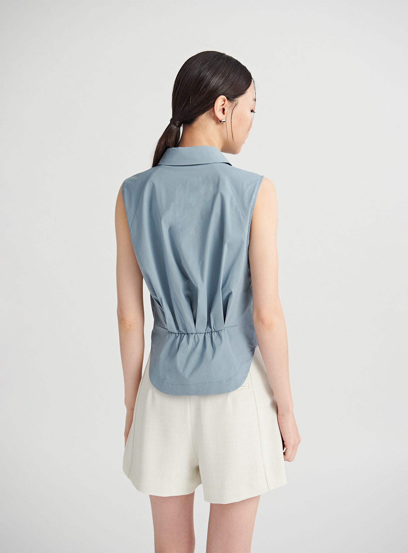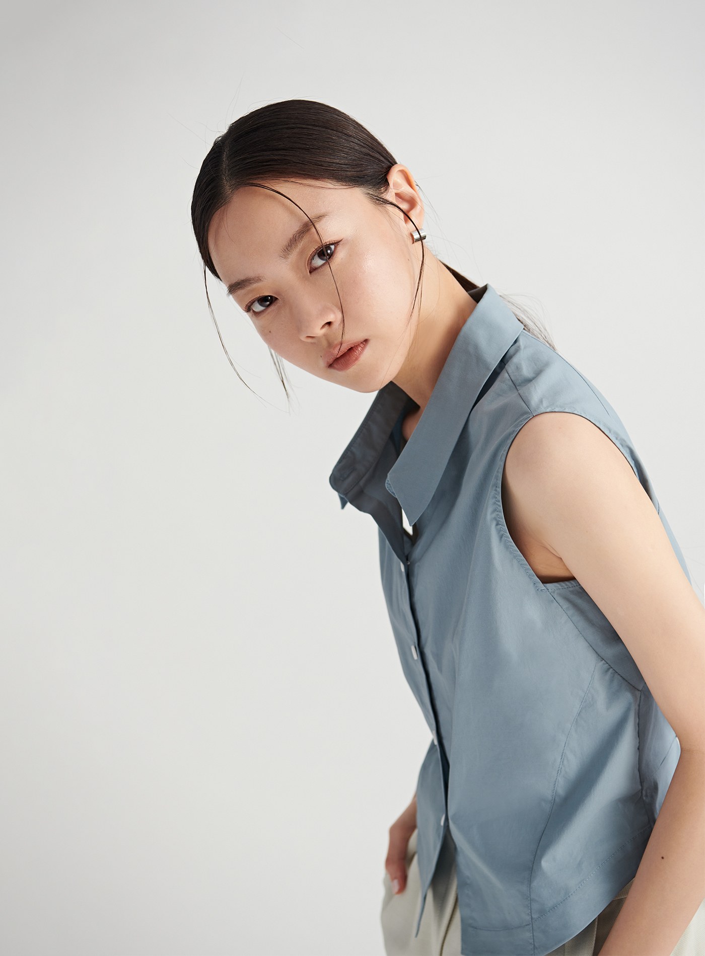 - 百搭的經典襯衫融入了馬甲收腰剪接線條與脇邊衩片設計