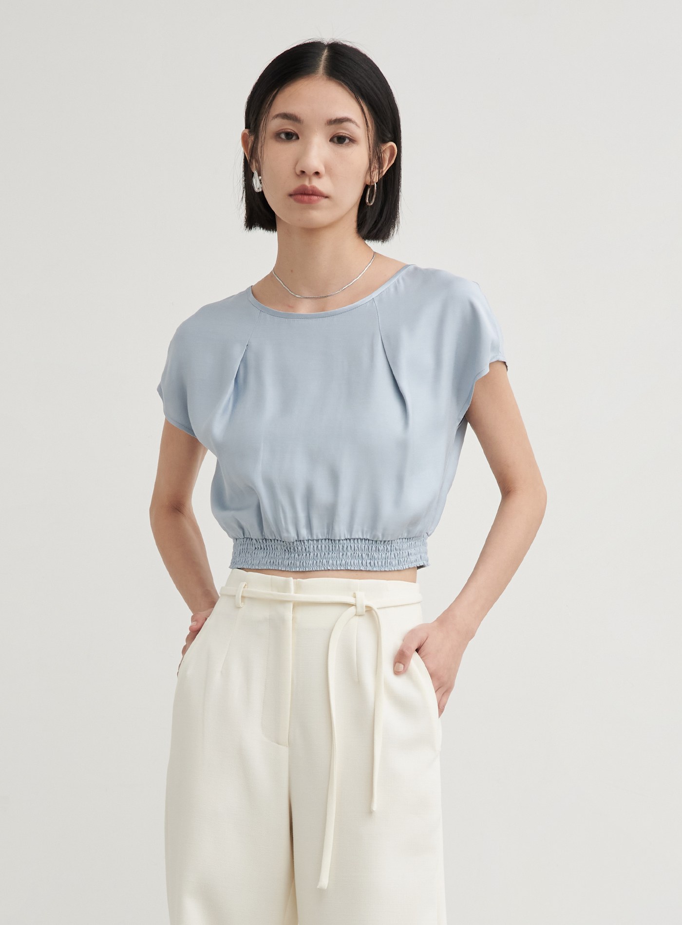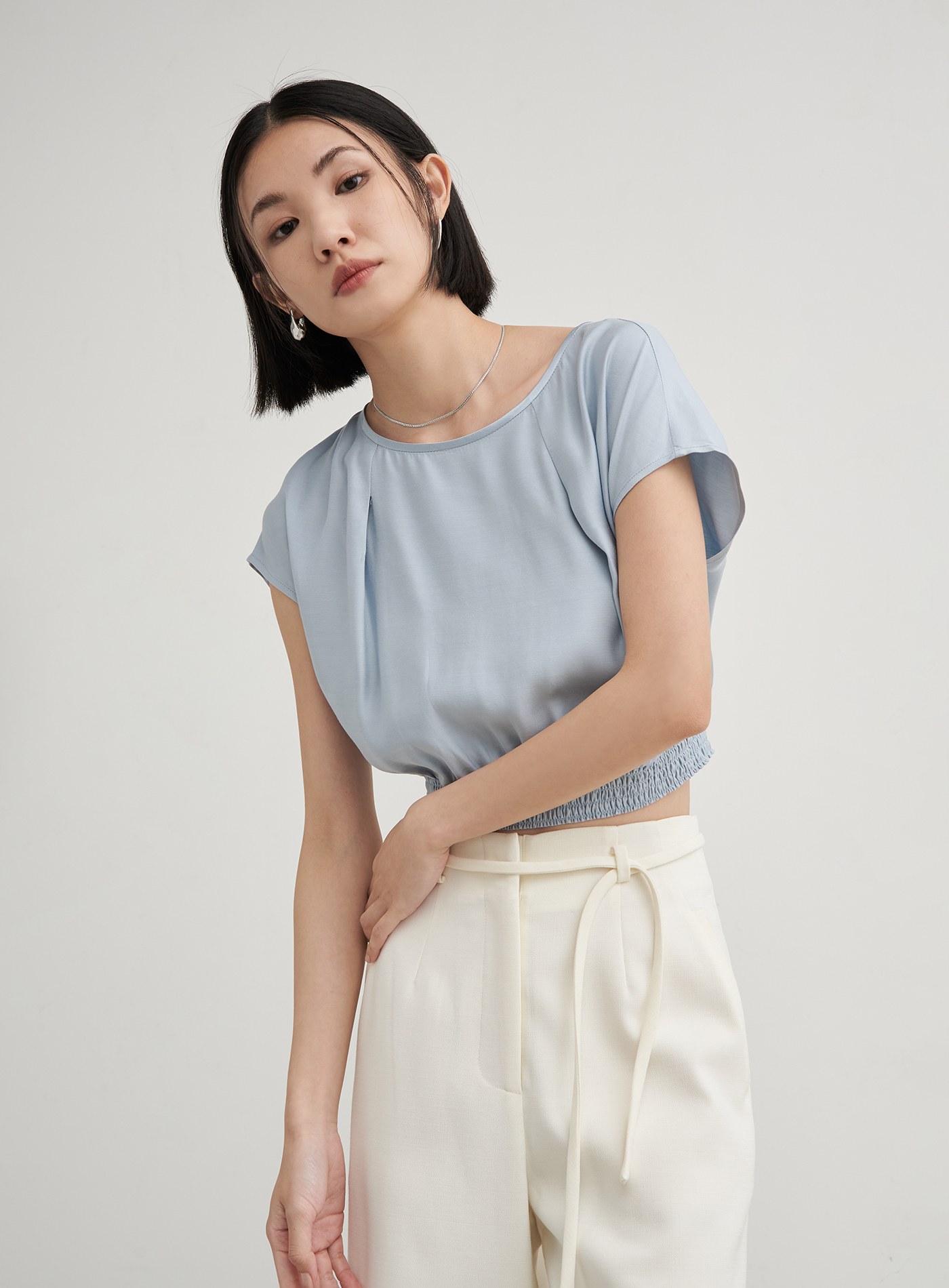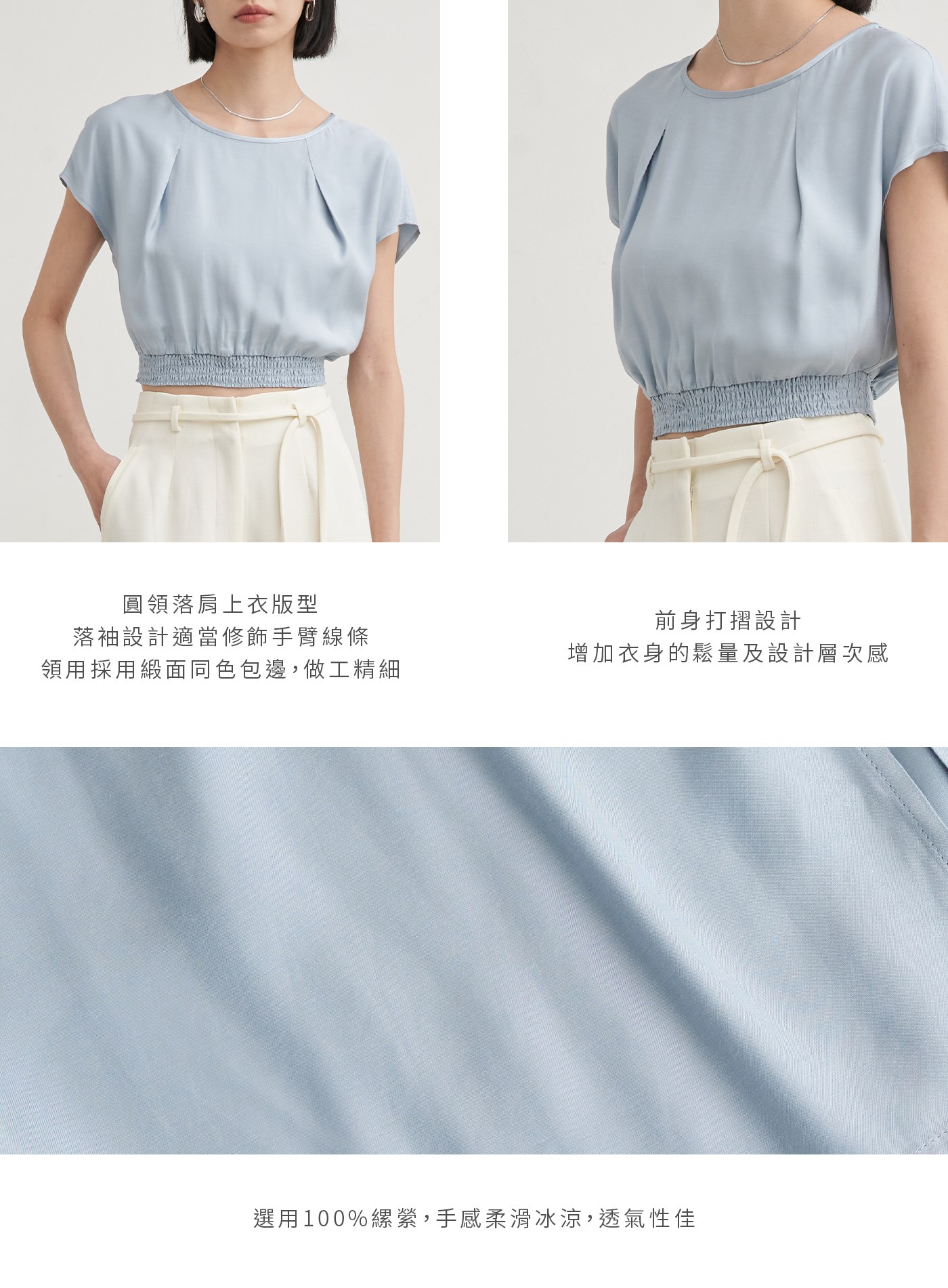 - 圓領落肩上衣版型,落袖設計適當修飾手臂線條