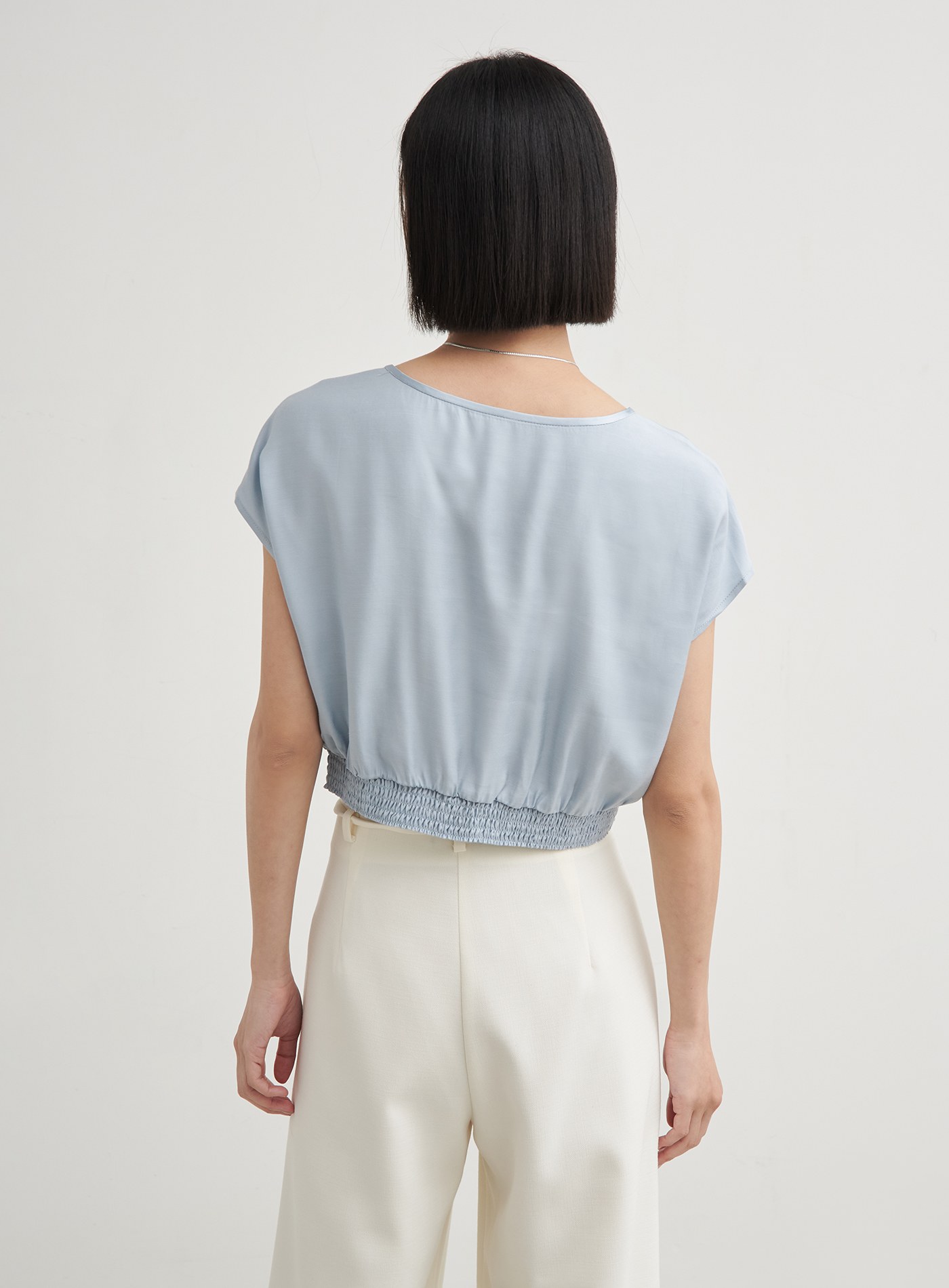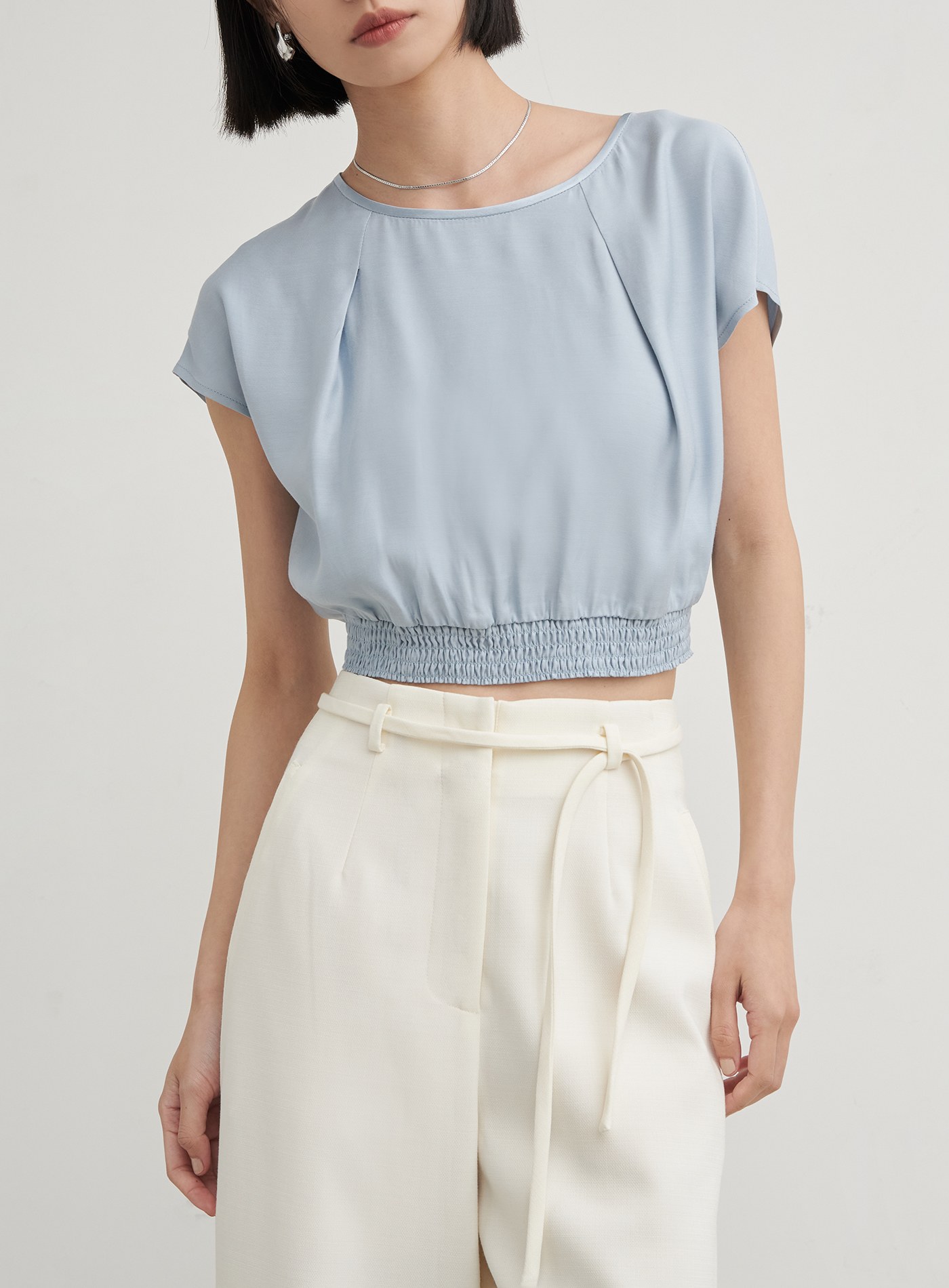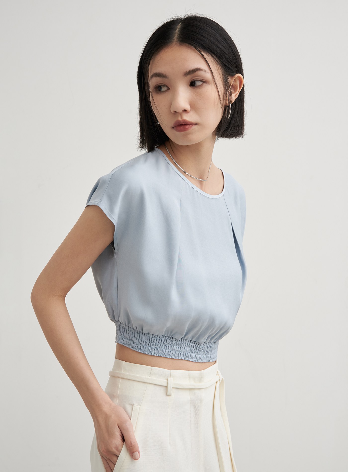 - 圓領落肩上衣版型,落袖設計適當修飾手臂線條