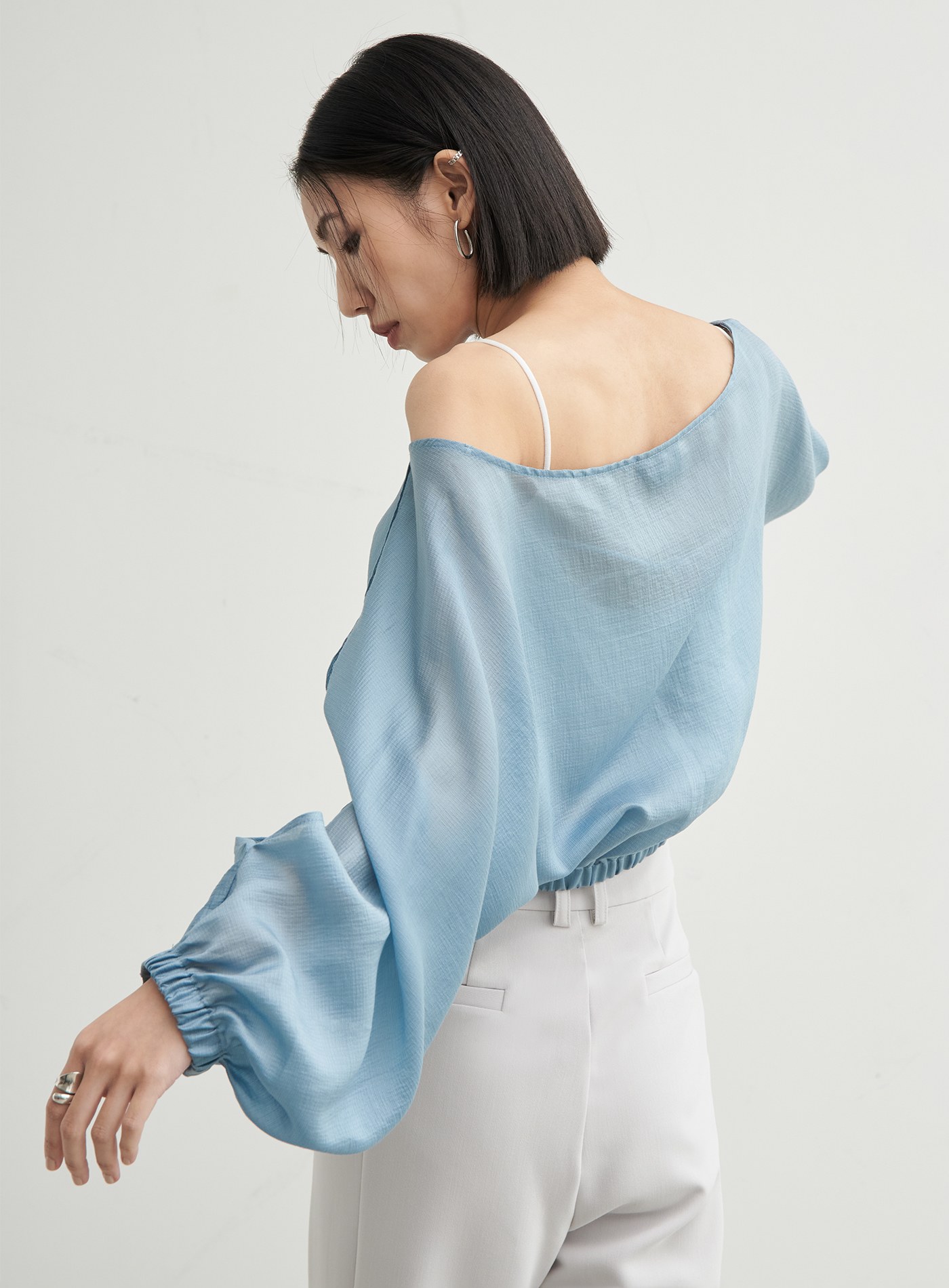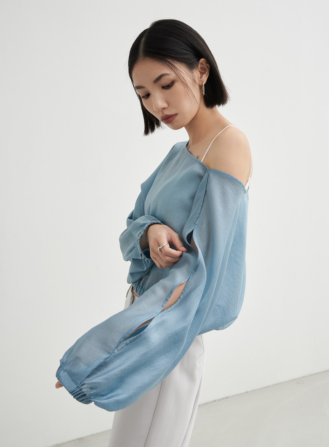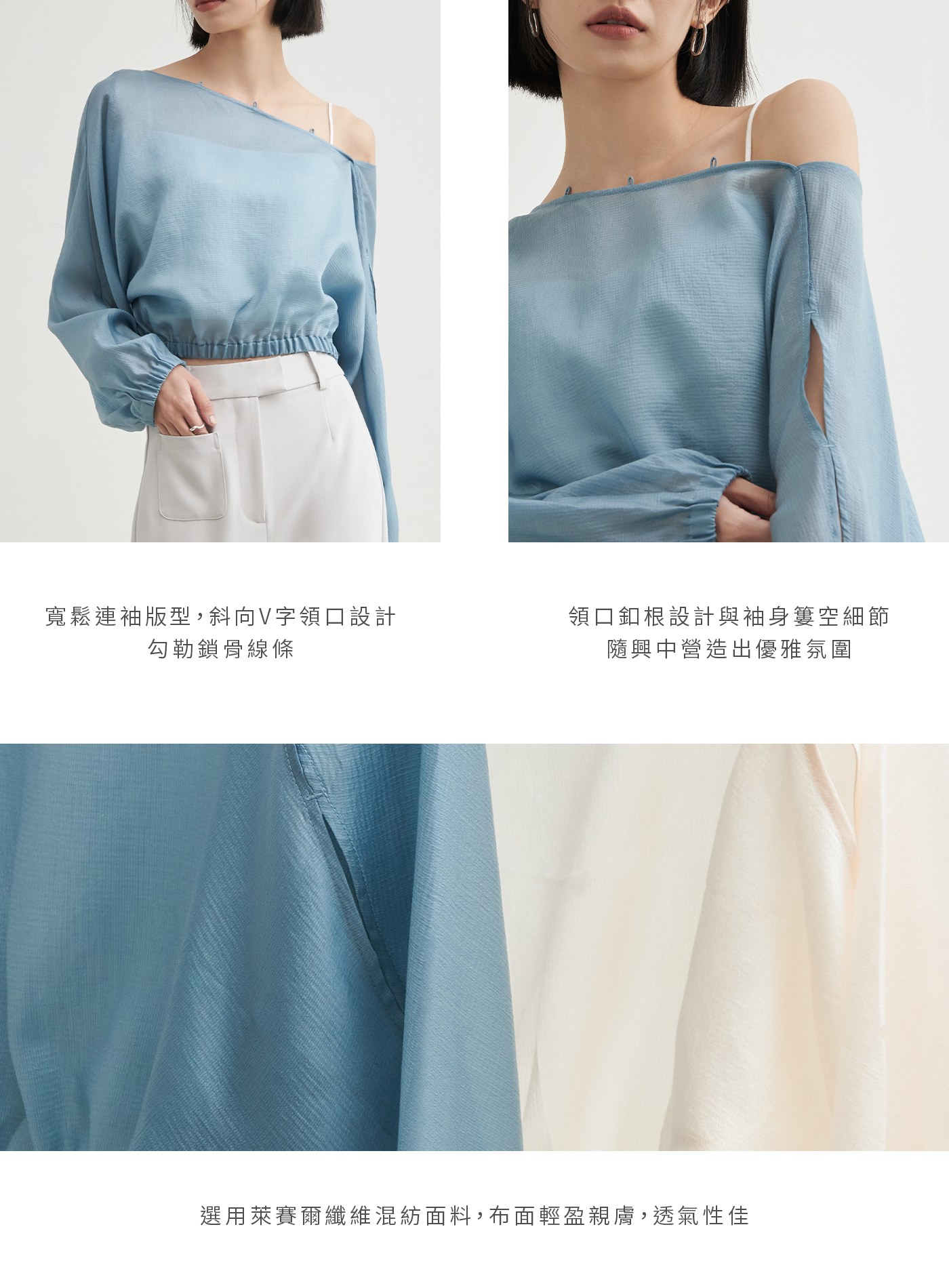 - 領口釦根設計與袖身簍空細節,隨興中營造出優雅氛圍