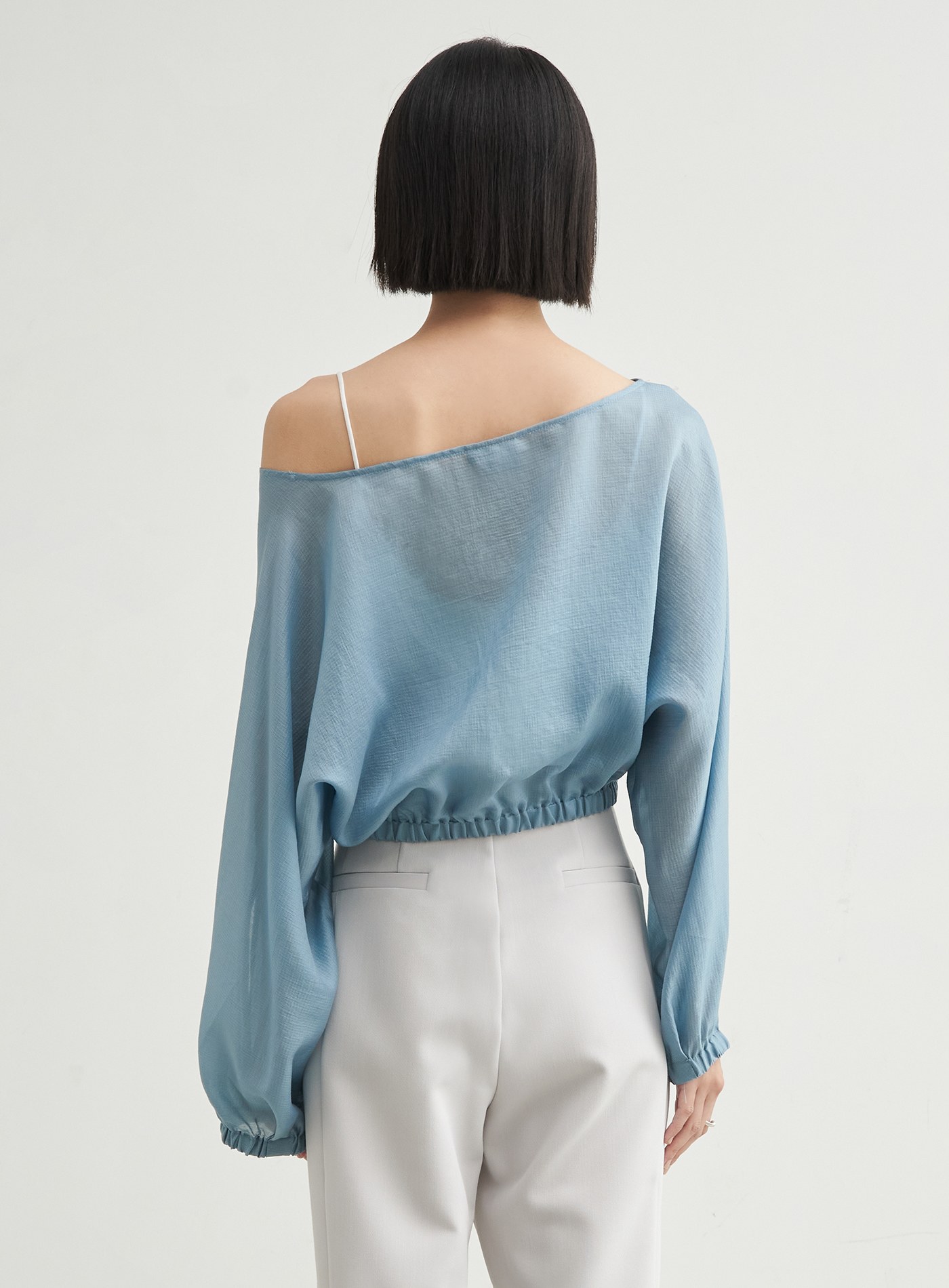 - 寬鬆連袖版型,斜向V字領口設計,勾勒鎖骨線條