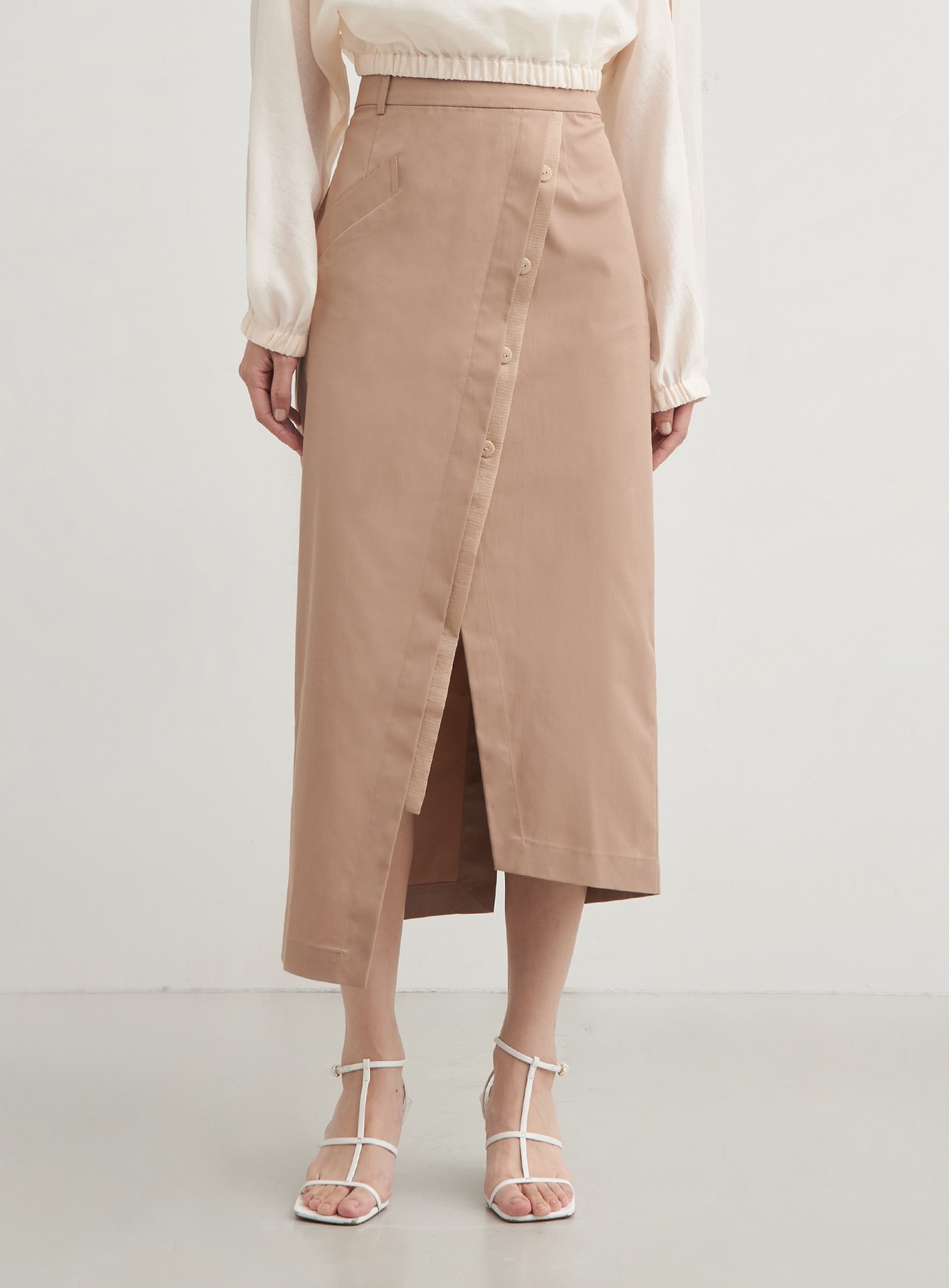 - 前身裝飾排釦細節/後腰鬆緊/側邊隱形拉鍊