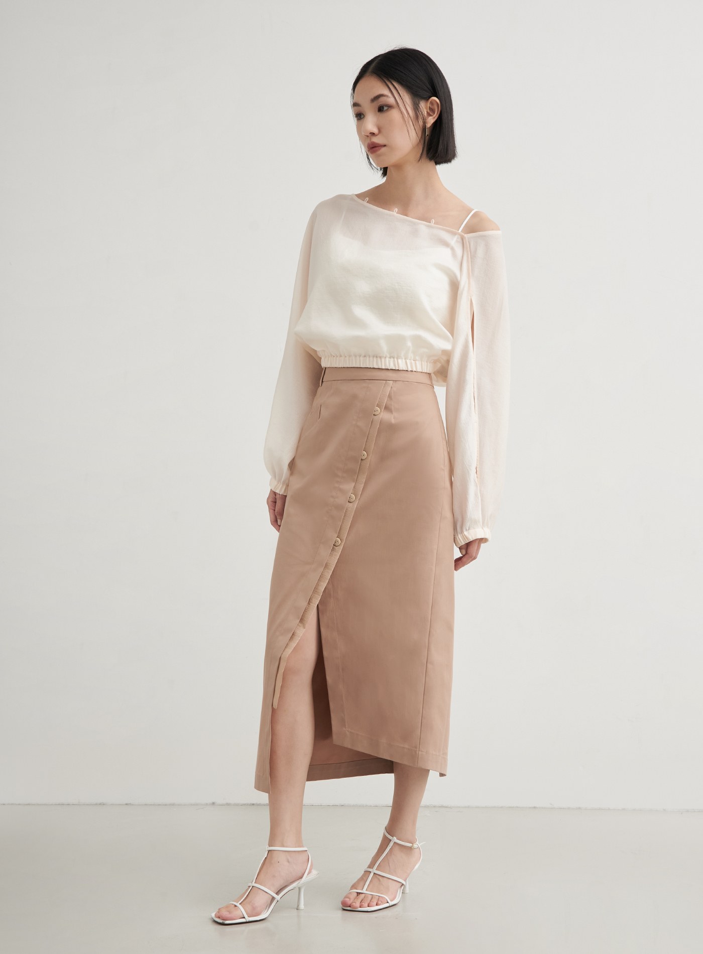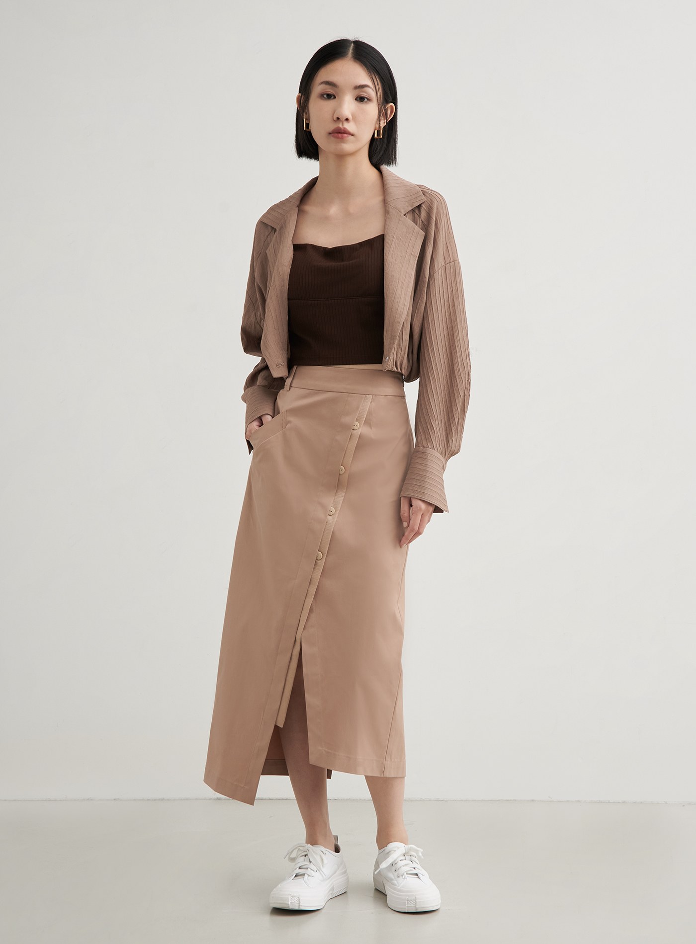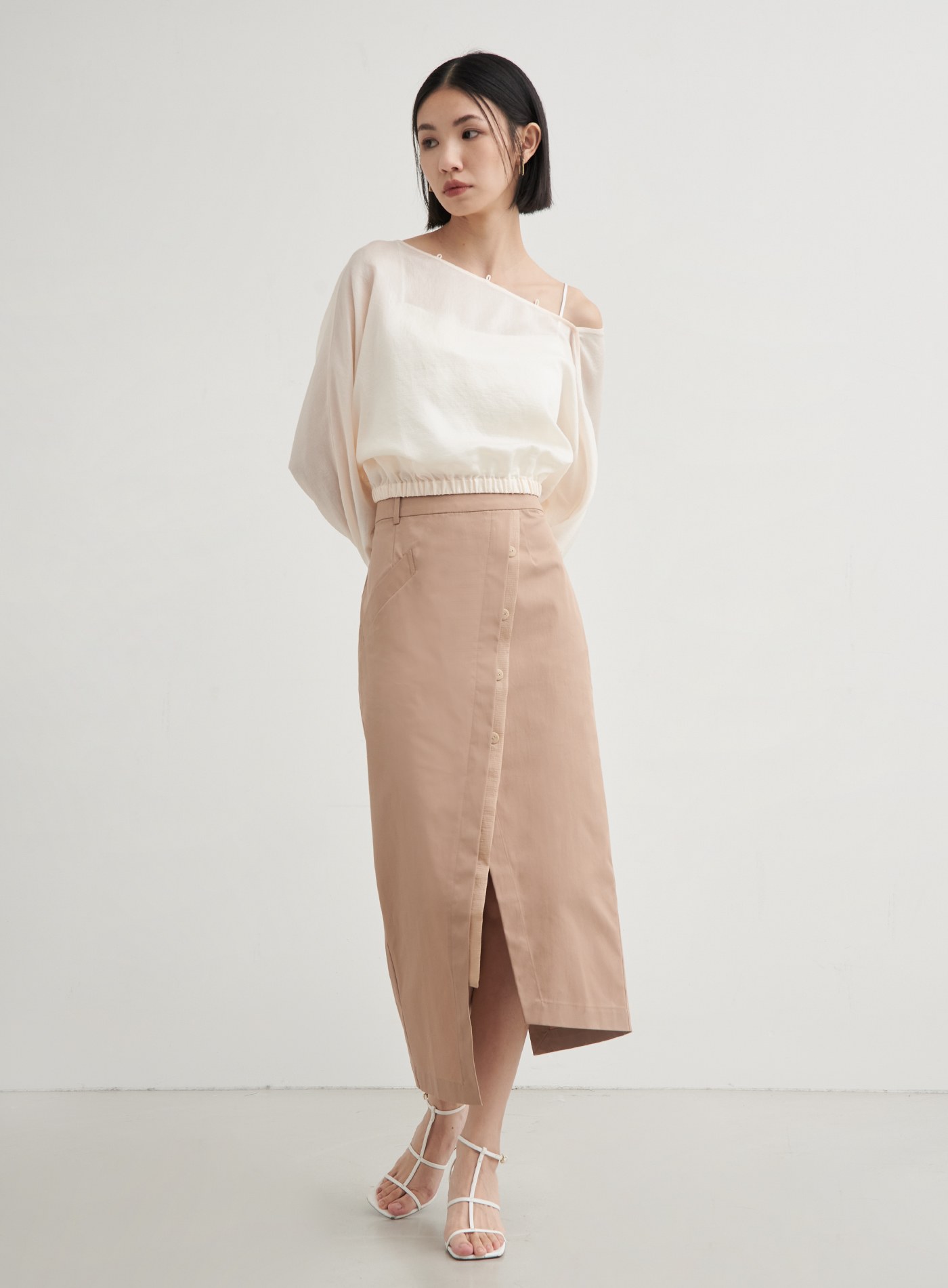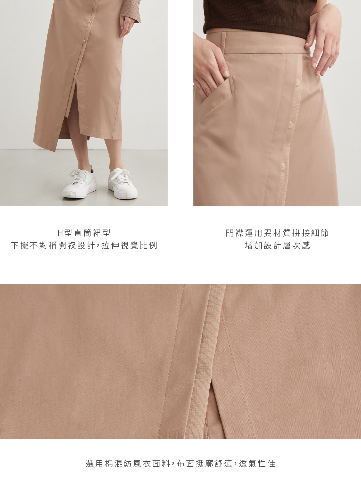 - H型直筒裙型,下擺不對稱開衩設計,拉伸視覺比例