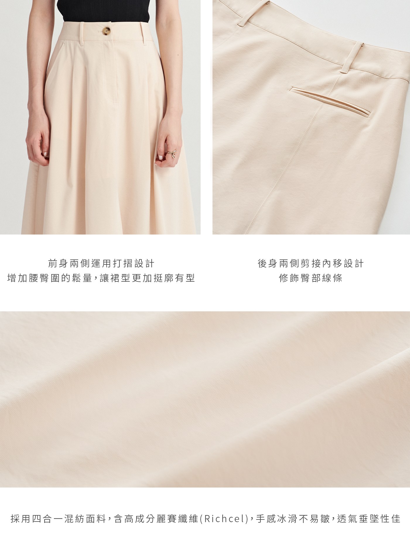 - 前身兩側運用打摺設計,增加腰臀圍的鬆量,讓裙型更加挺廓有型