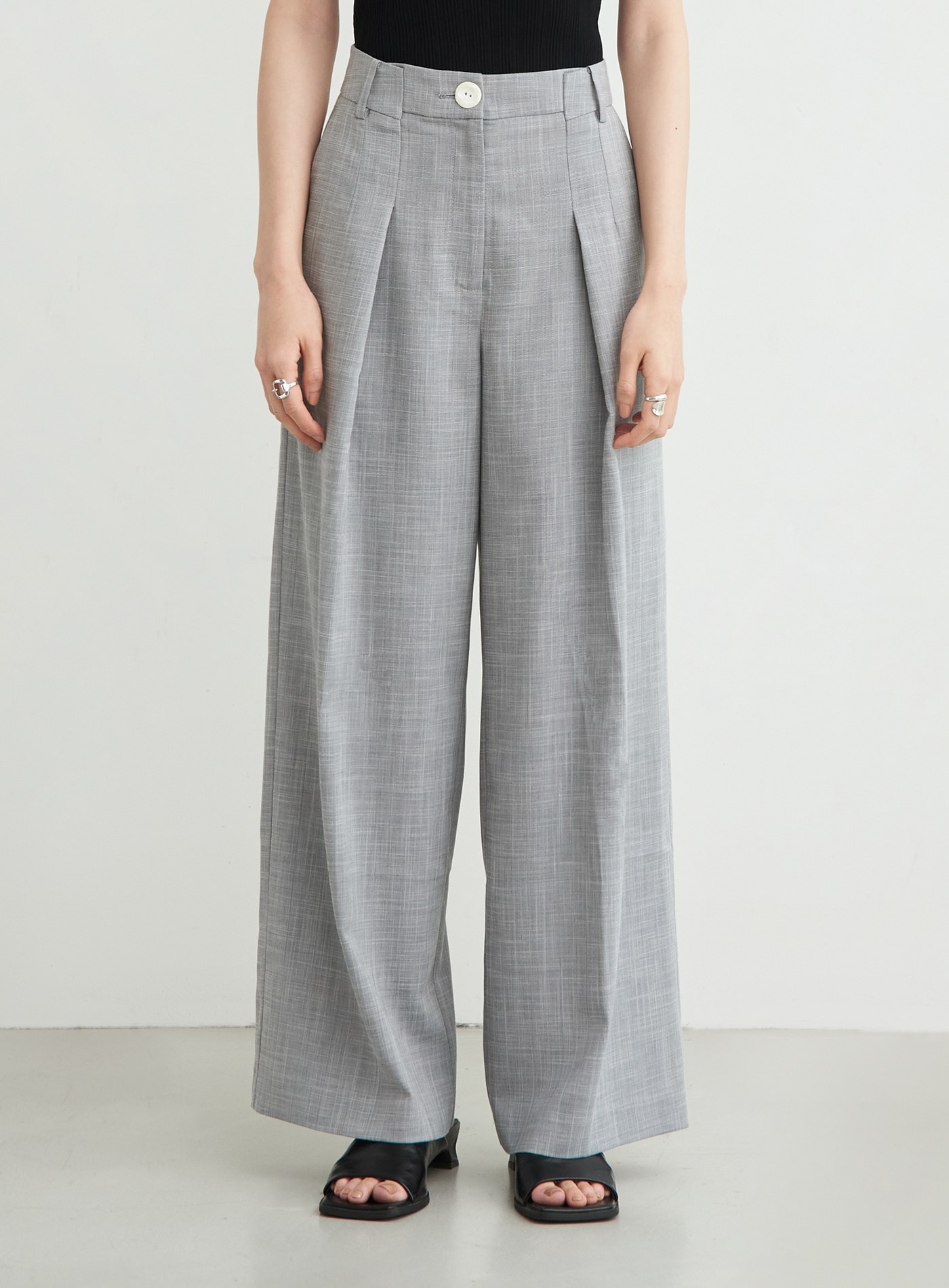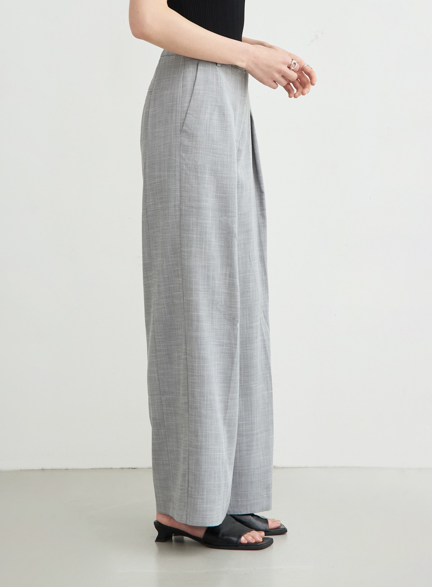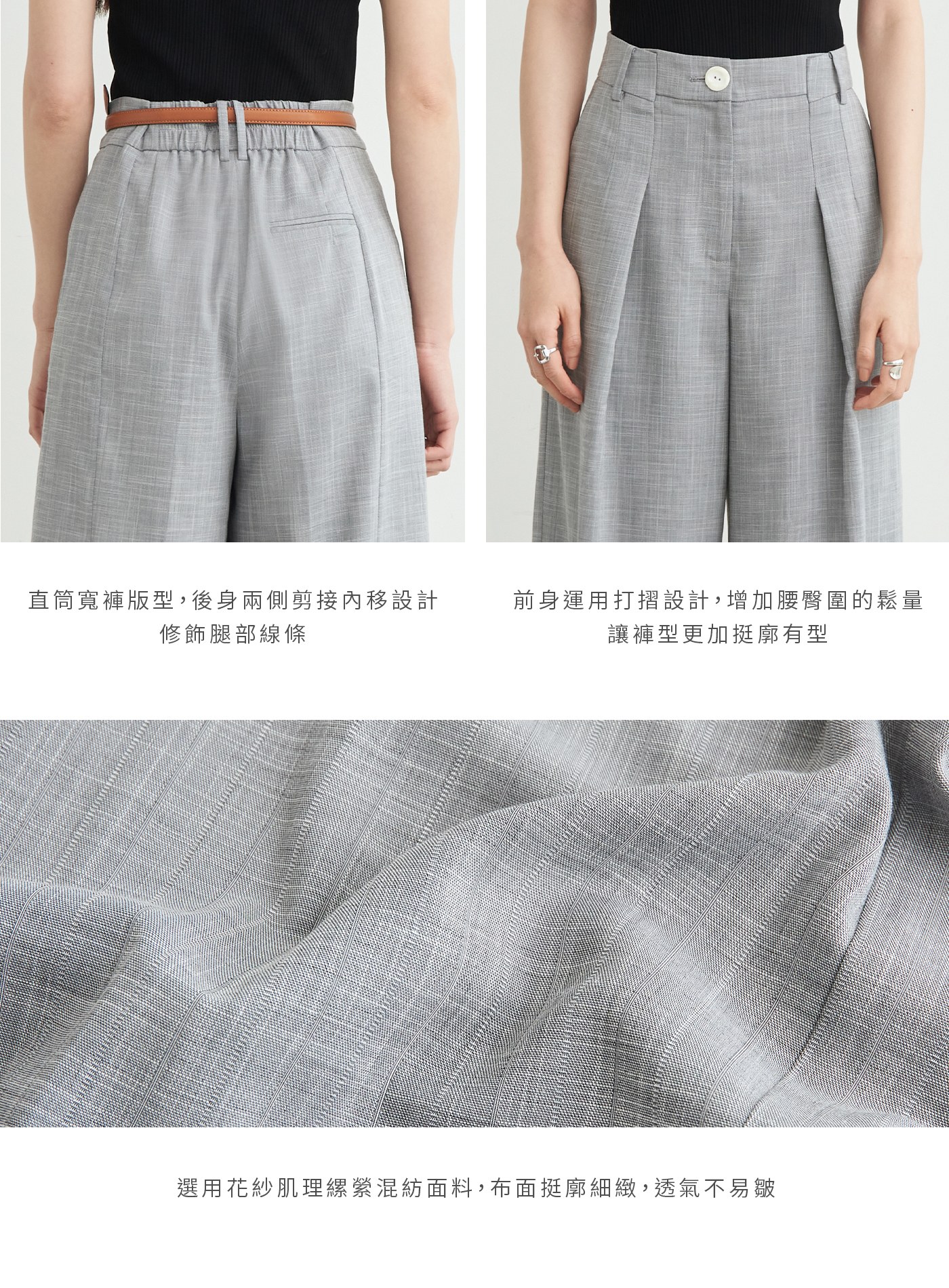 - 直筒寬褲版型,後身兩側剪接內移設計,修飾腿部線條
