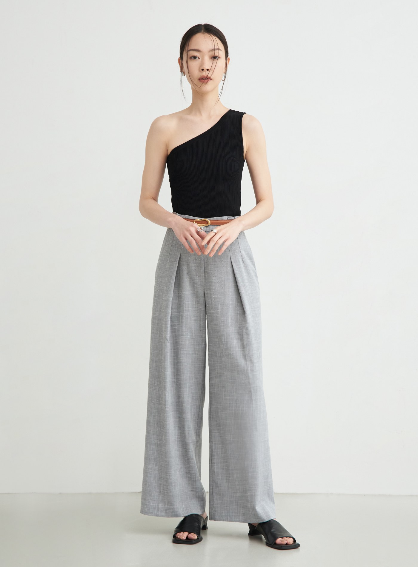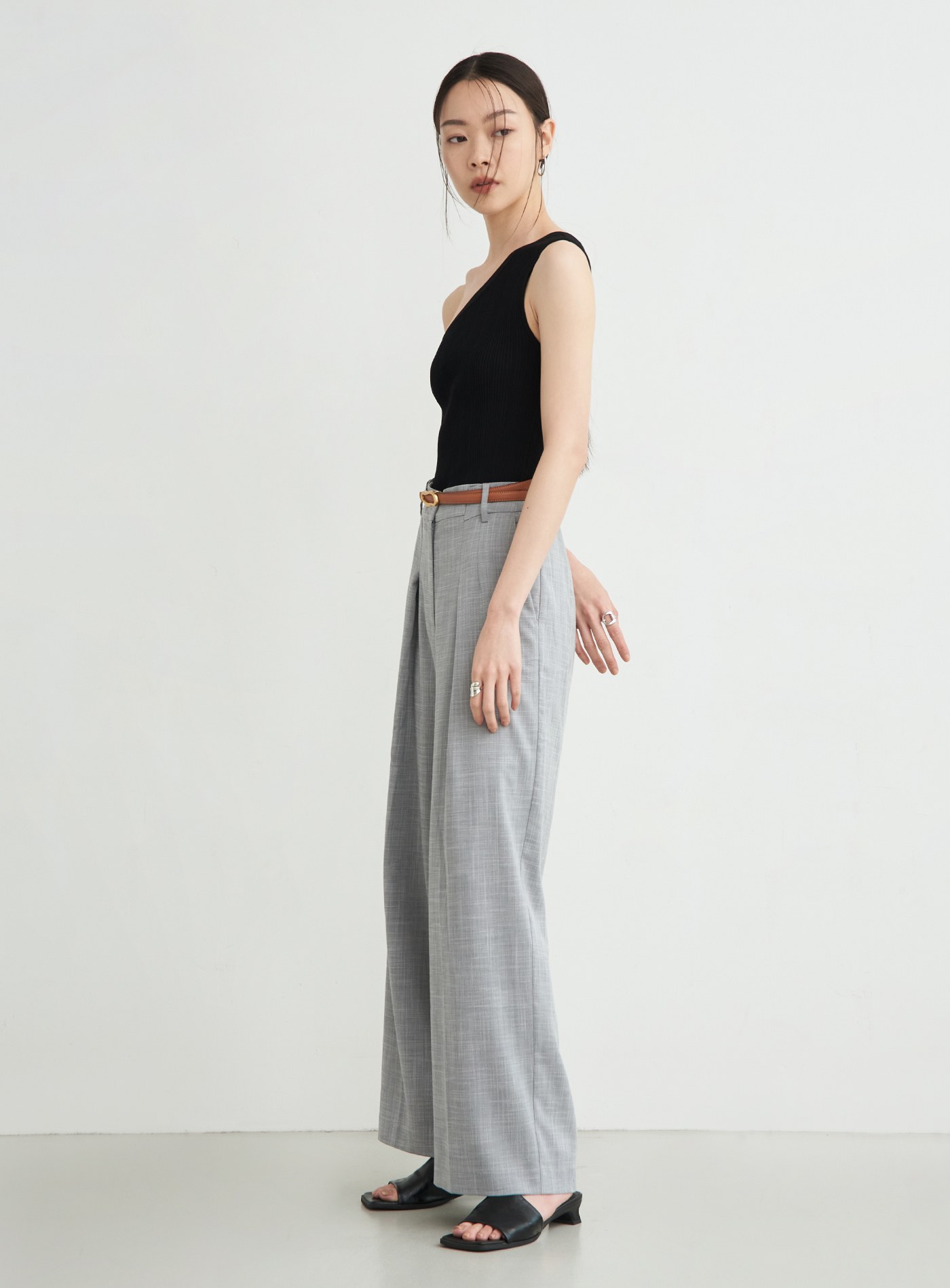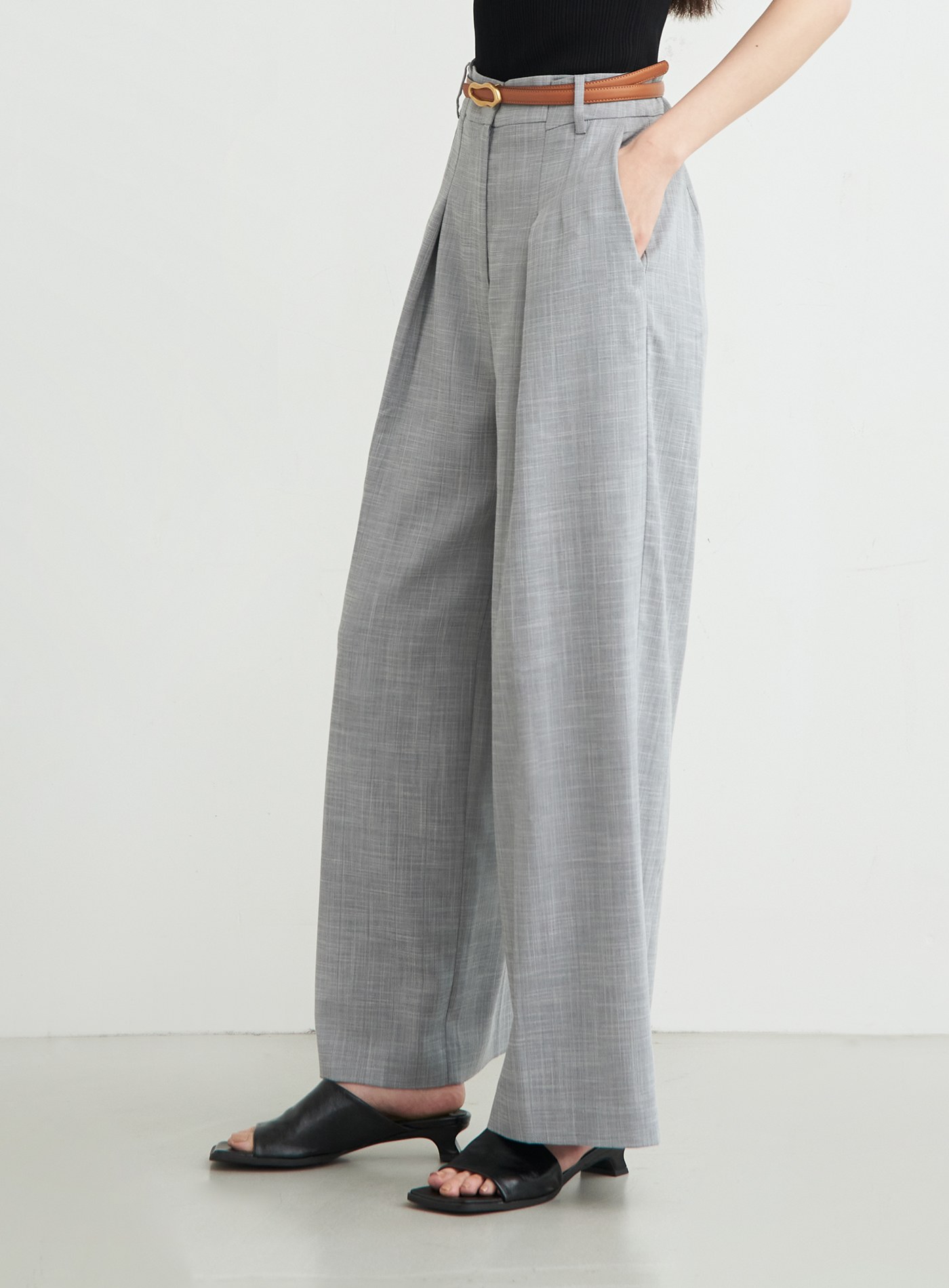 - 直筒寬褲版型,後身兩側剪接內移設計,修飾腿部線條