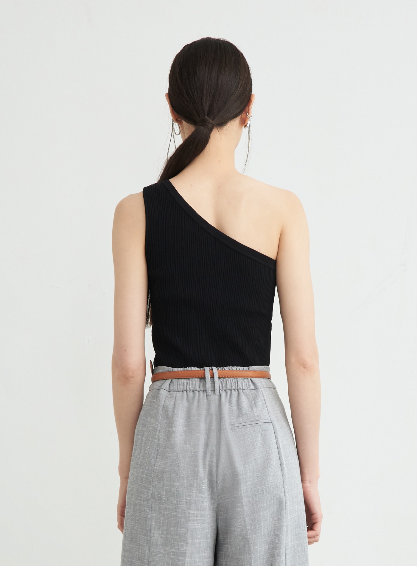 - 腰頭不對稱摺疊設計/後腰鬆緊/後身雙脣口袋細節