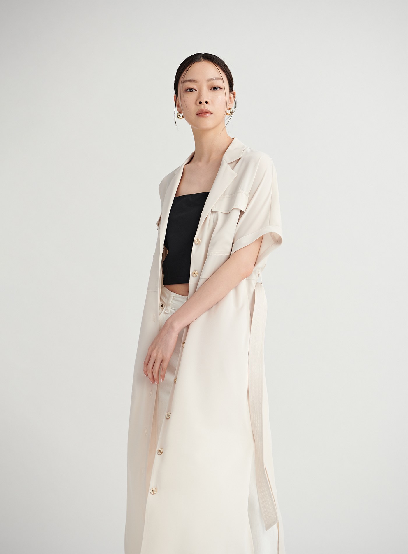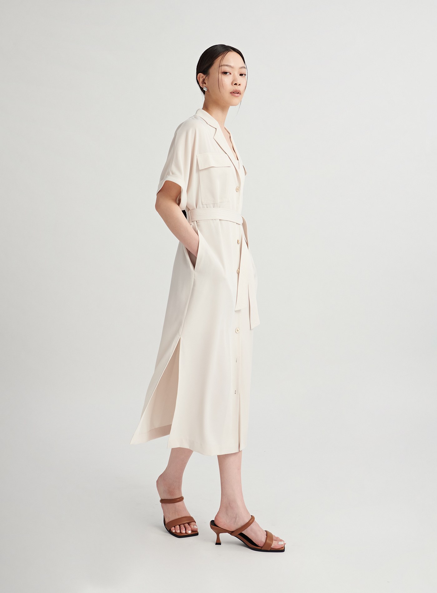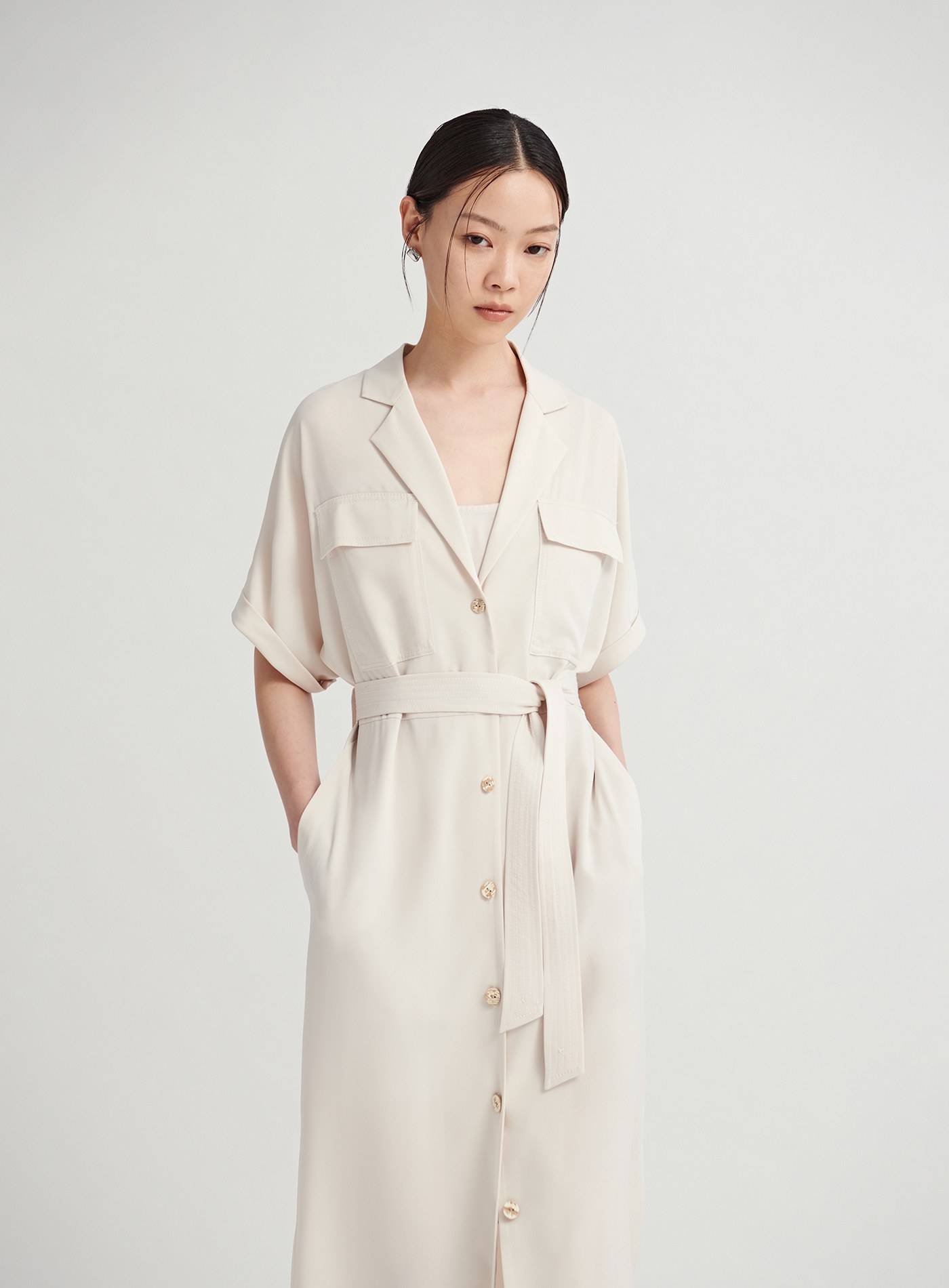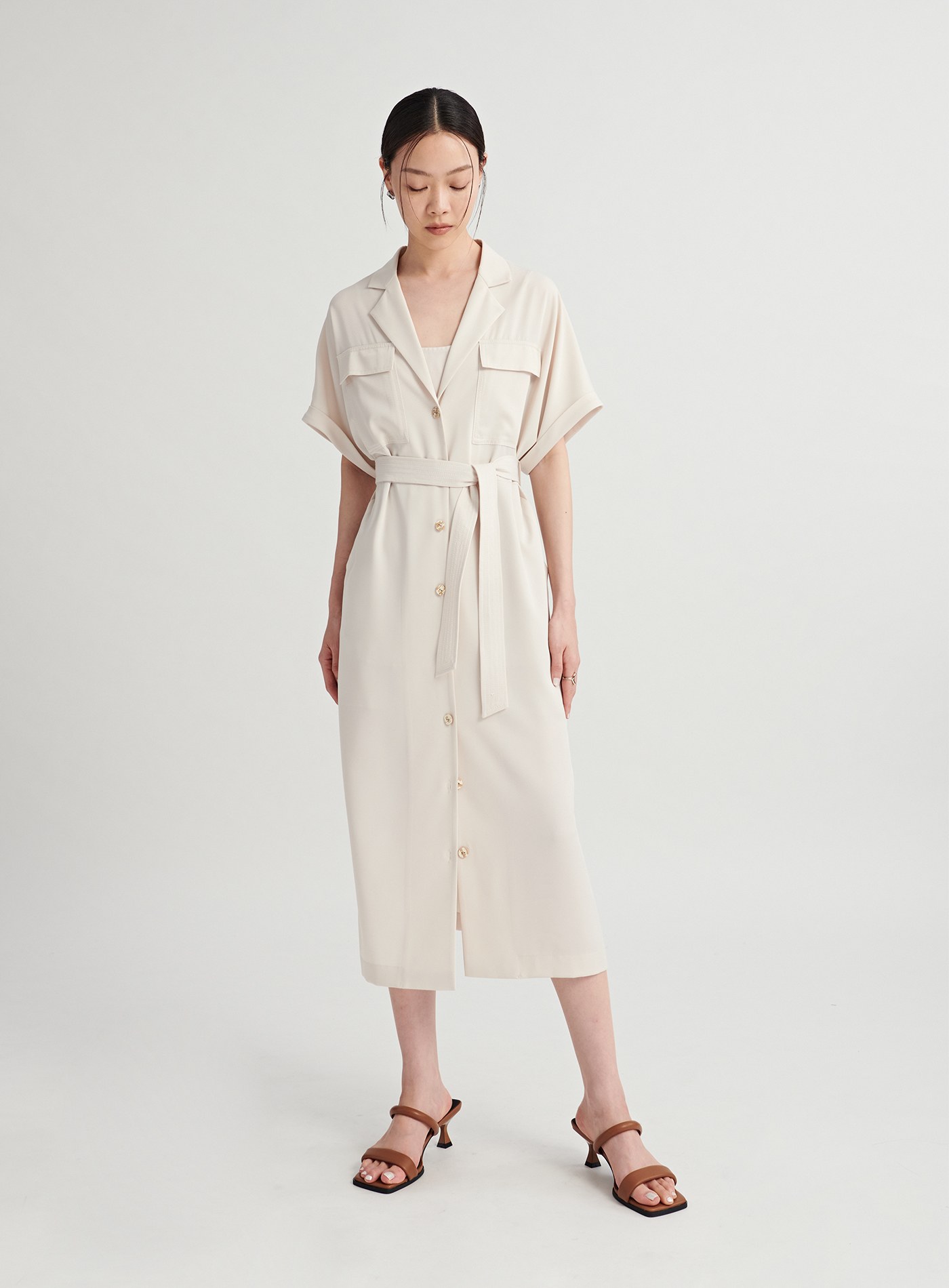 - 直身寬鬆洋裝剪裁,胸前口袋與腰帶壓粗線細節,增添率性感