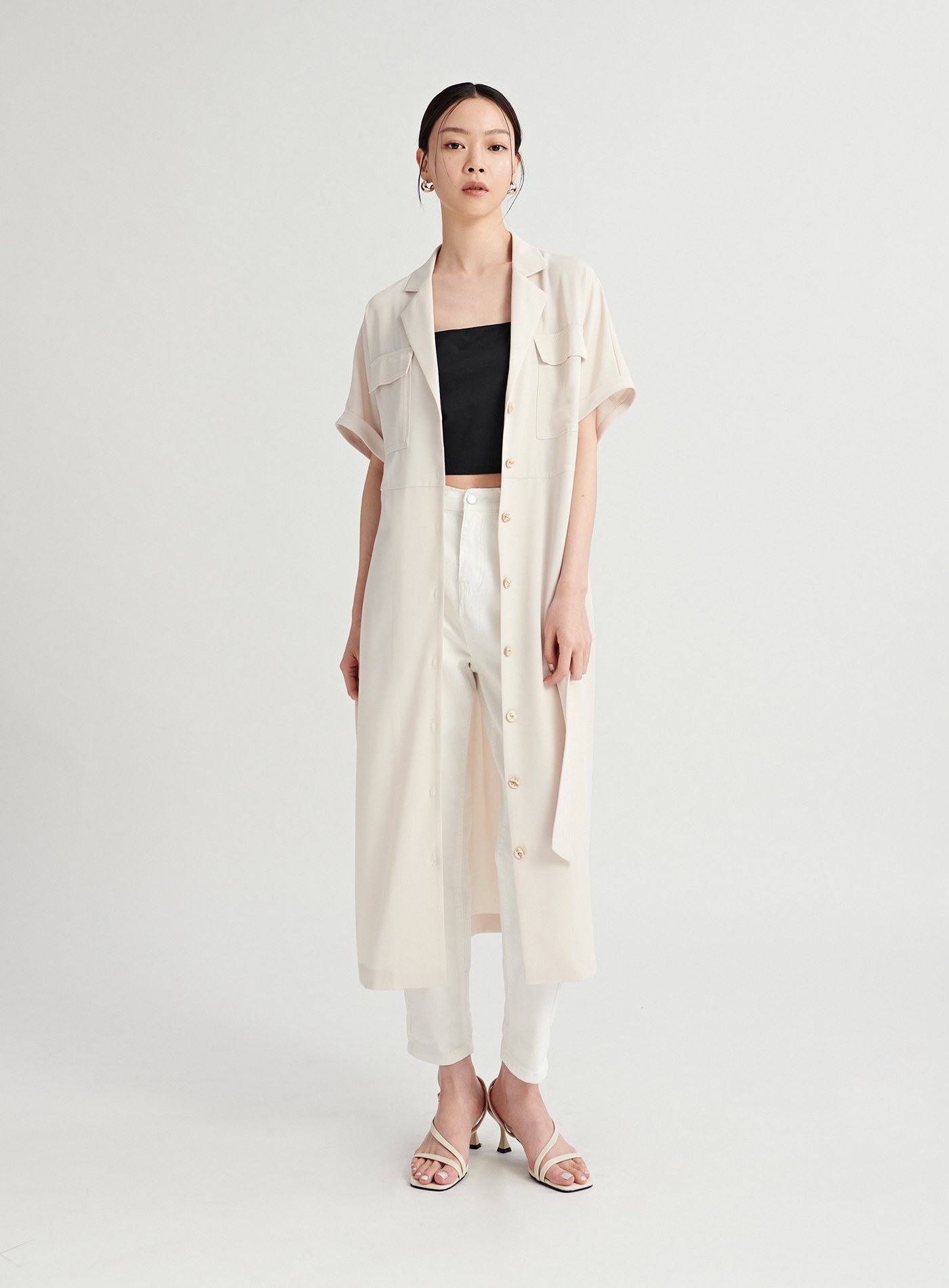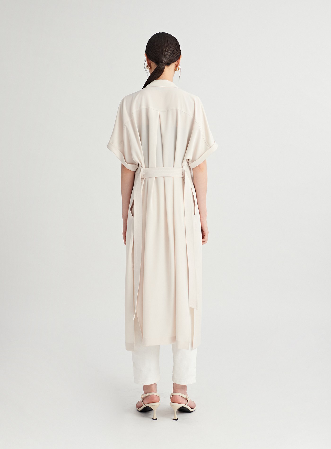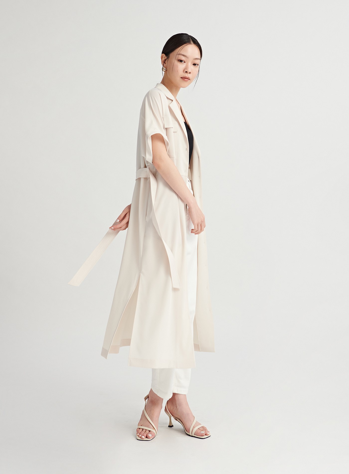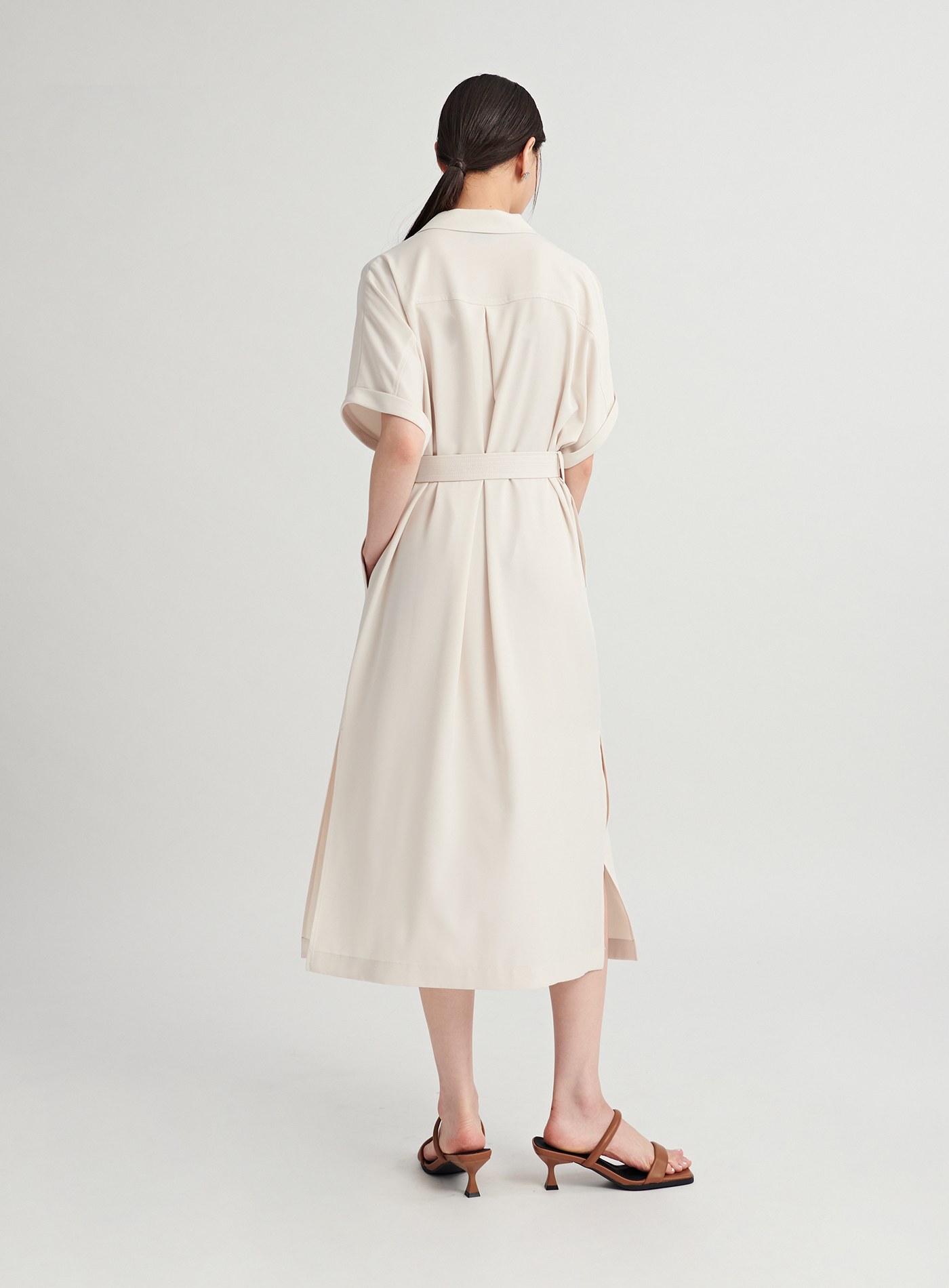 - 直身寬鬆洋裝剪裁,胸前口袋與腰帶壓粗線細節,增添率性感