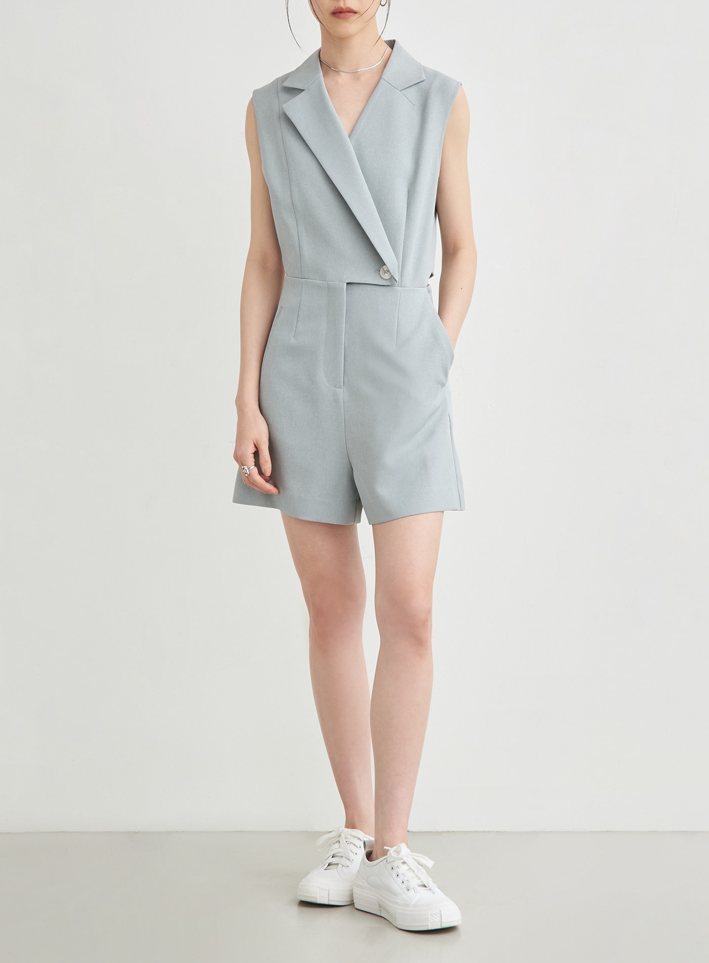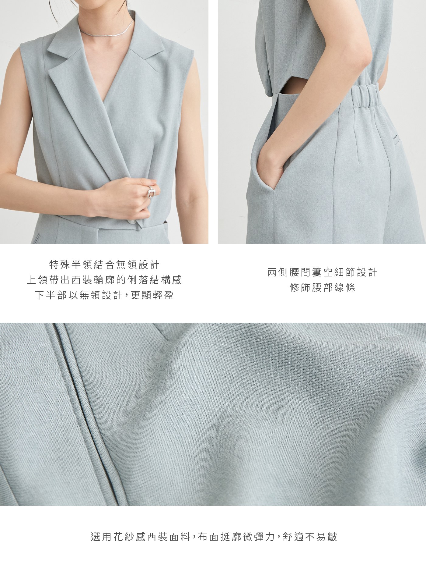 - 特殊半領結合無領設計,上領帶出西裝輪廓的俐落結構感,下半部以無領設計,更顯輕盈