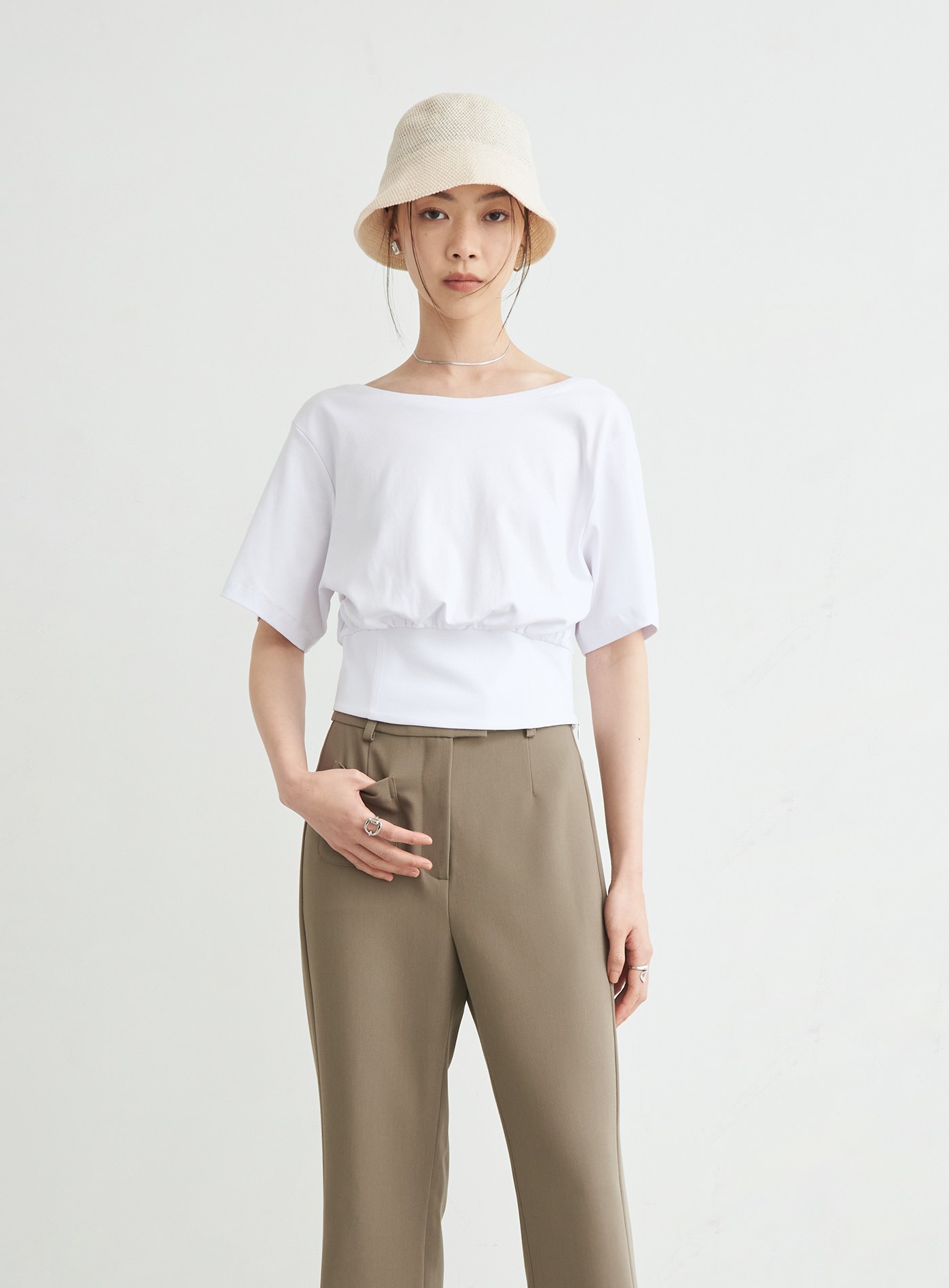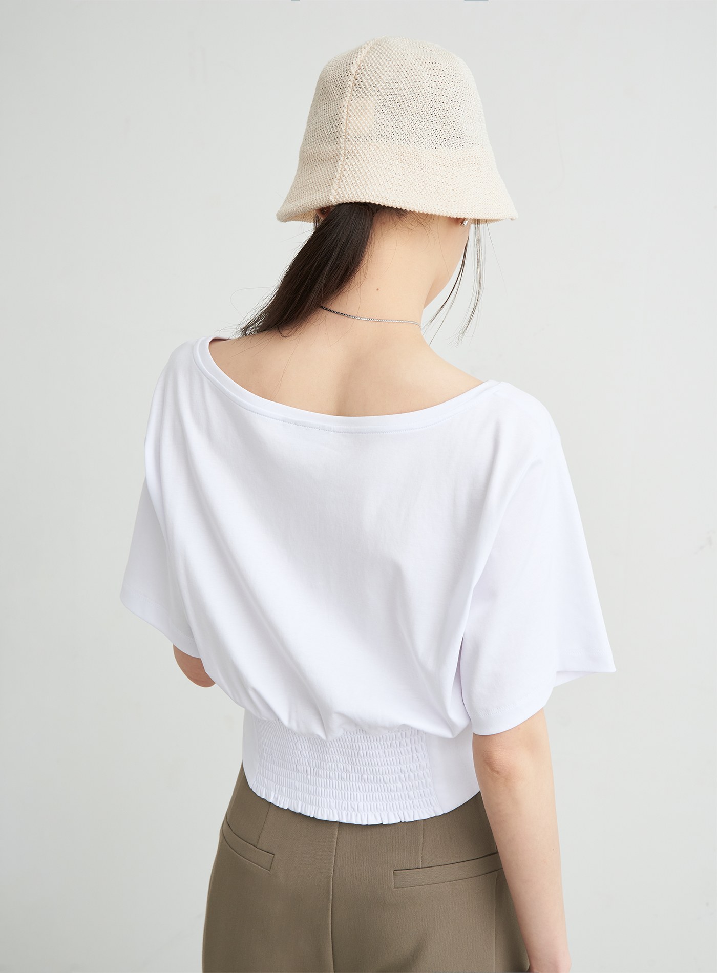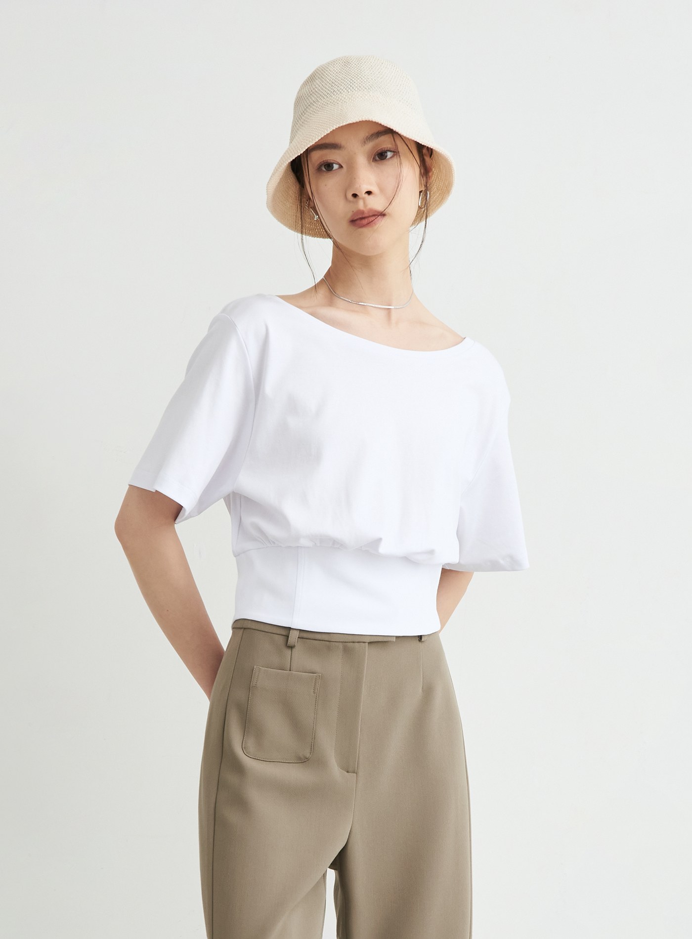- 寬鬆落肩TEE版型,領口以船型一字領,勾勒鎖骨線條
