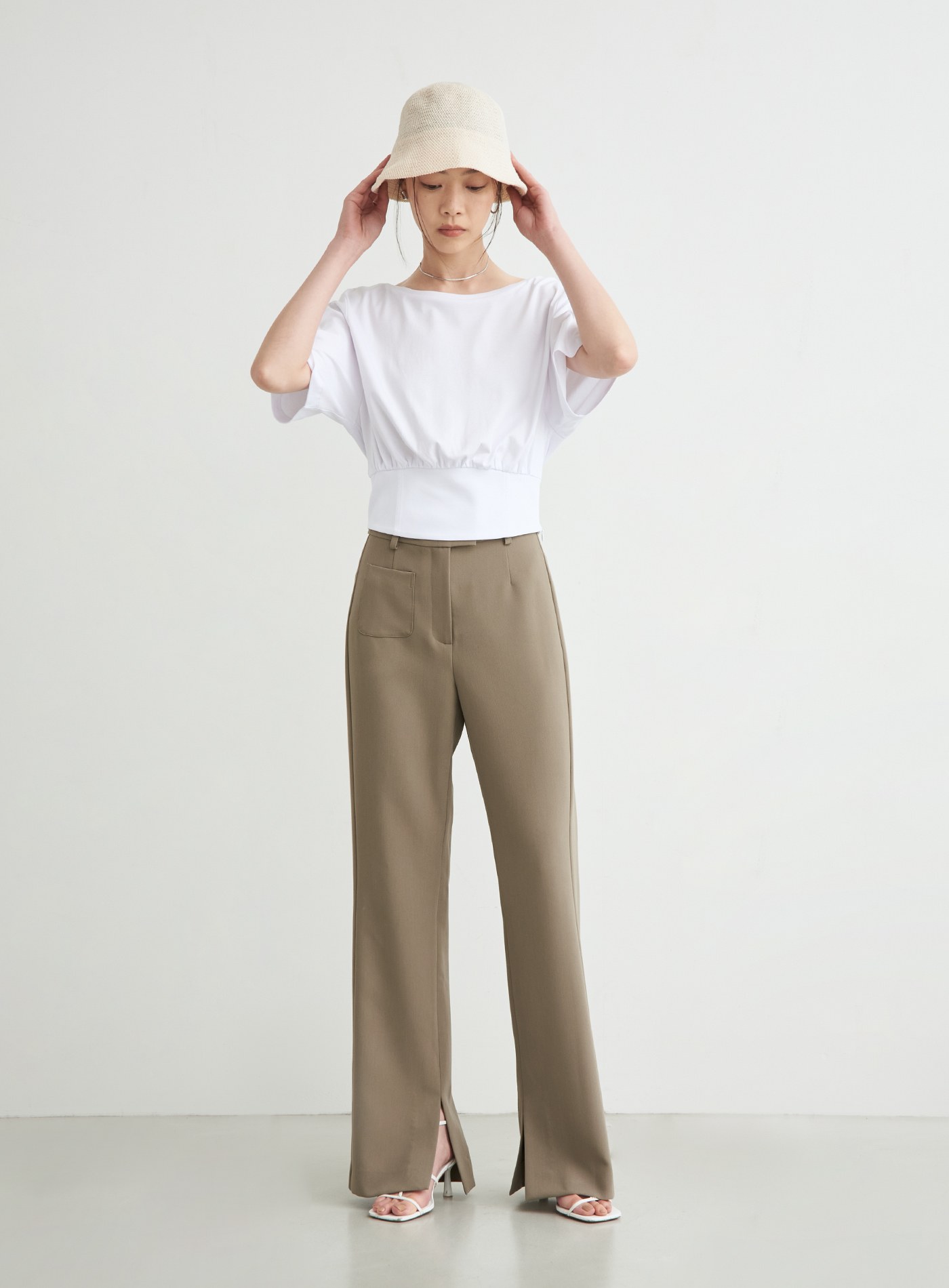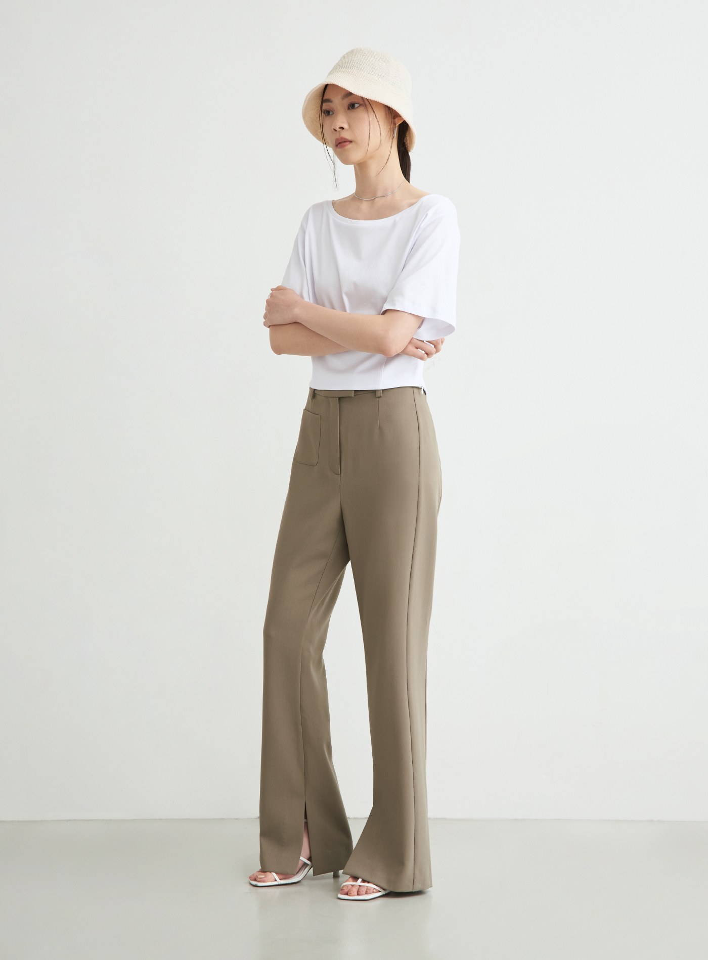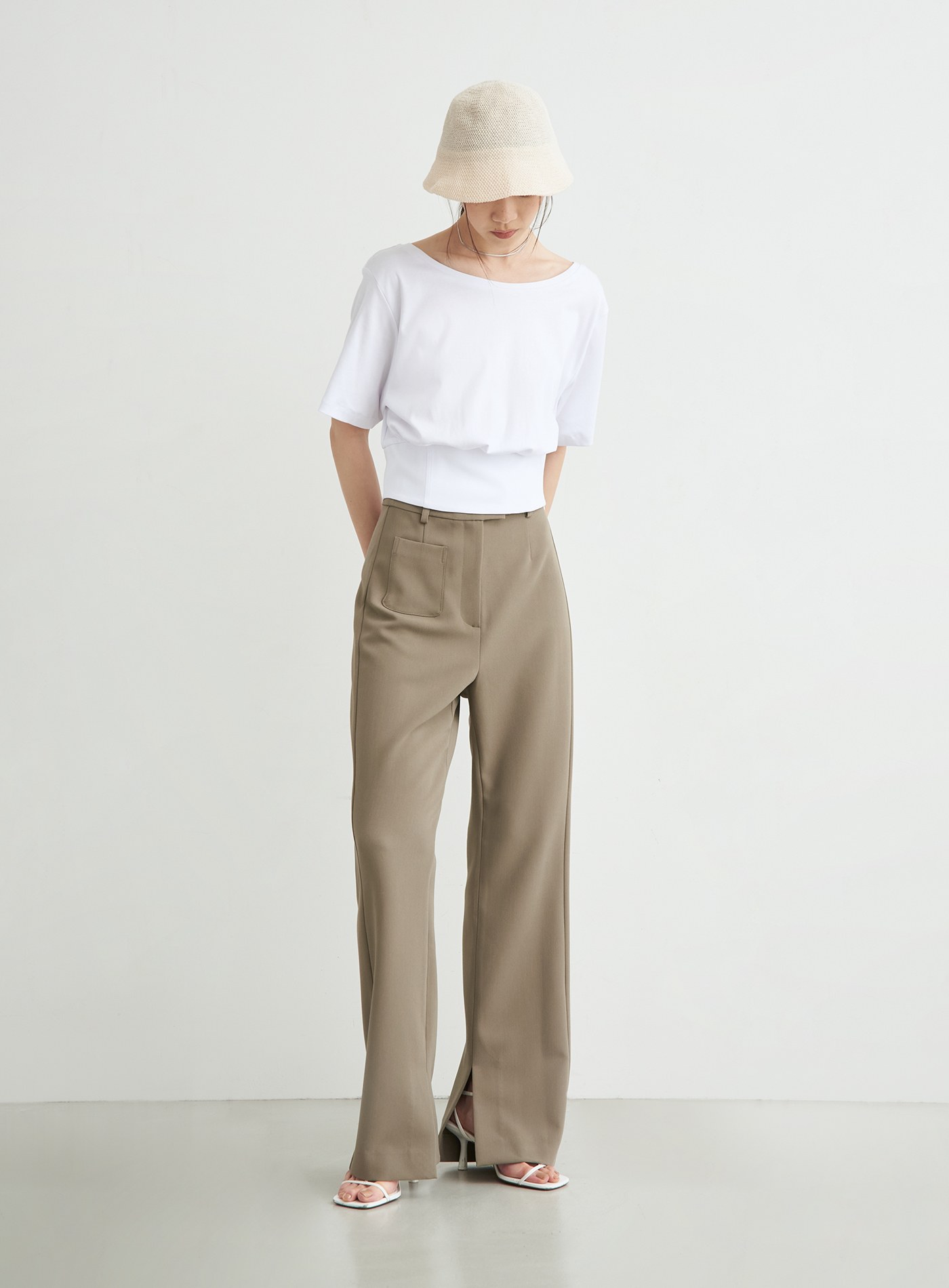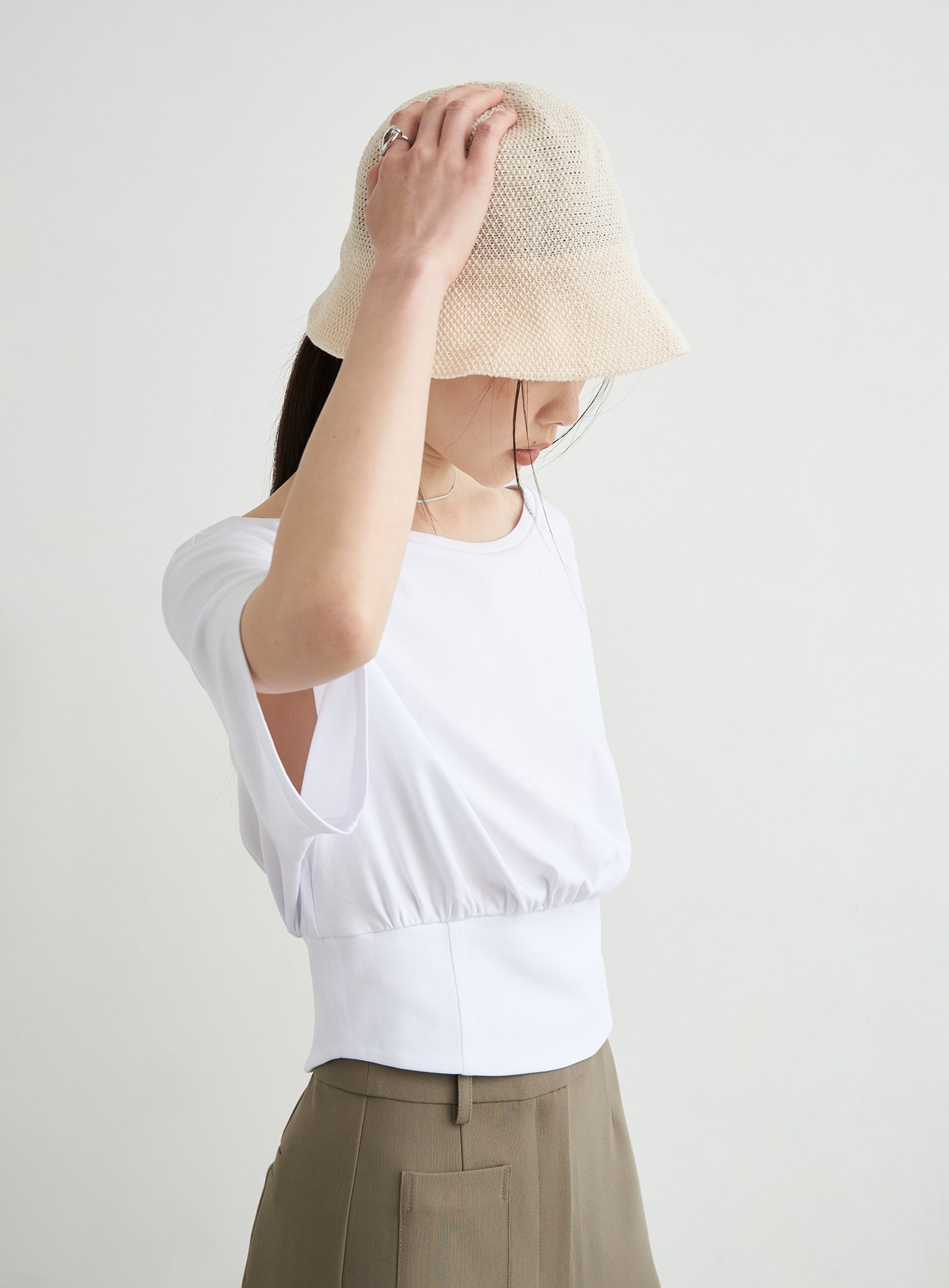 - 寬鬆落肩TEE版型,領口以船型一字領,勾勒鎖骨線條