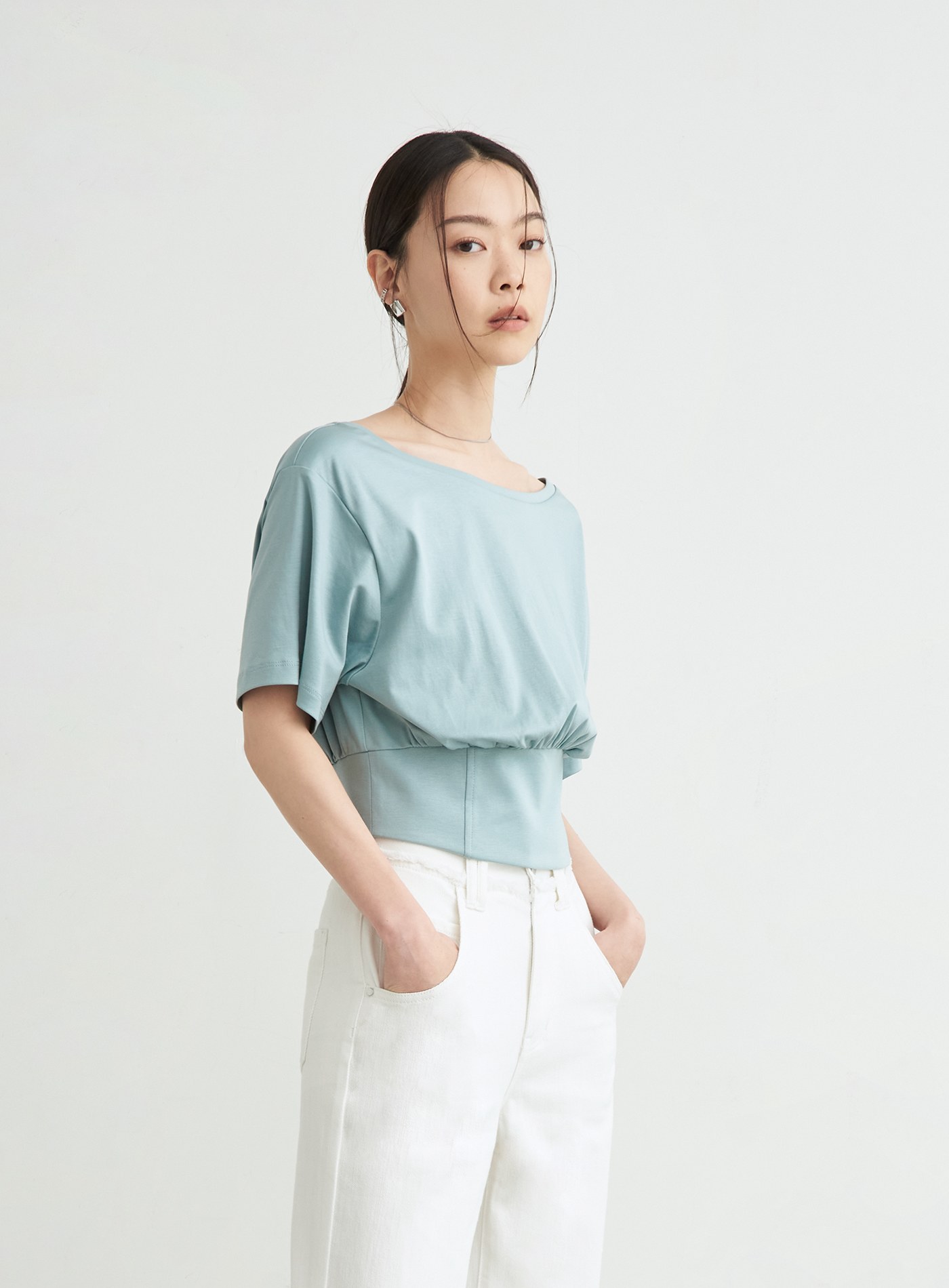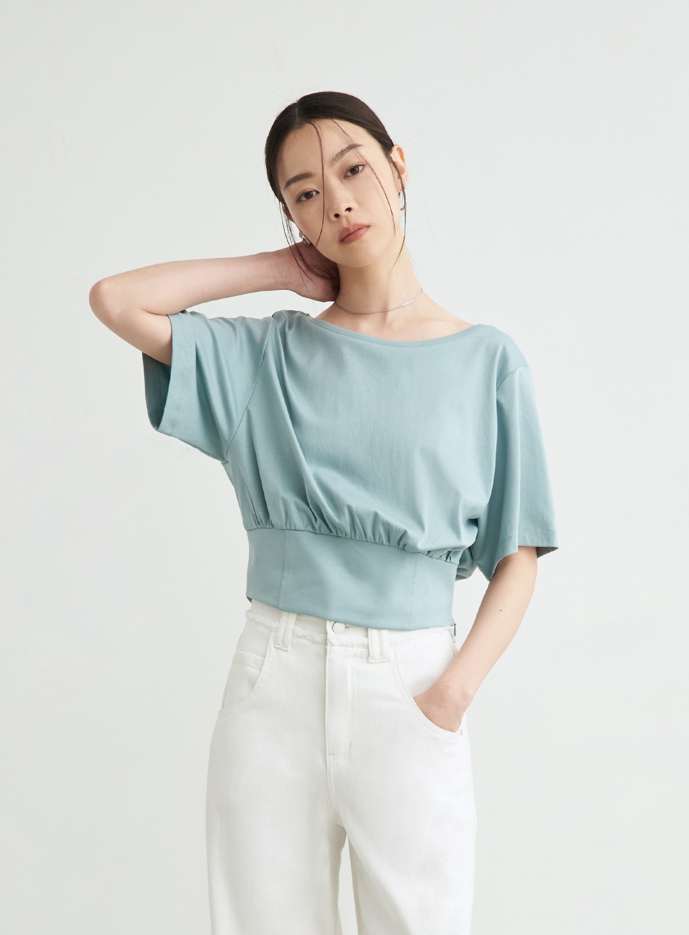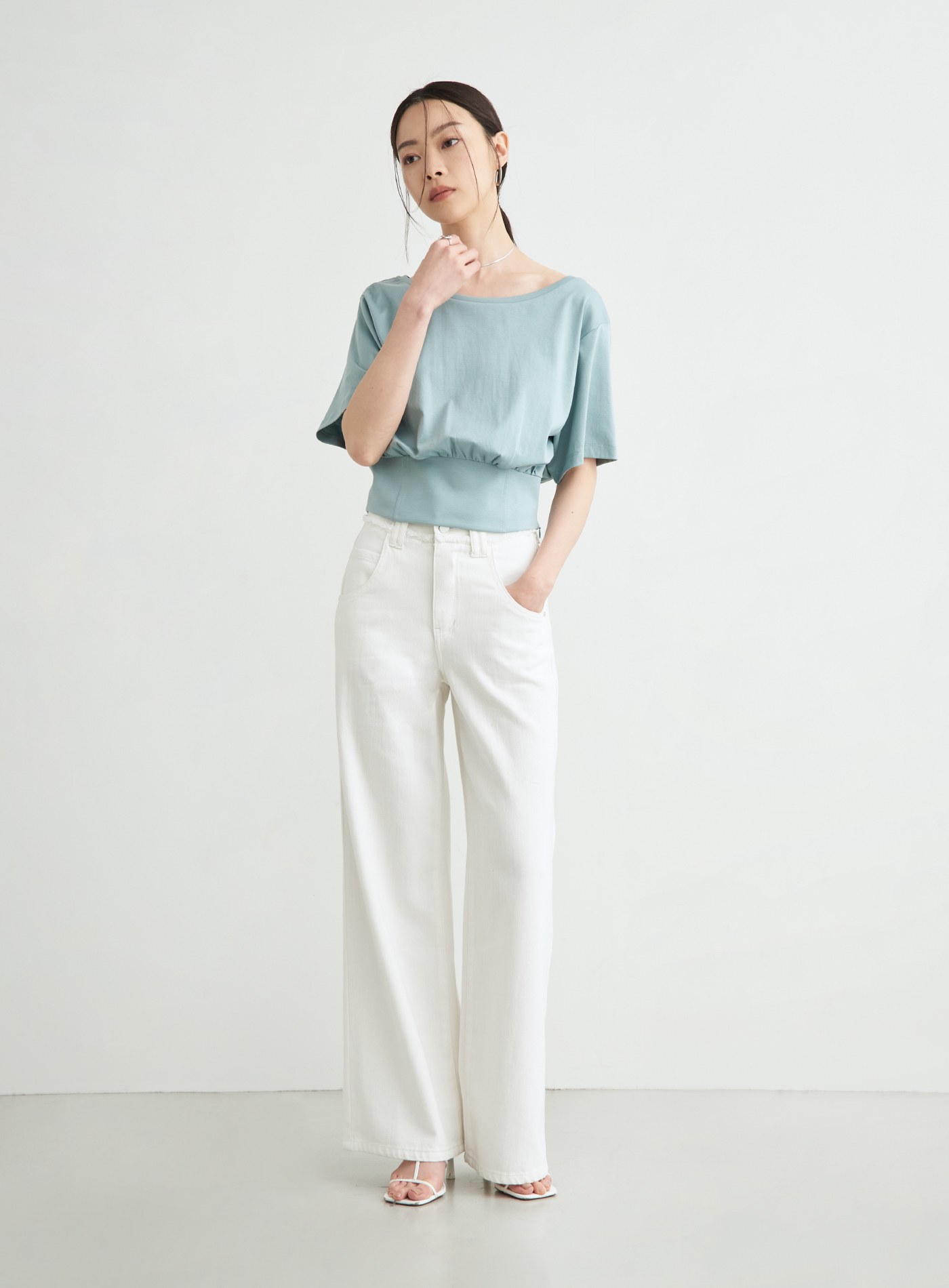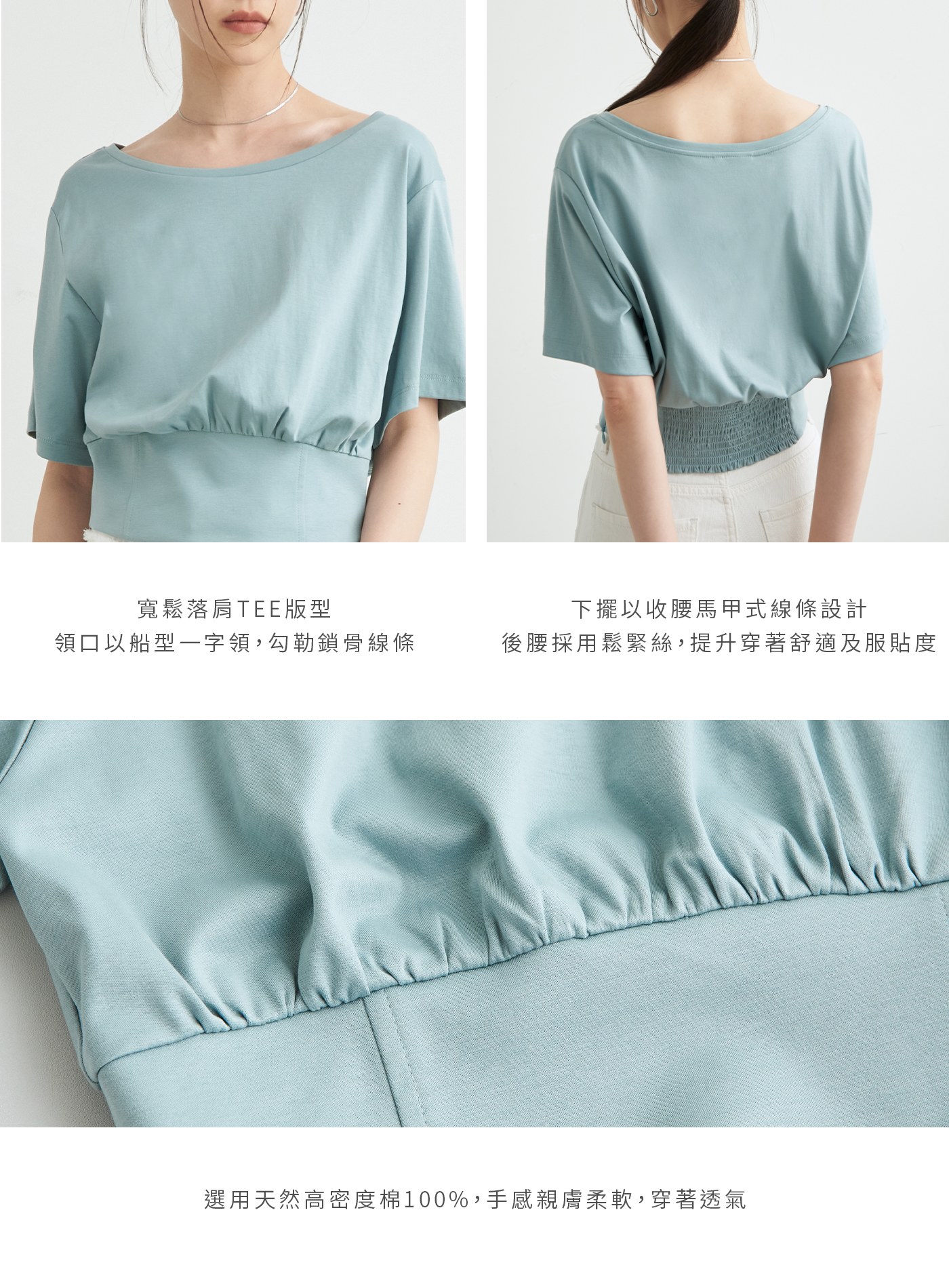 - 寬鬆落肩TEE版型,領口以船型一字領,勾勒鎖骨線條