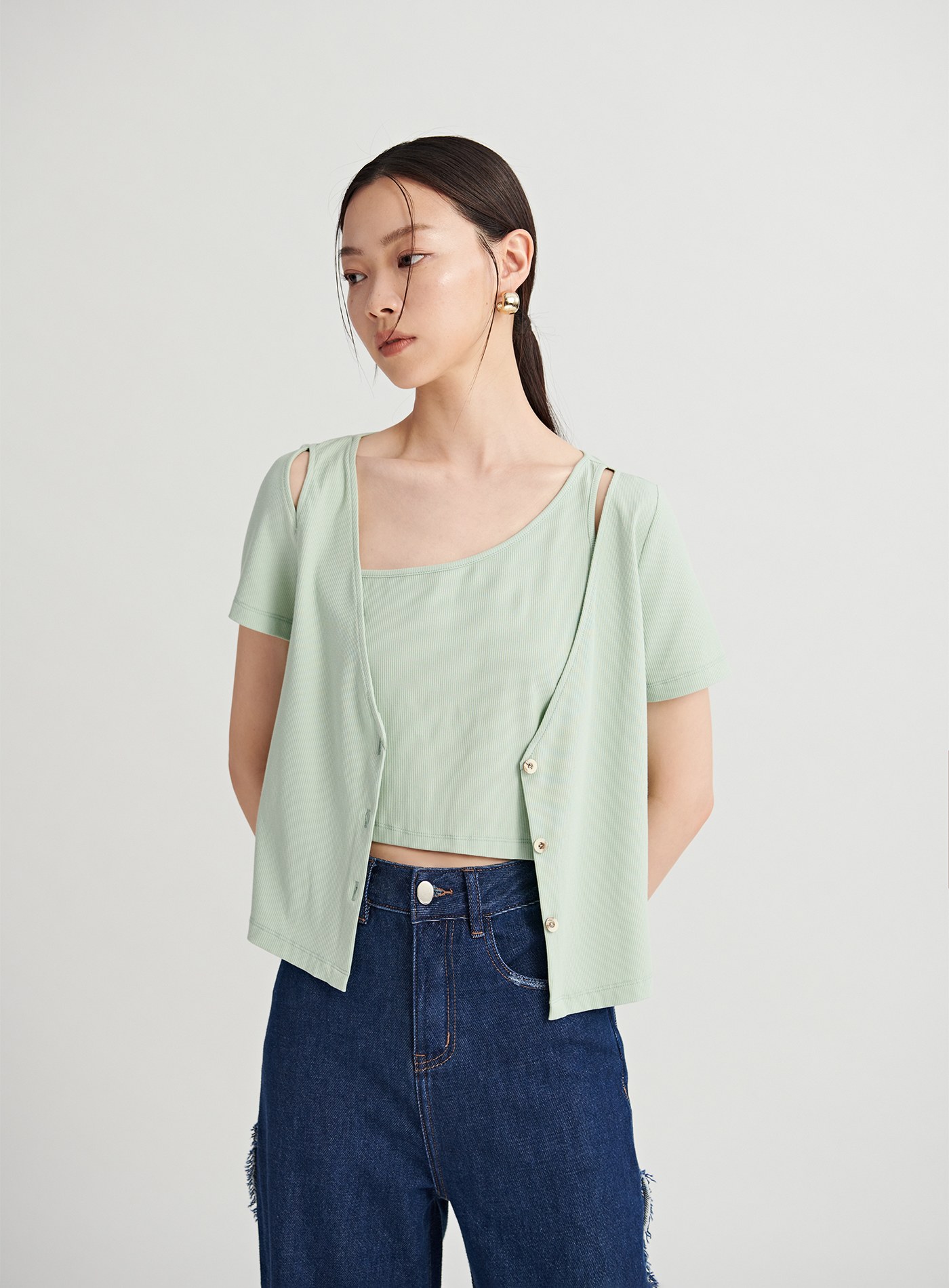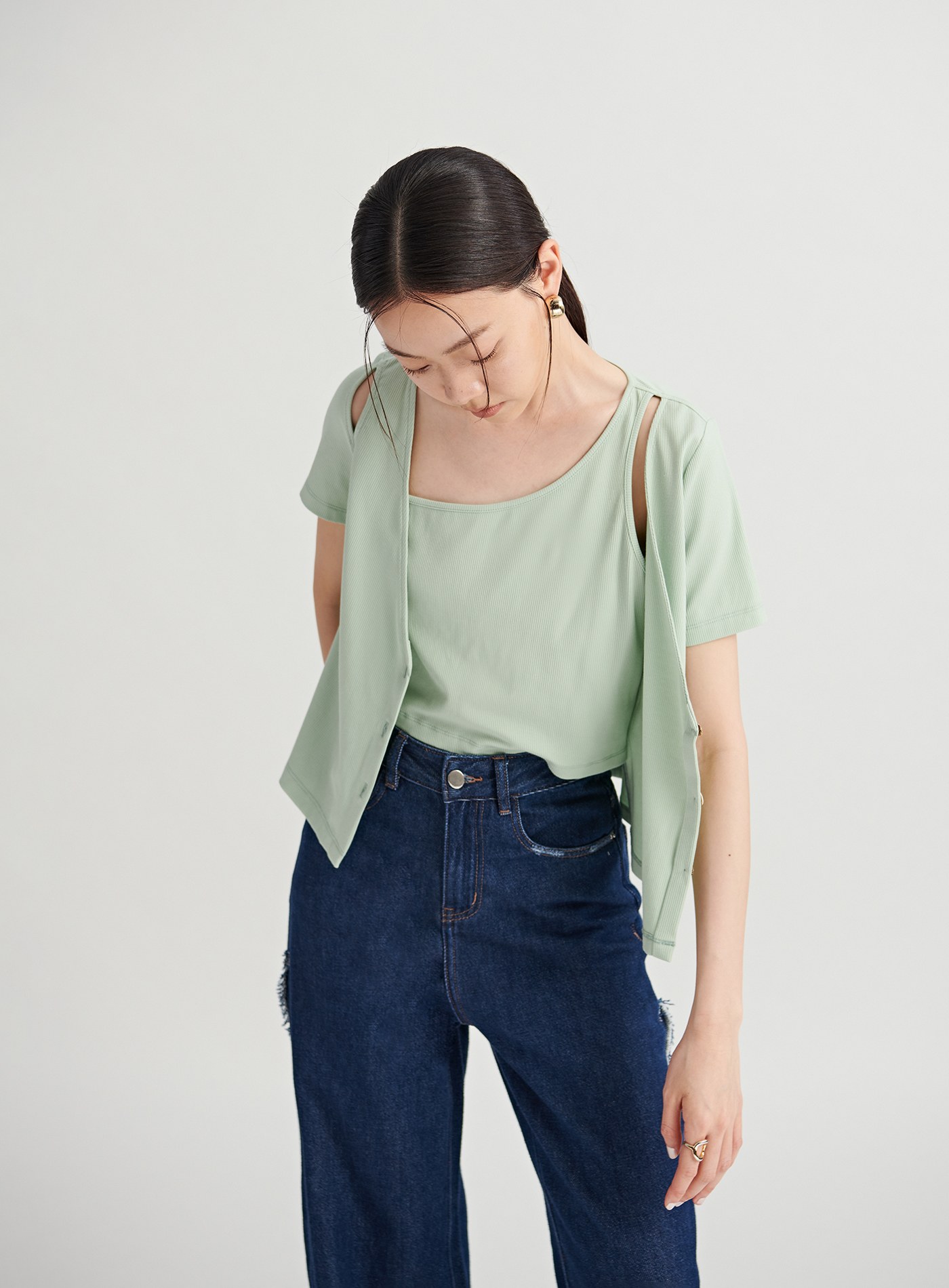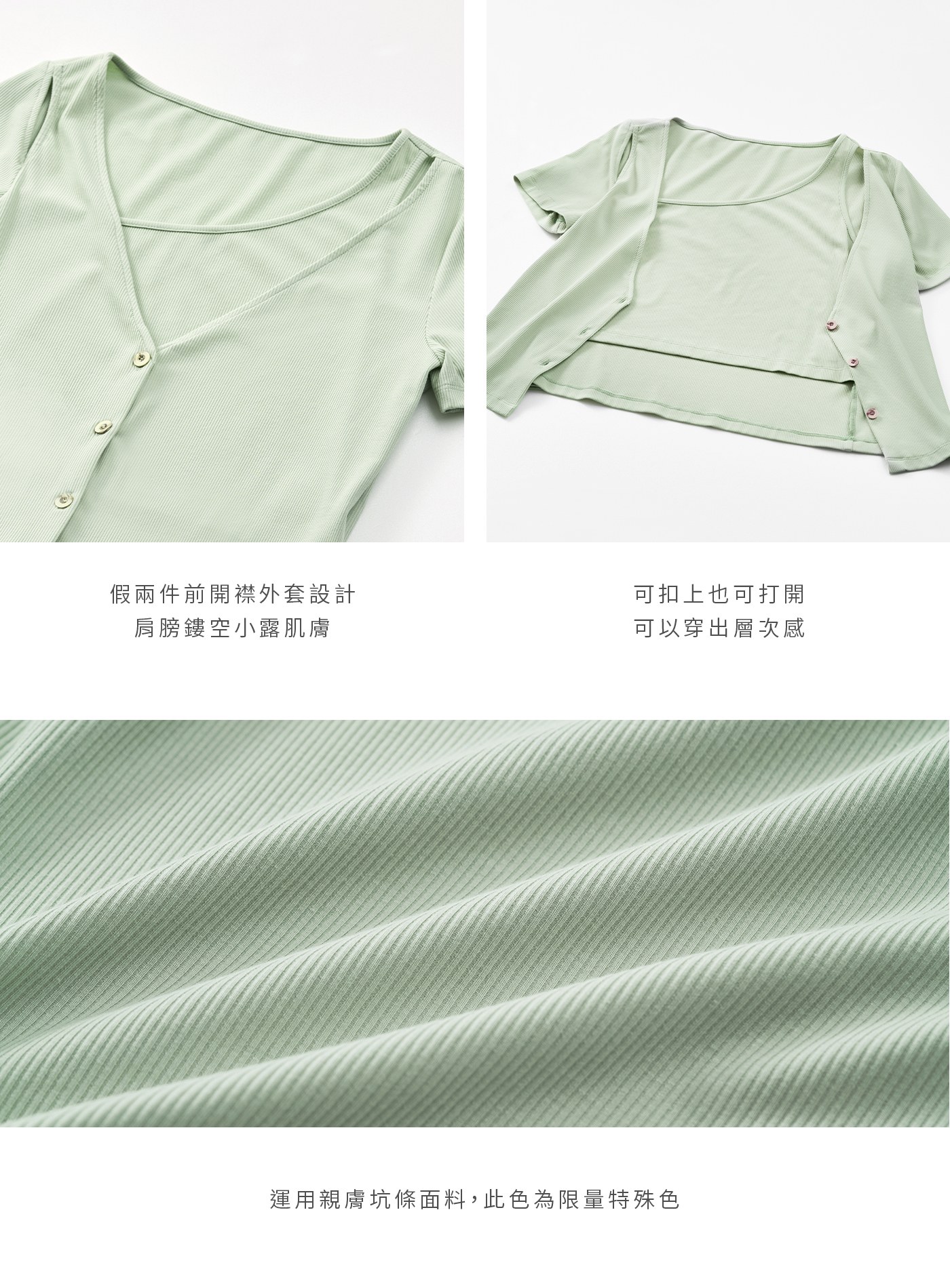 - 假兩件前開襟外套設計,可扣上也可打開,夏天也可以穿出層次感