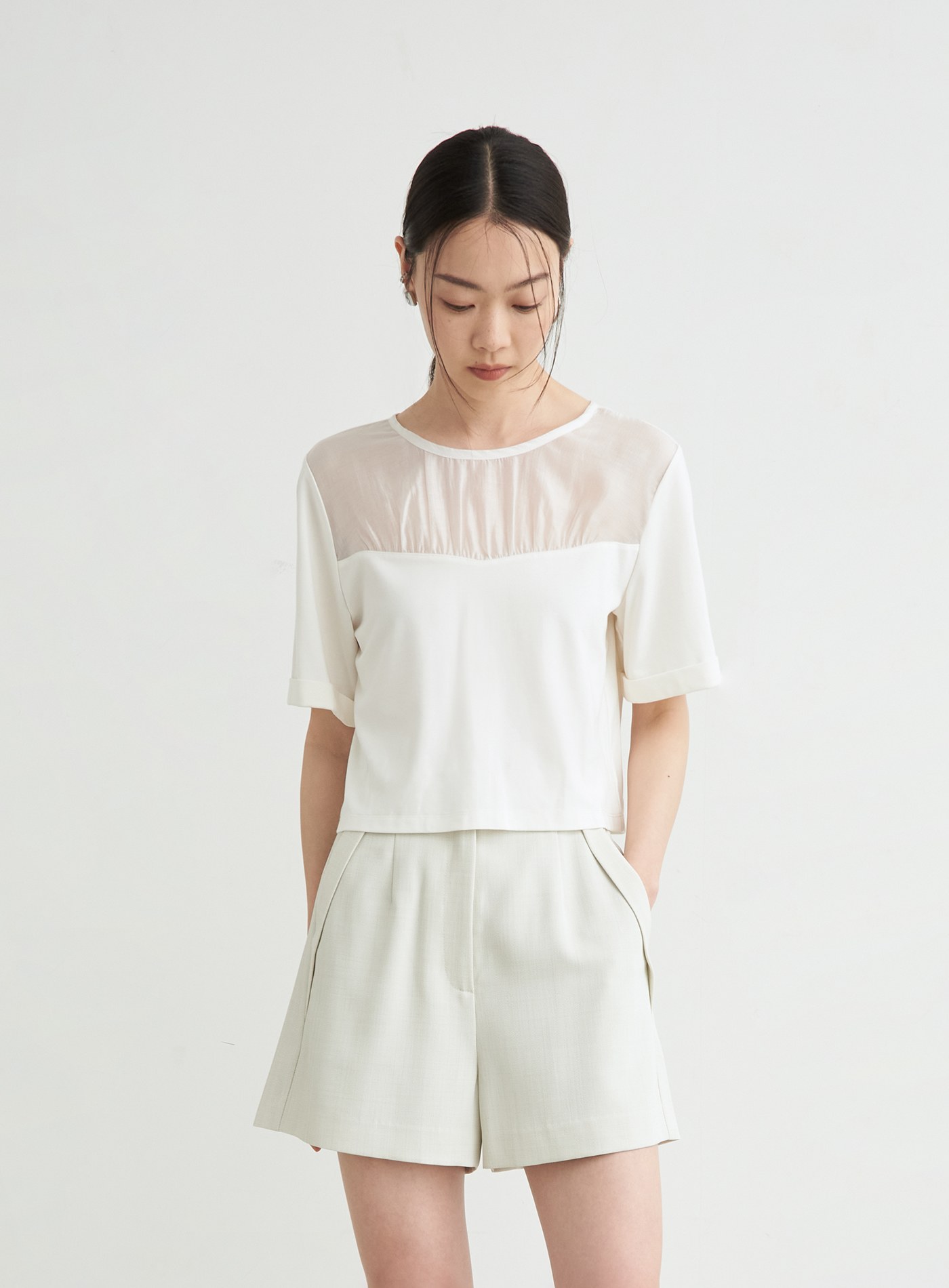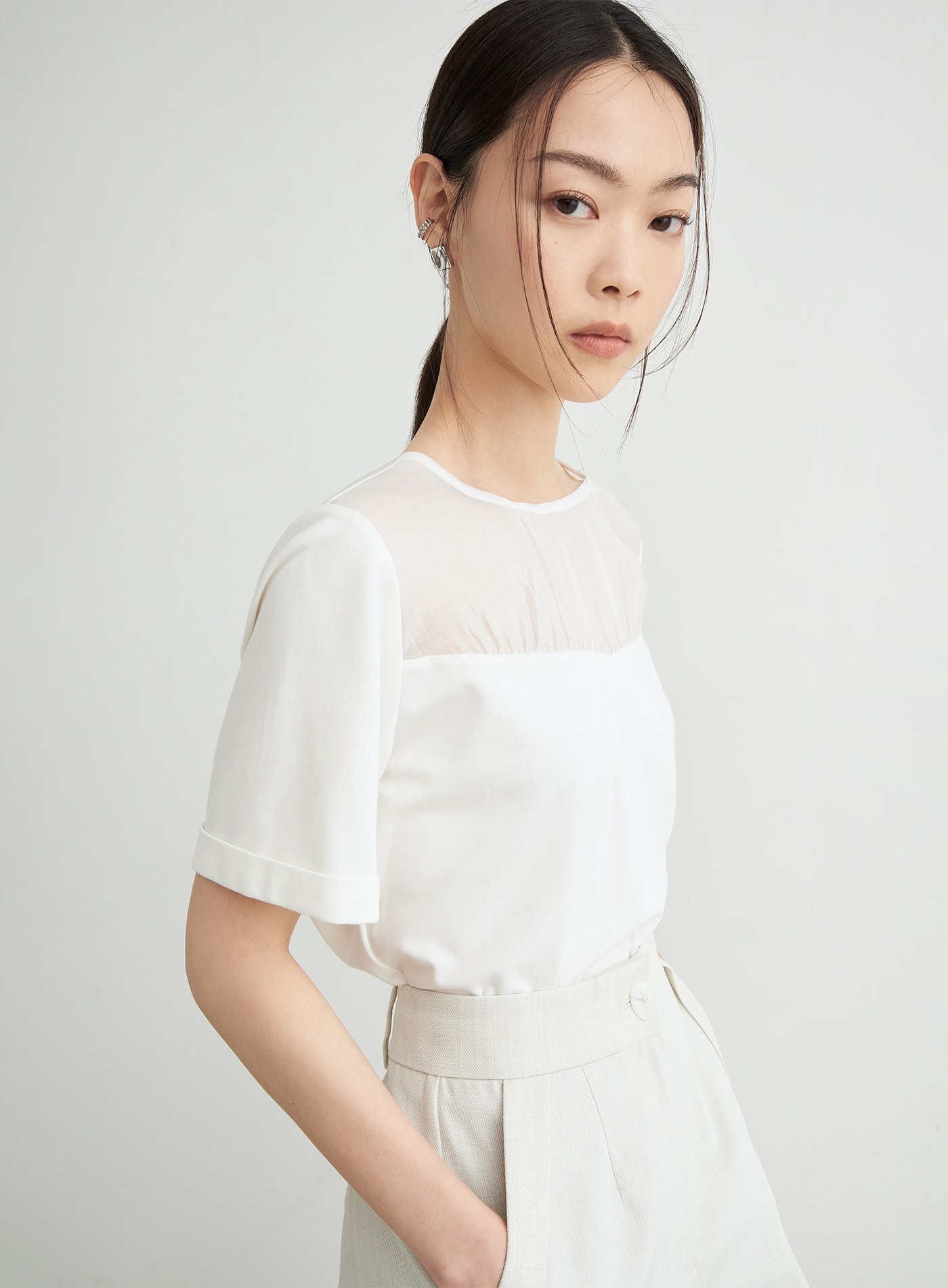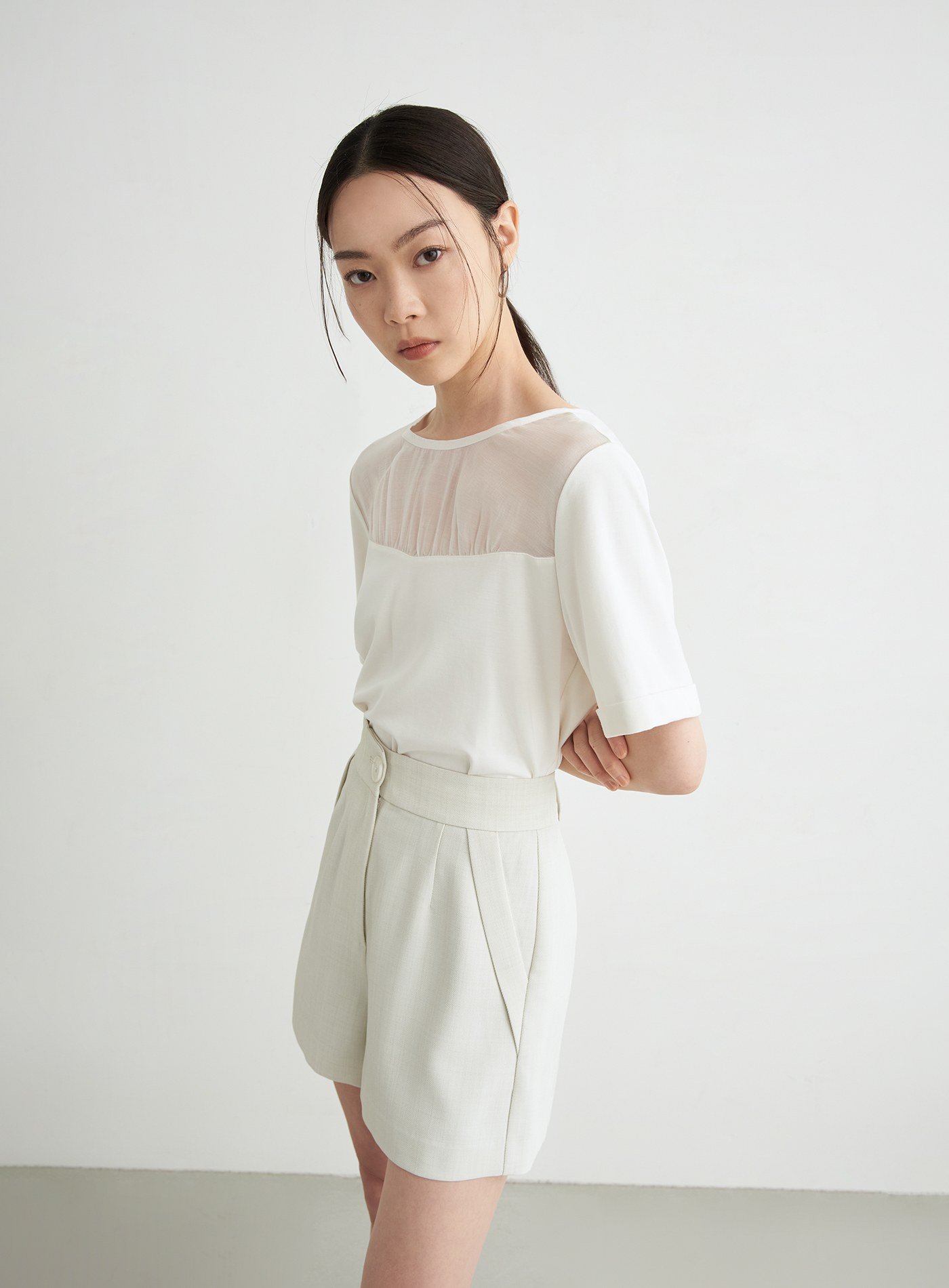 - 圓領寬鬆短版TEE版型,前身抽皺細節與透膚面料相拼,平衡優雅與休閒感