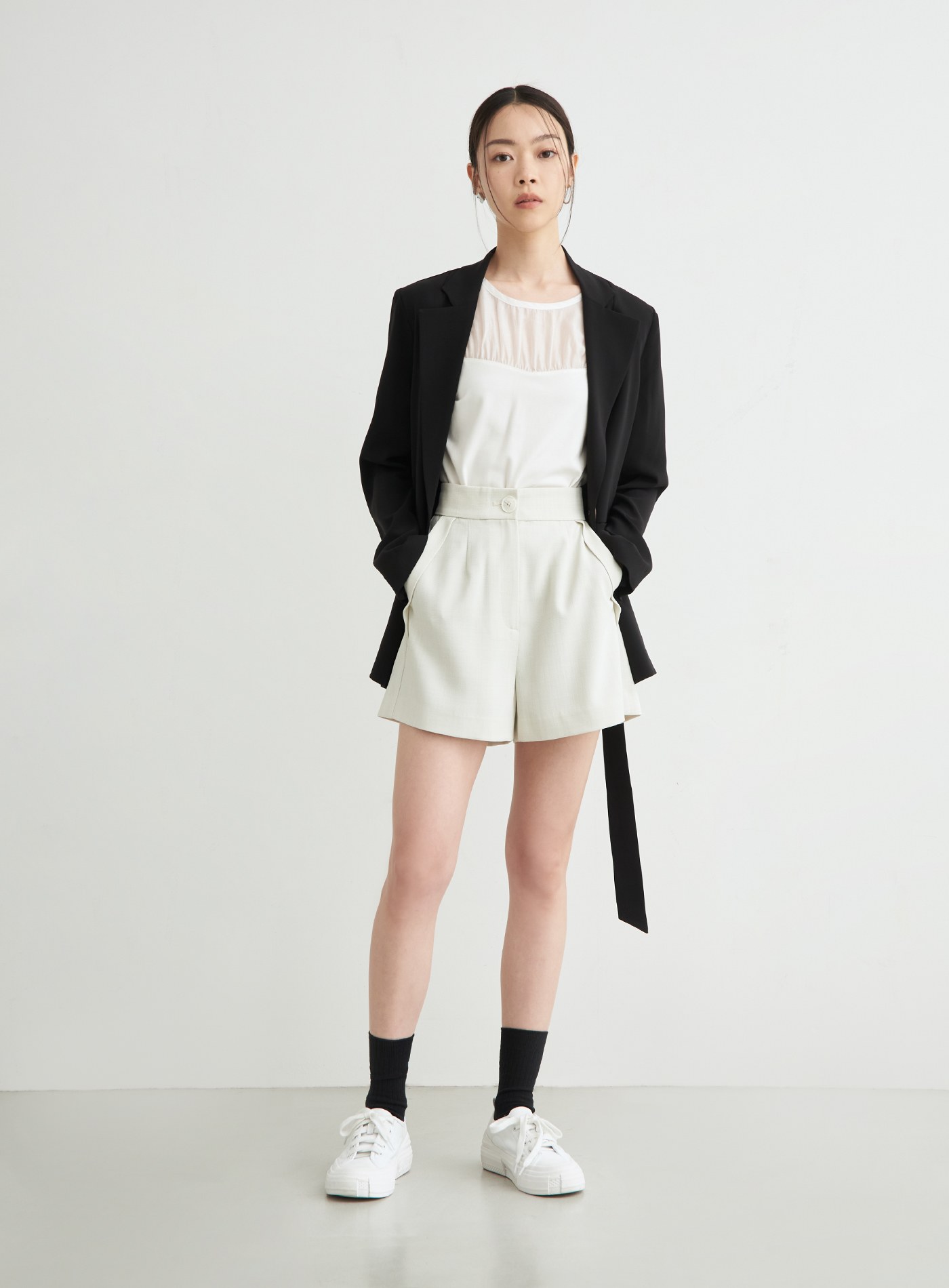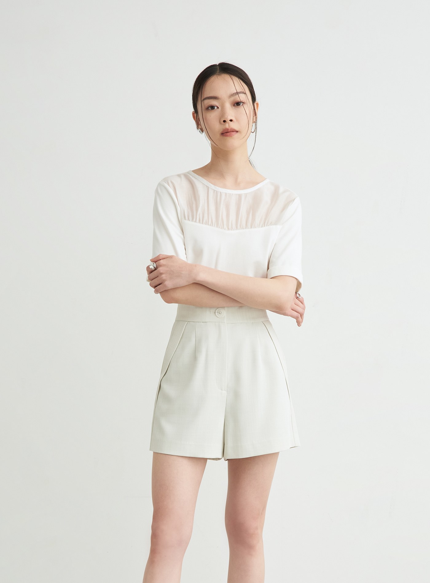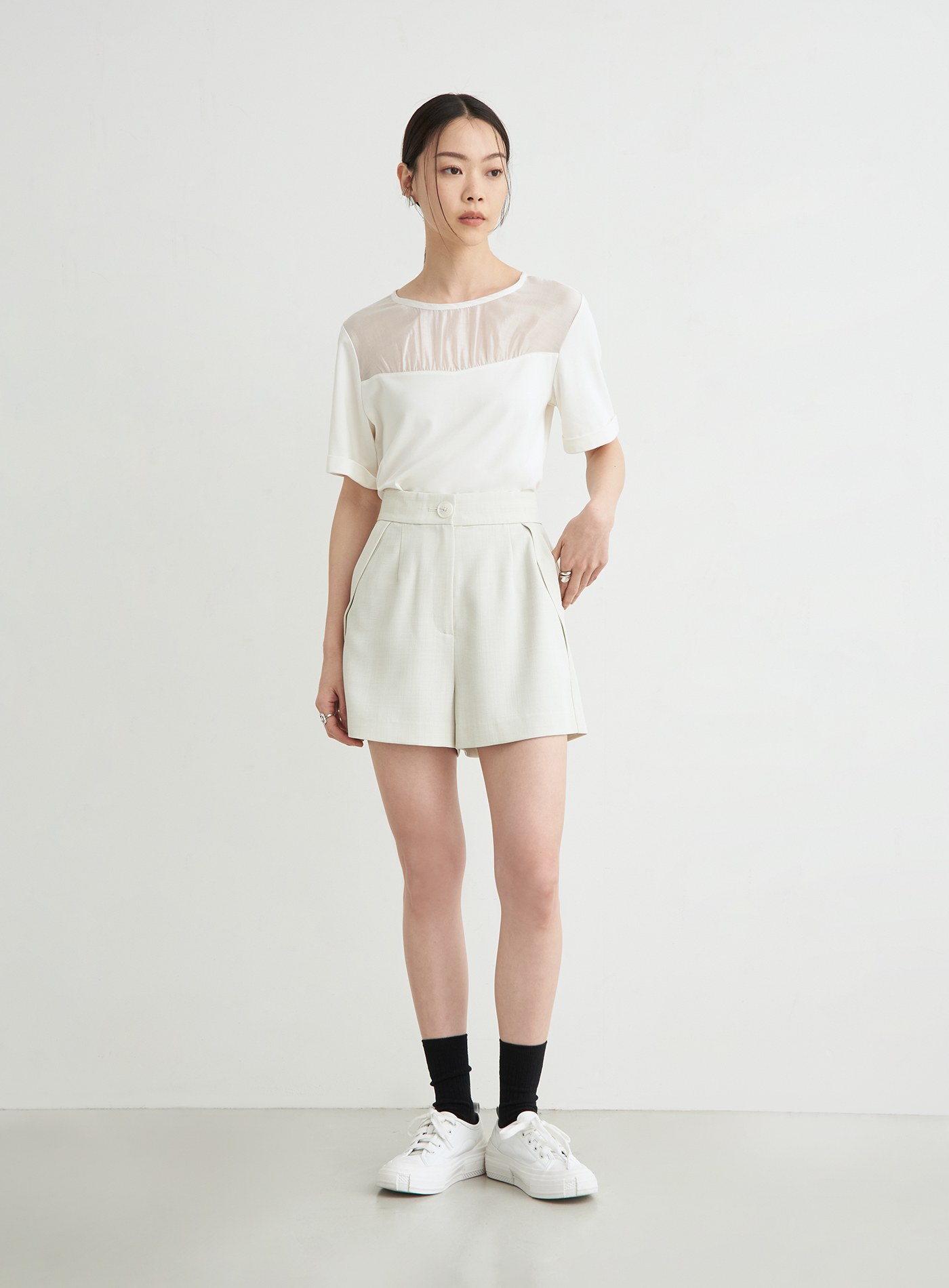 - 圓領寬鬆短版TEE版型,前身抽皺細節與透膚面料相拼,平衡優雅與休閒感