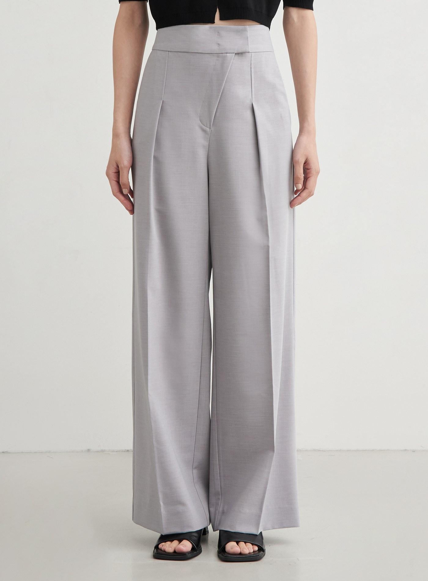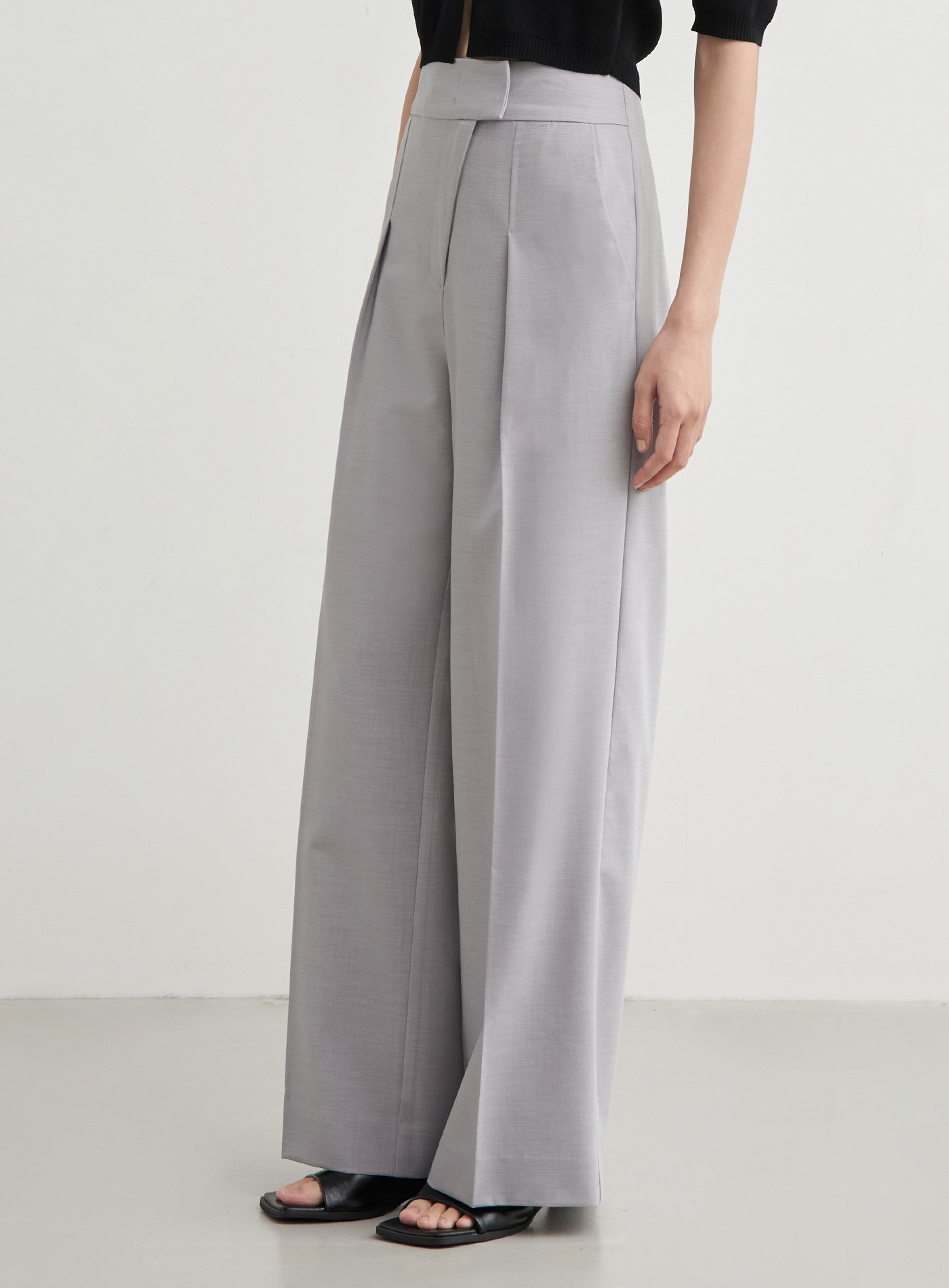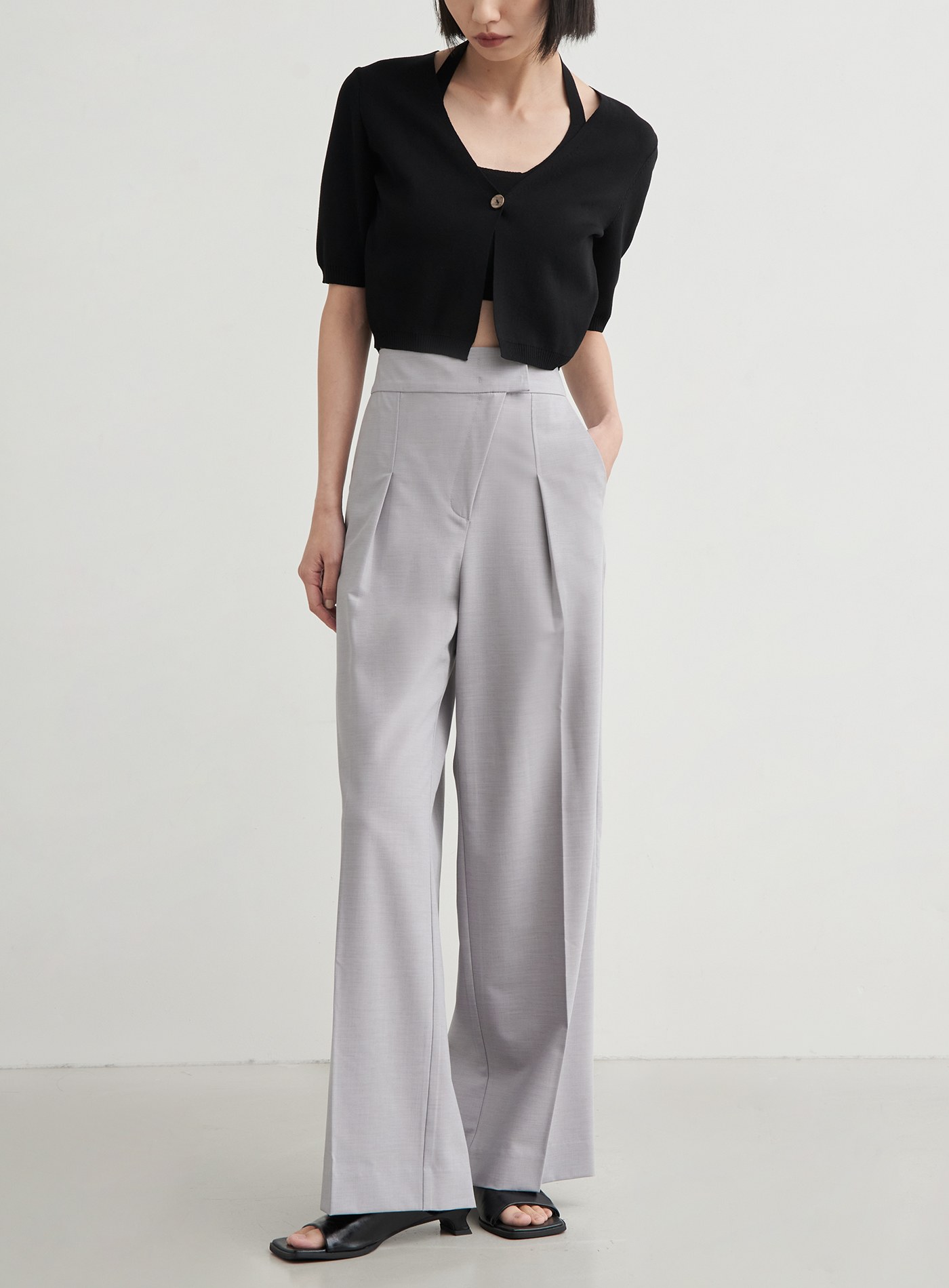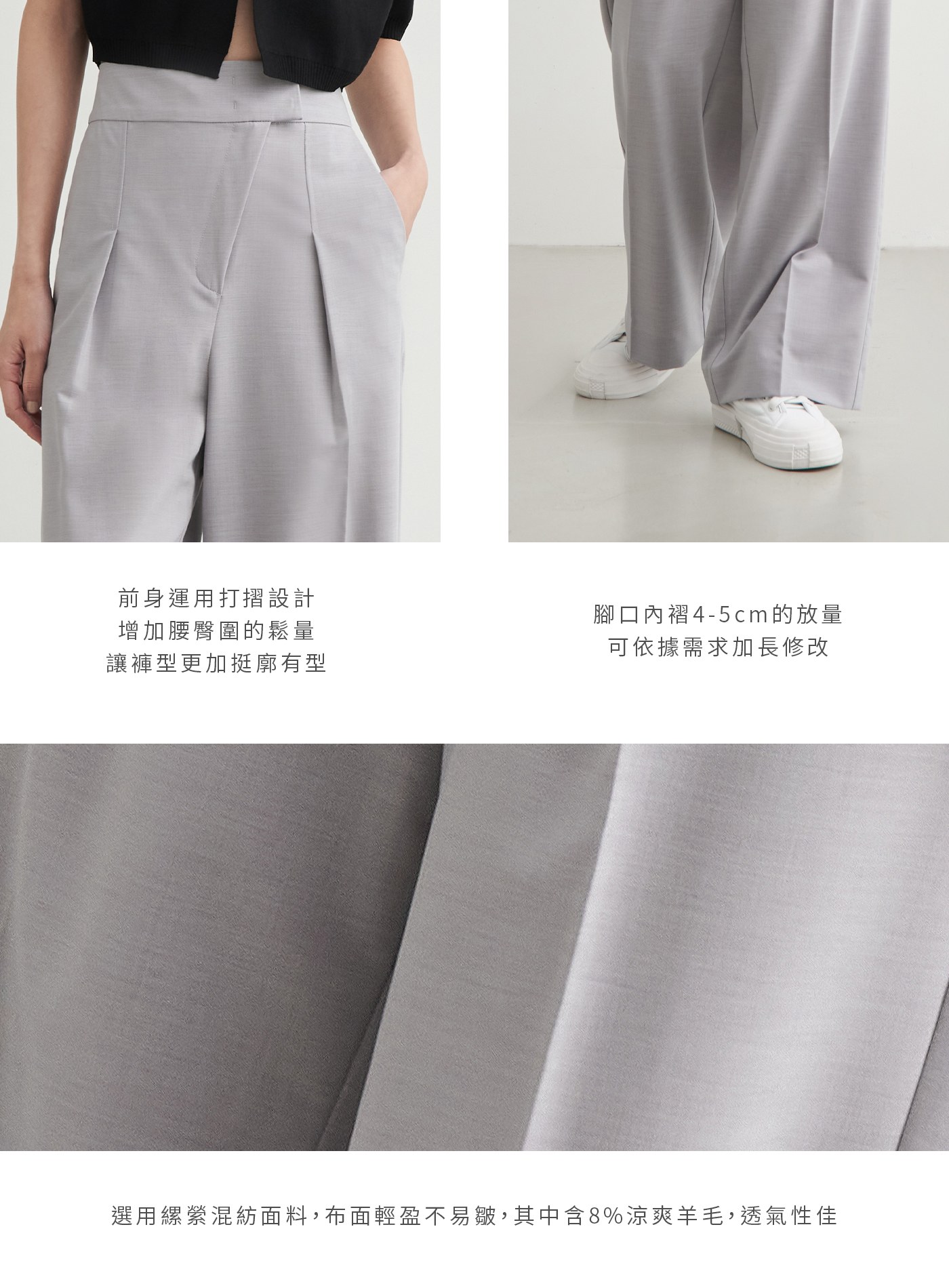 - 直筒打摺寬褲剪裁/不對稱門襟設計/有口袋