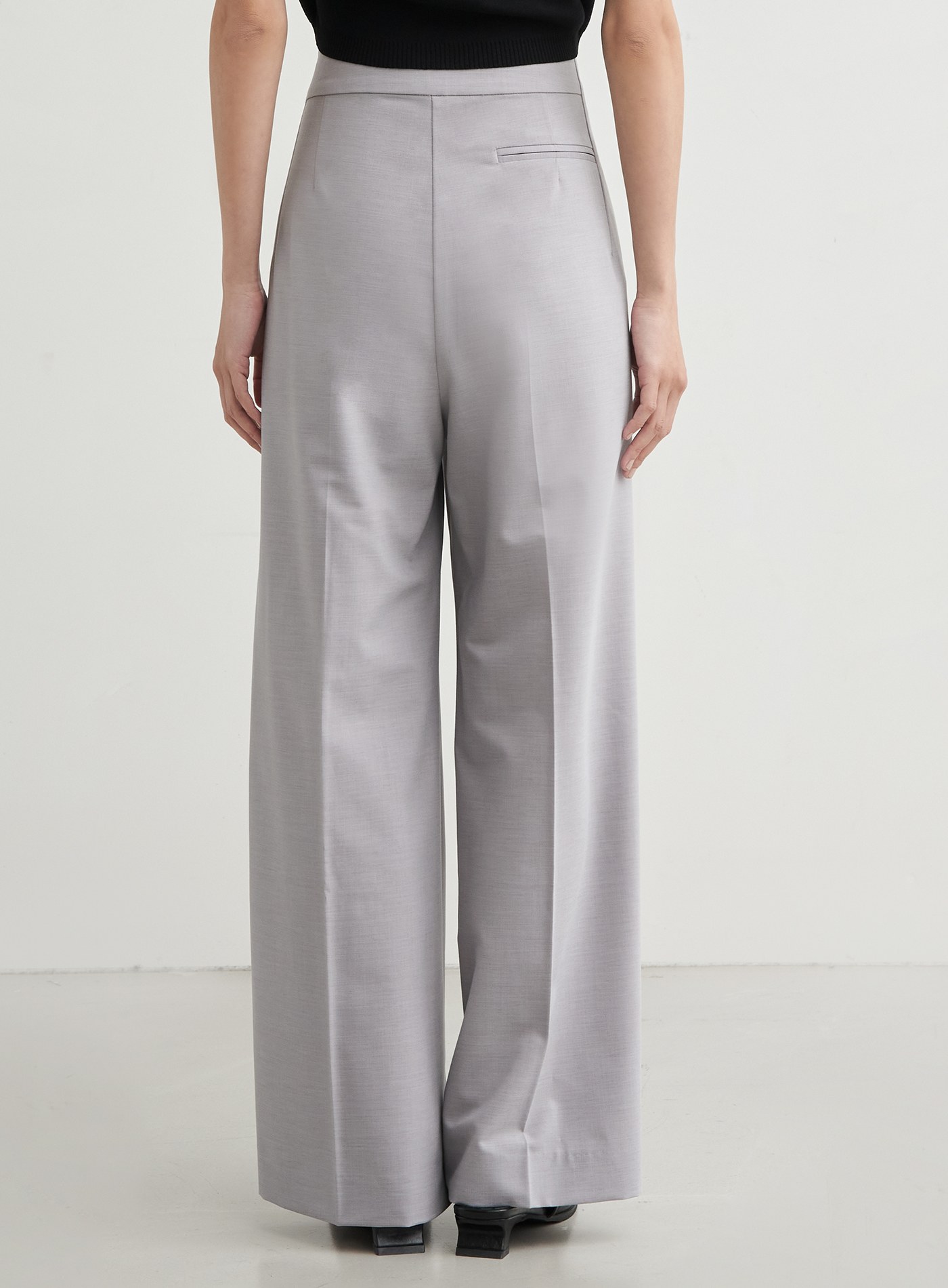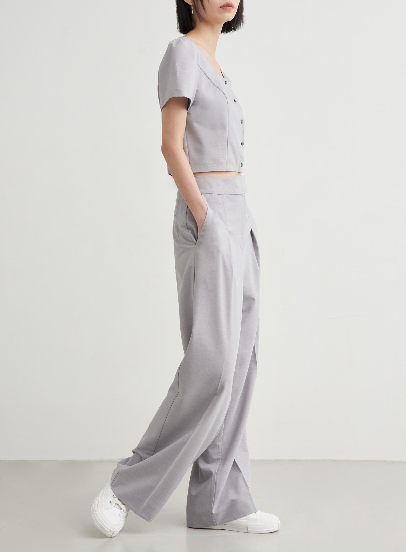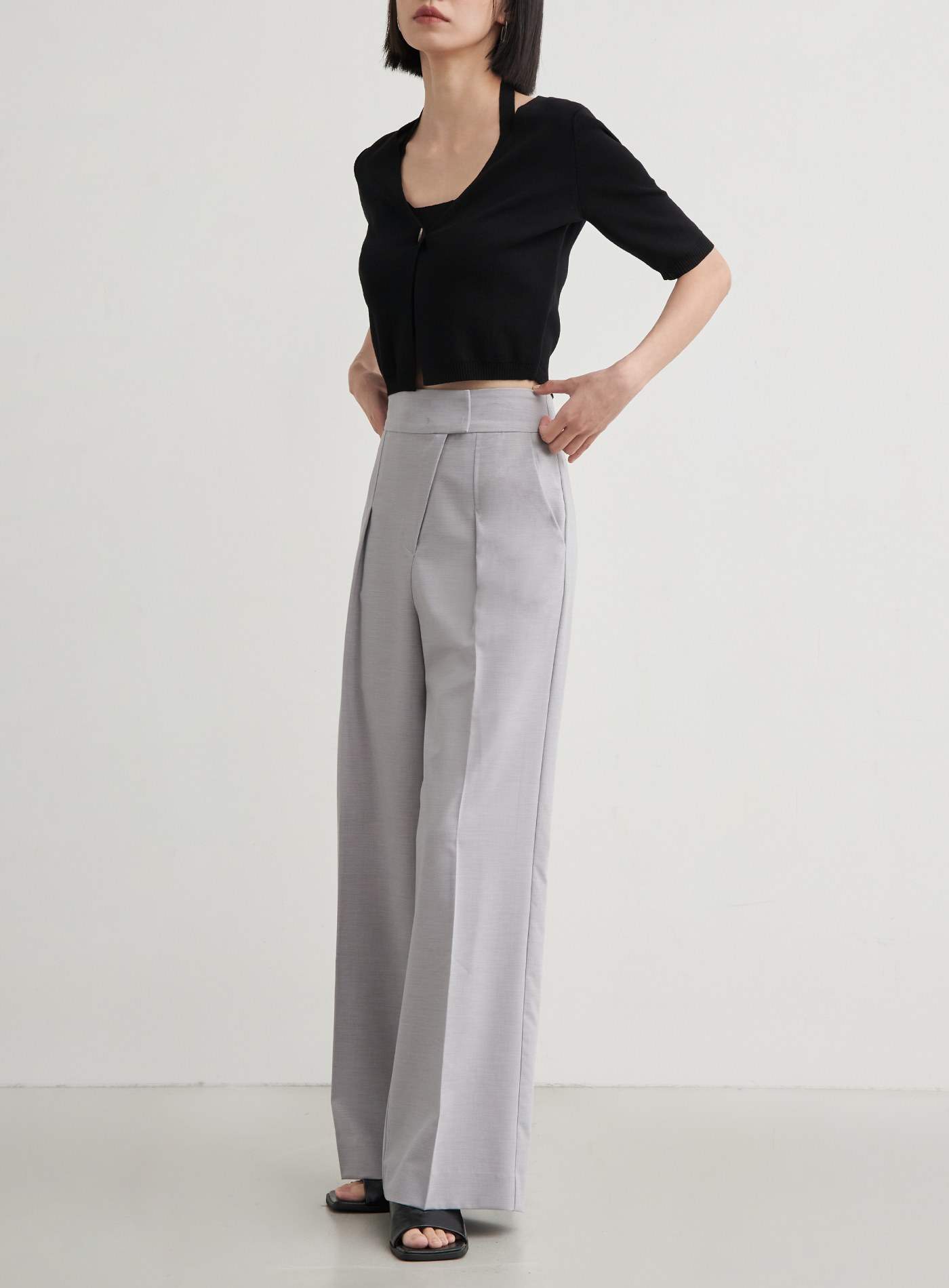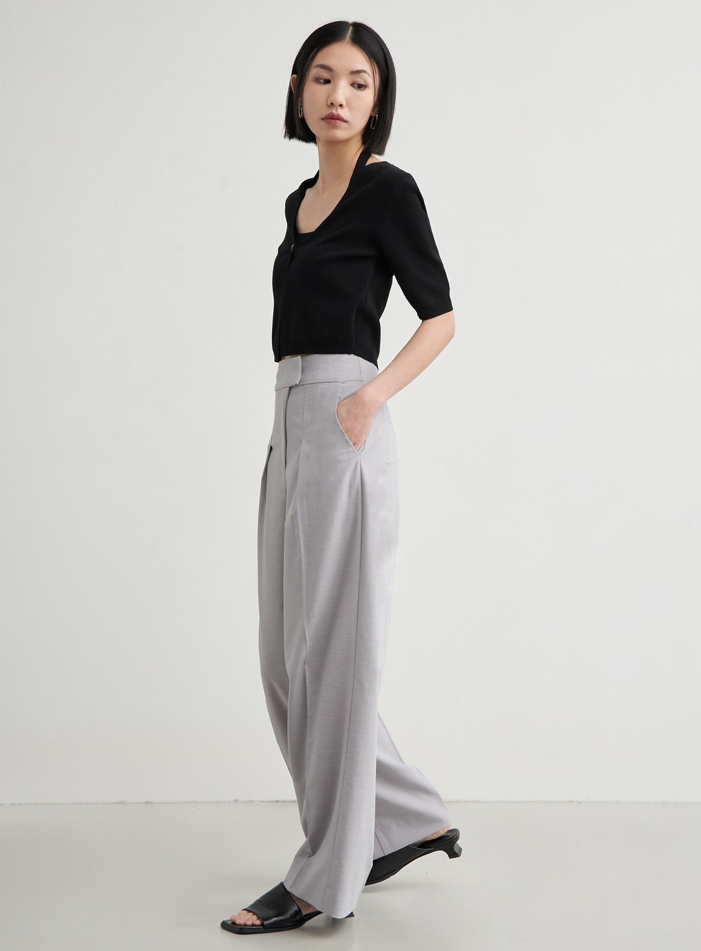 - 直筒打摺寬褲剪裁/不對稱門襟設計/有口袋