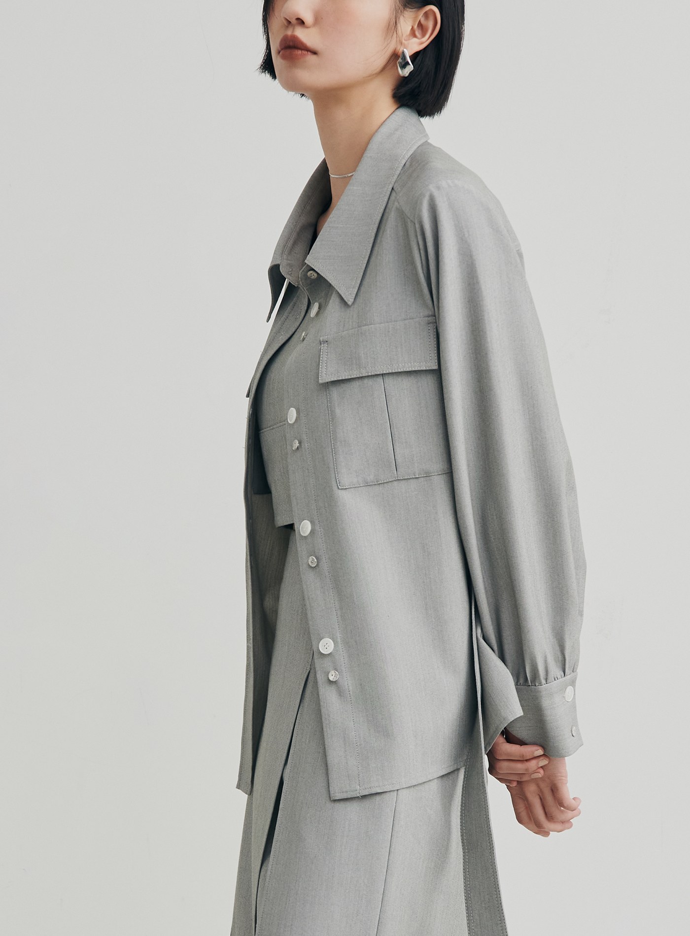 - 門襟與袖口以不規則排列釦設計,提升細節質感