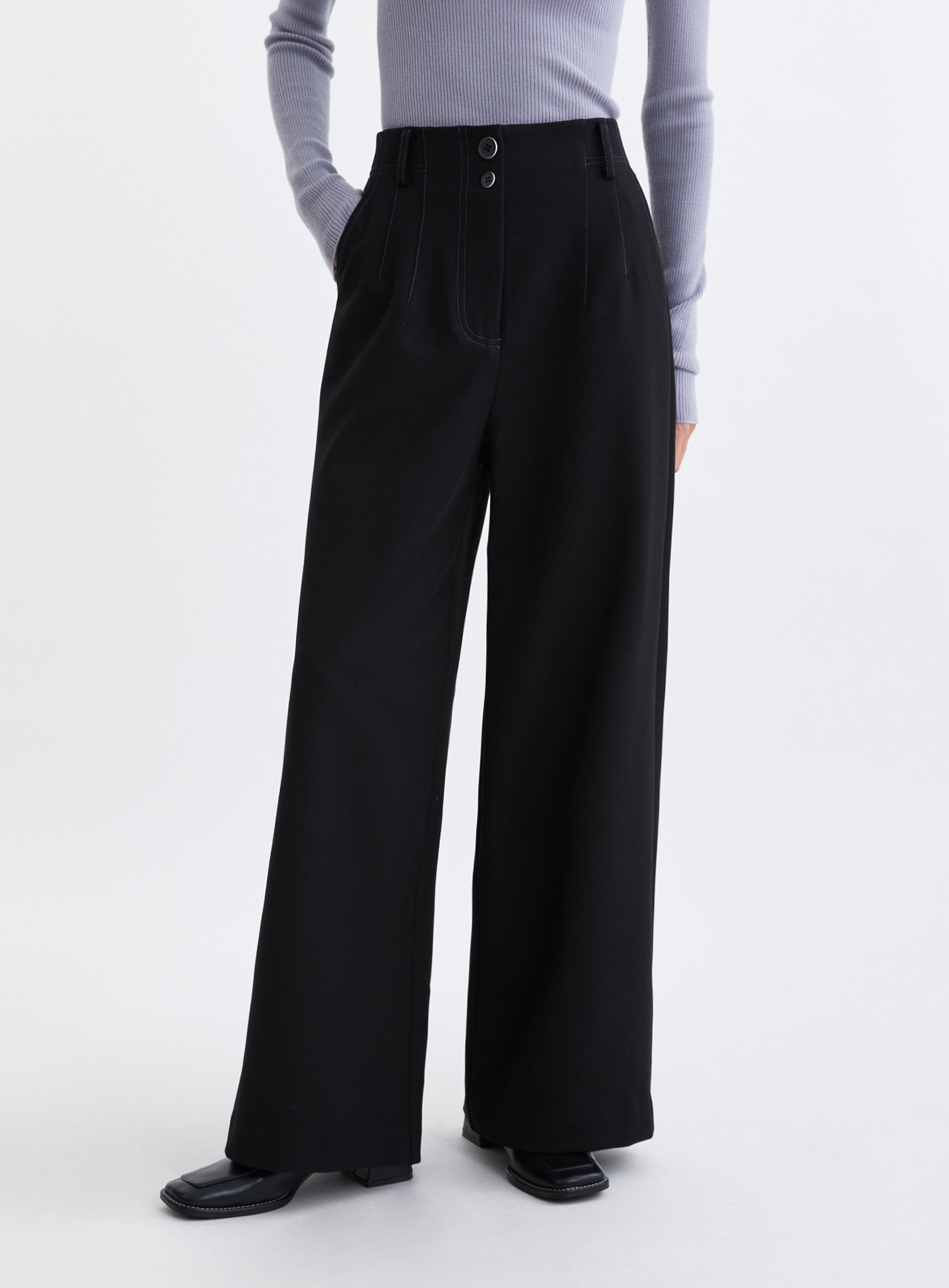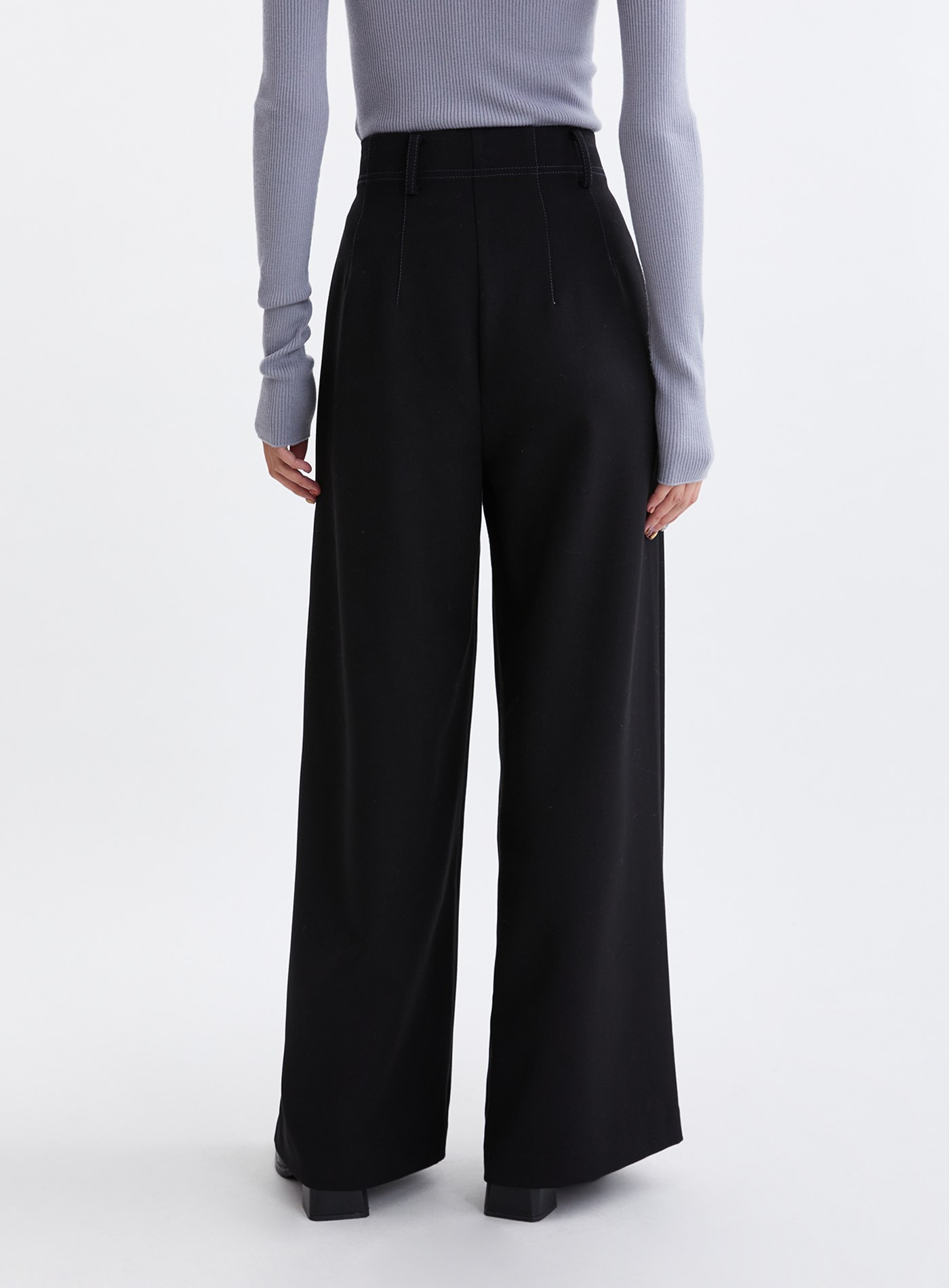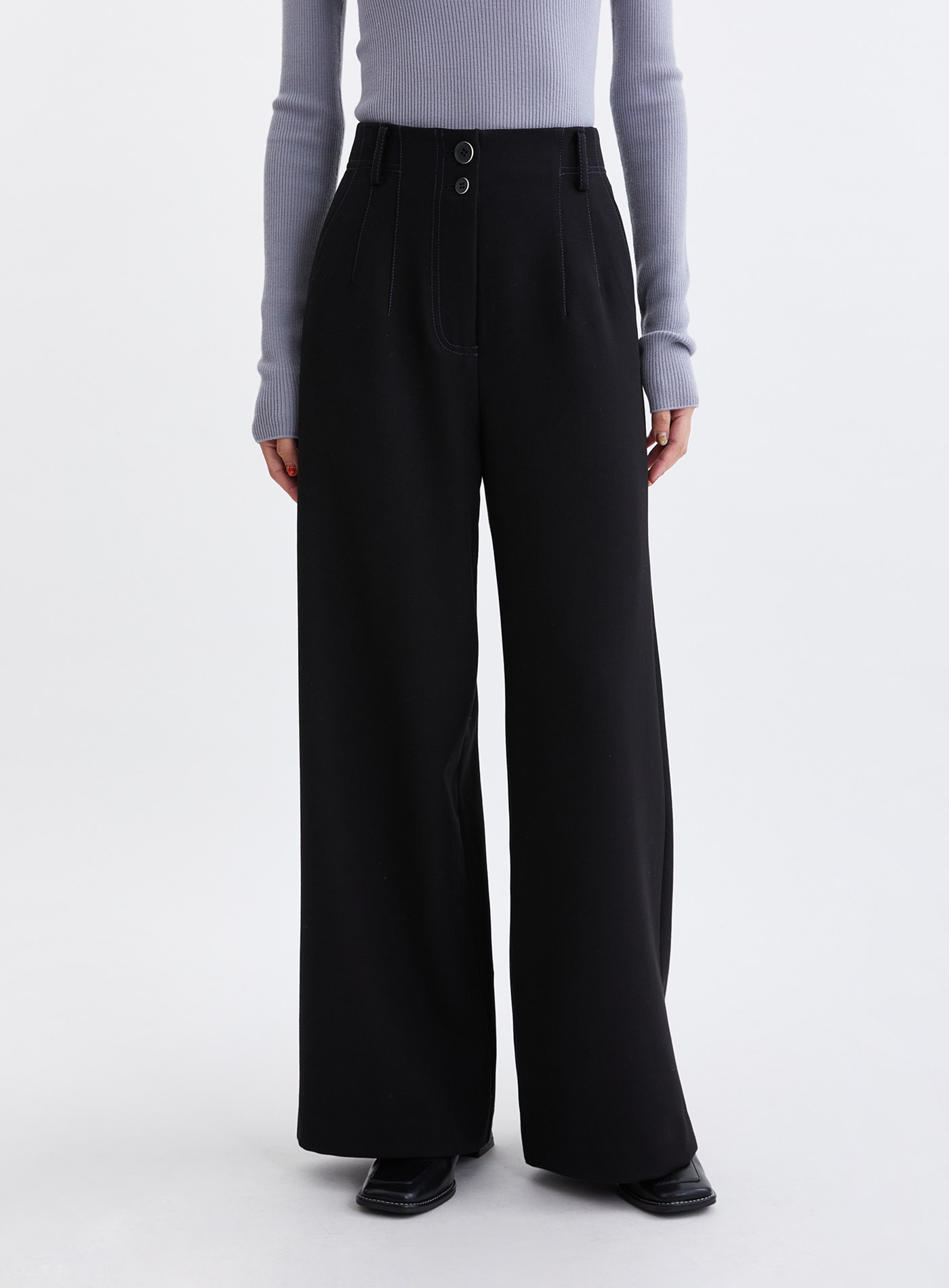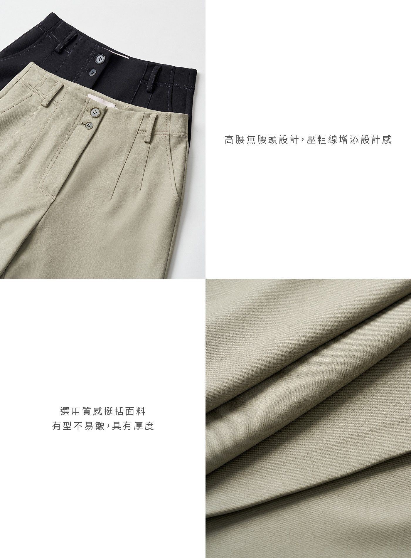 - 高腰無腰頭設計,寬褲版型展現俐落個性