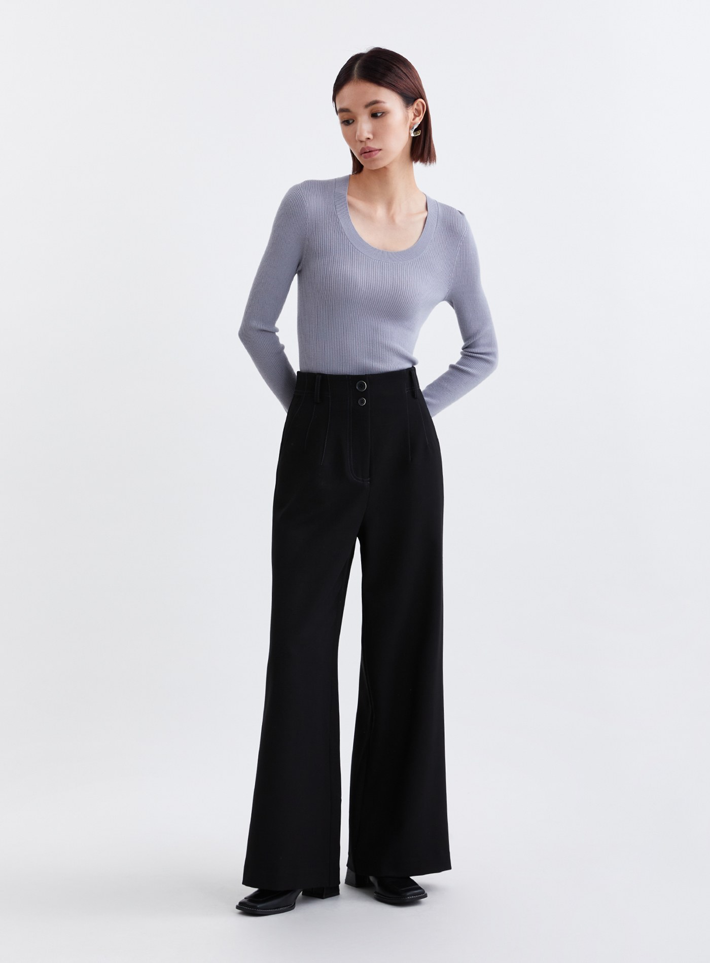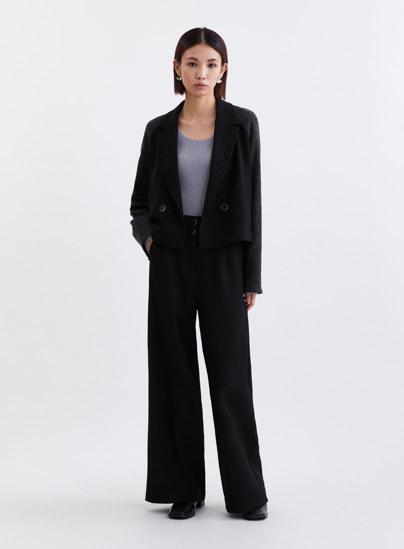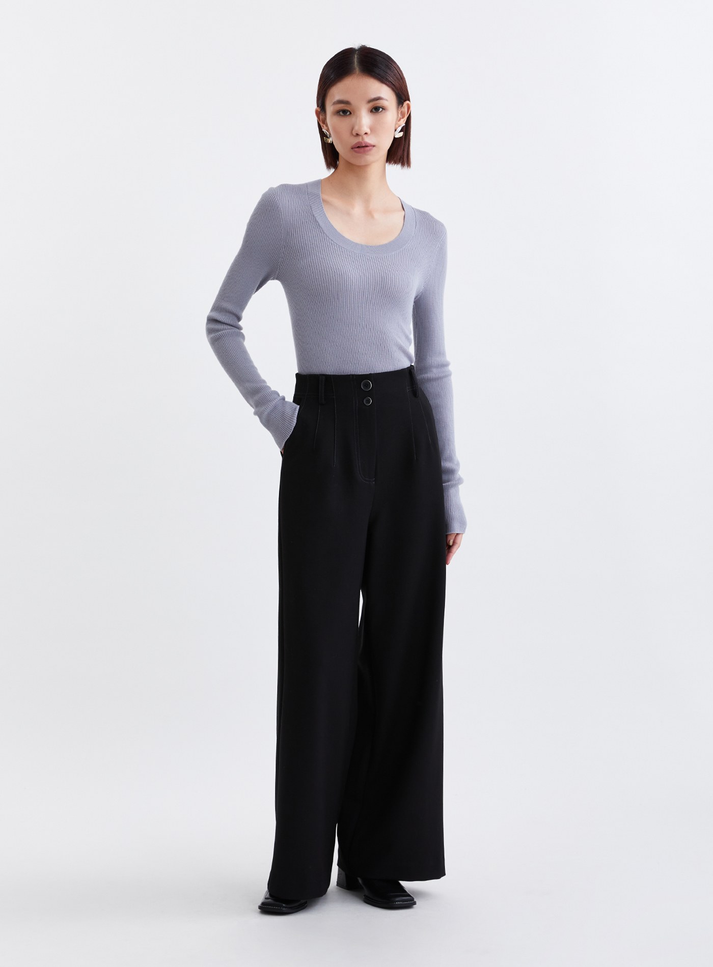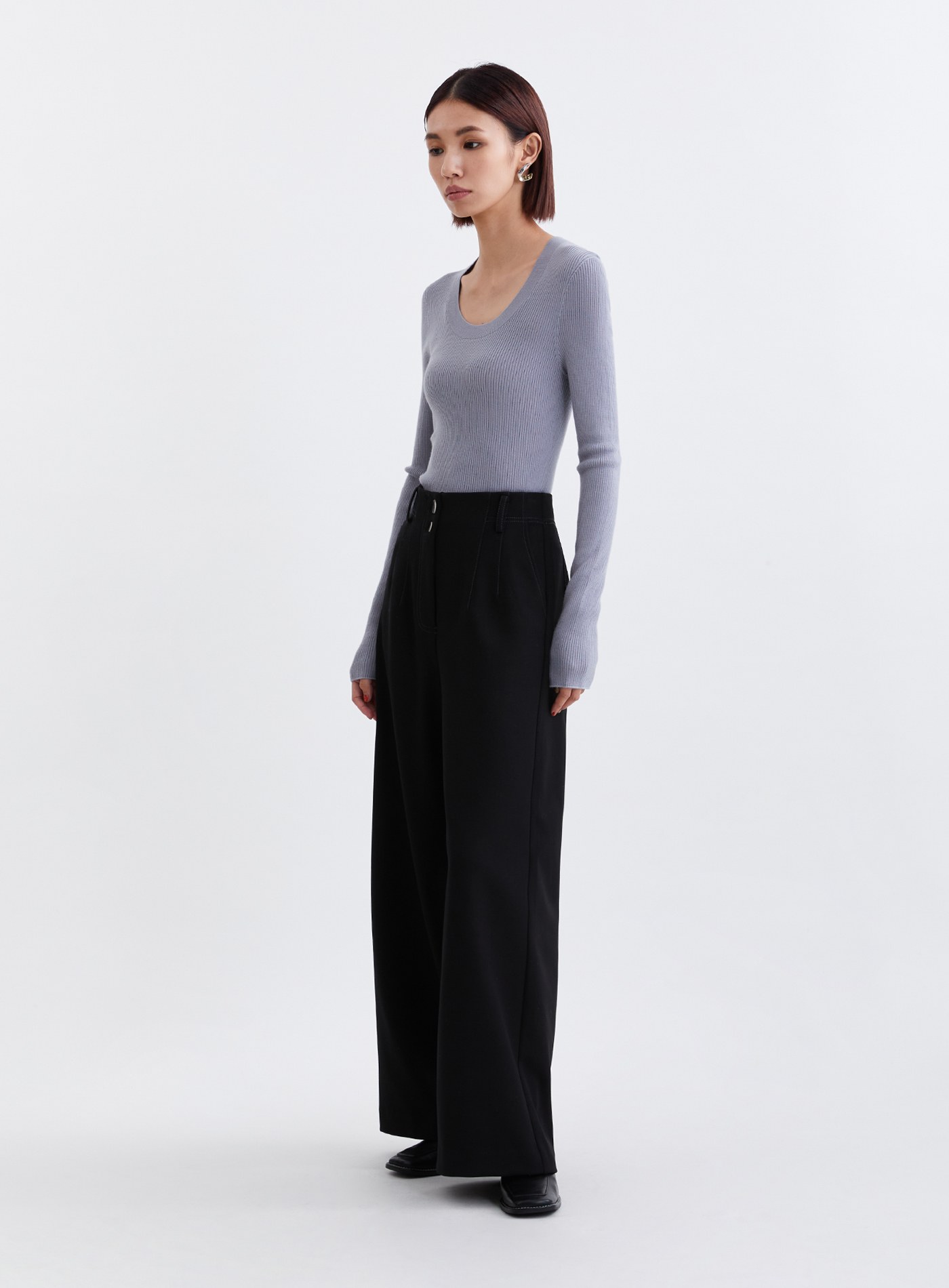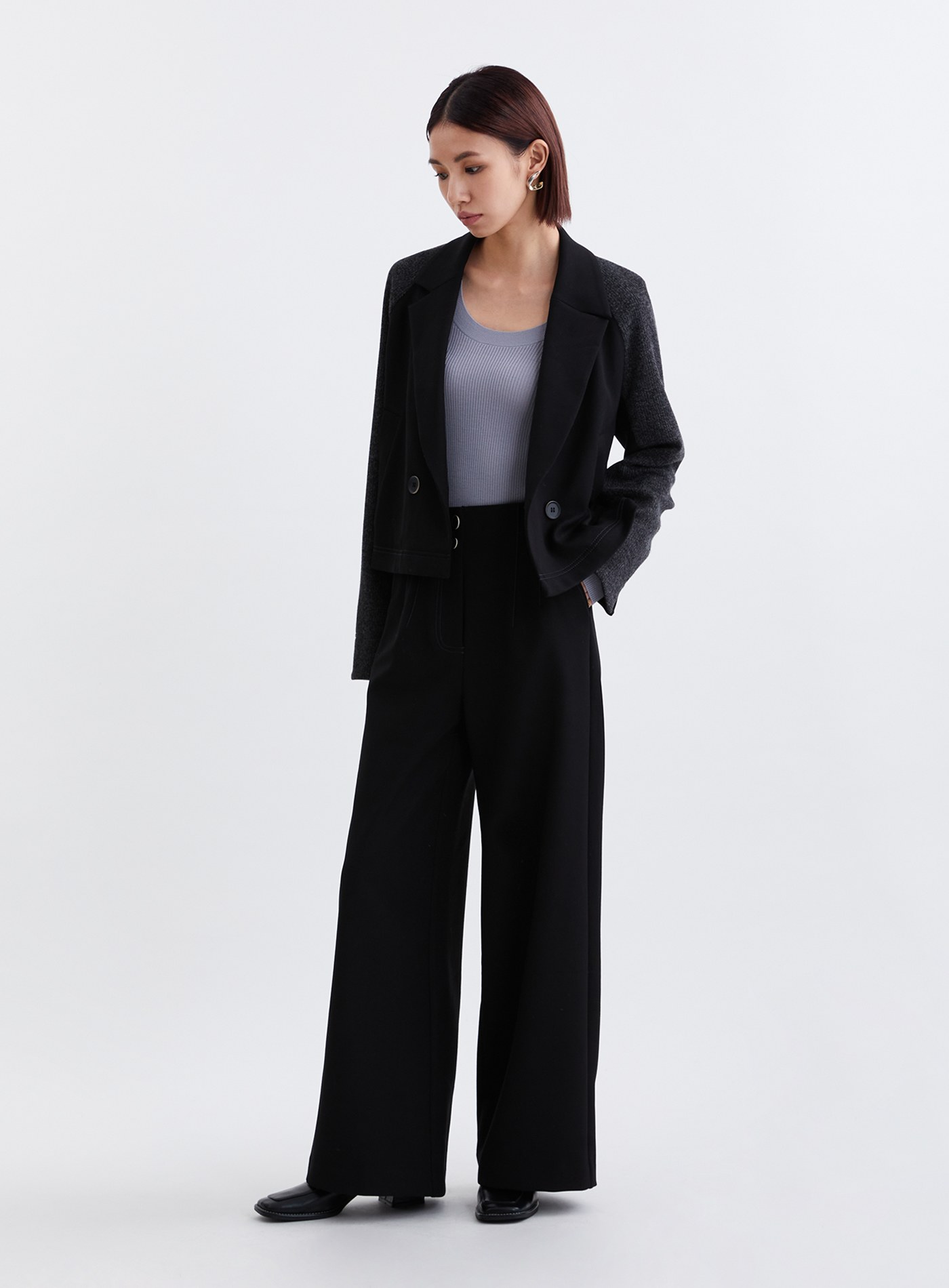 - 高腰無腰頭設計,寬褲版型展現俐落個性