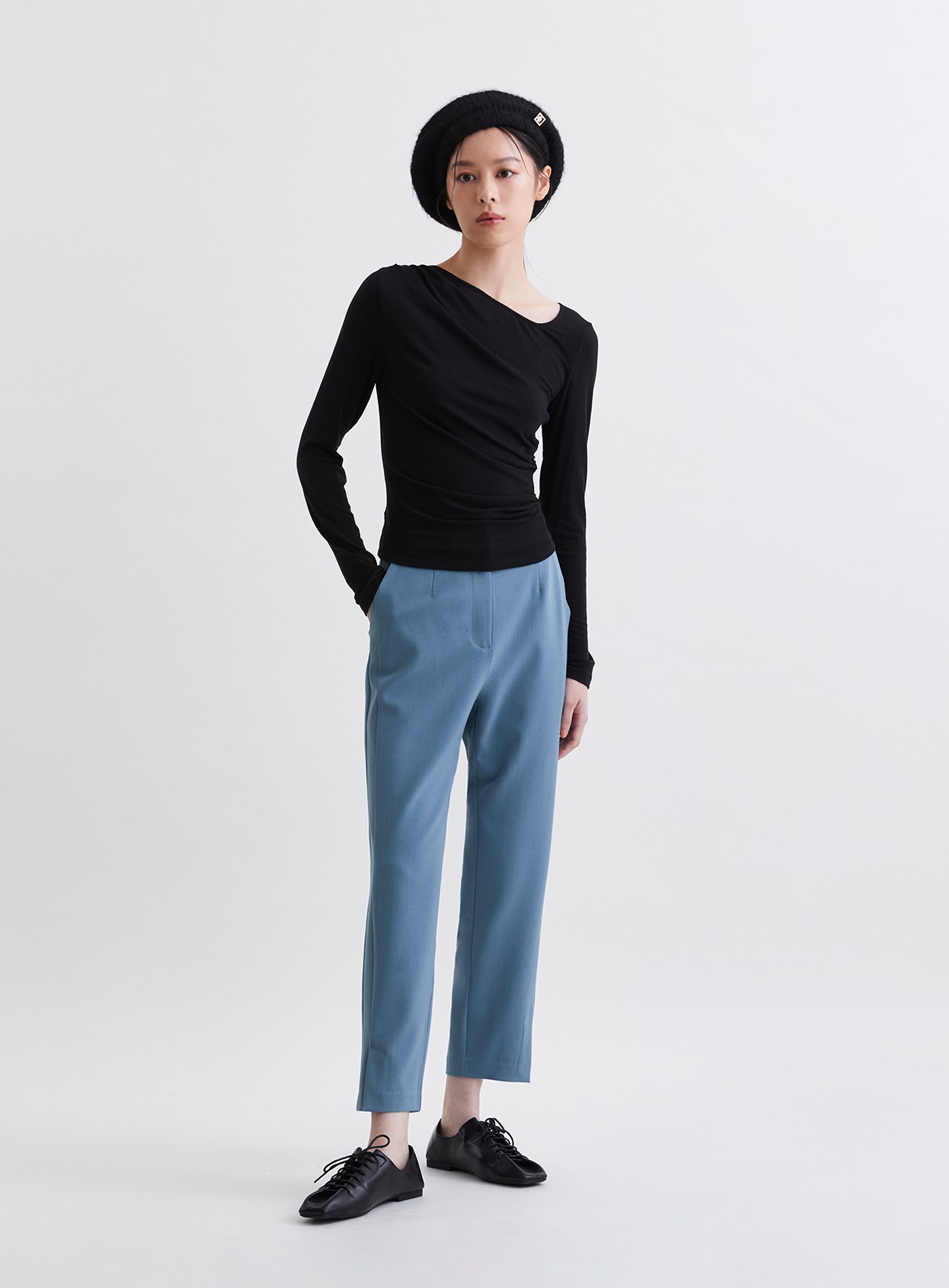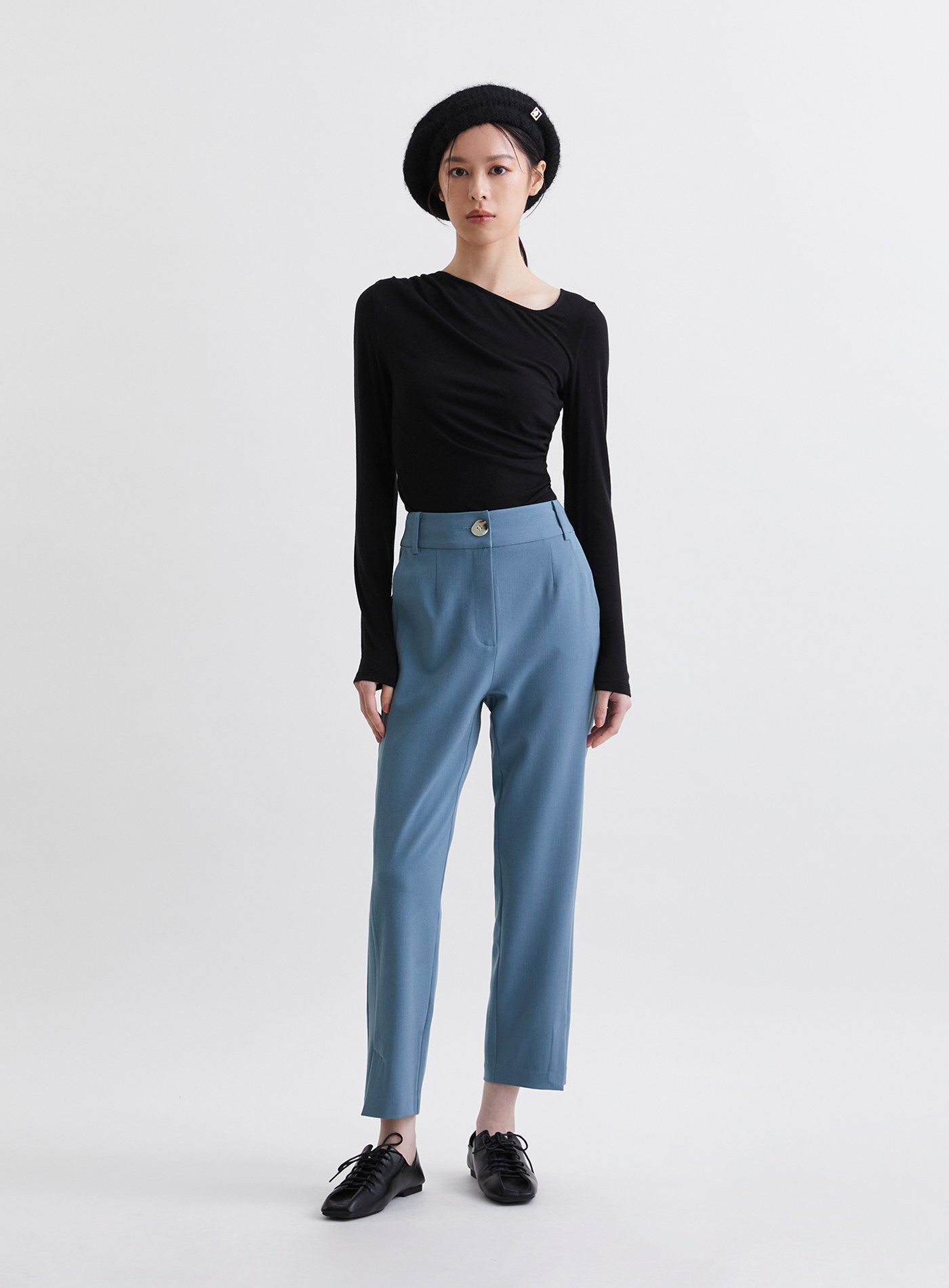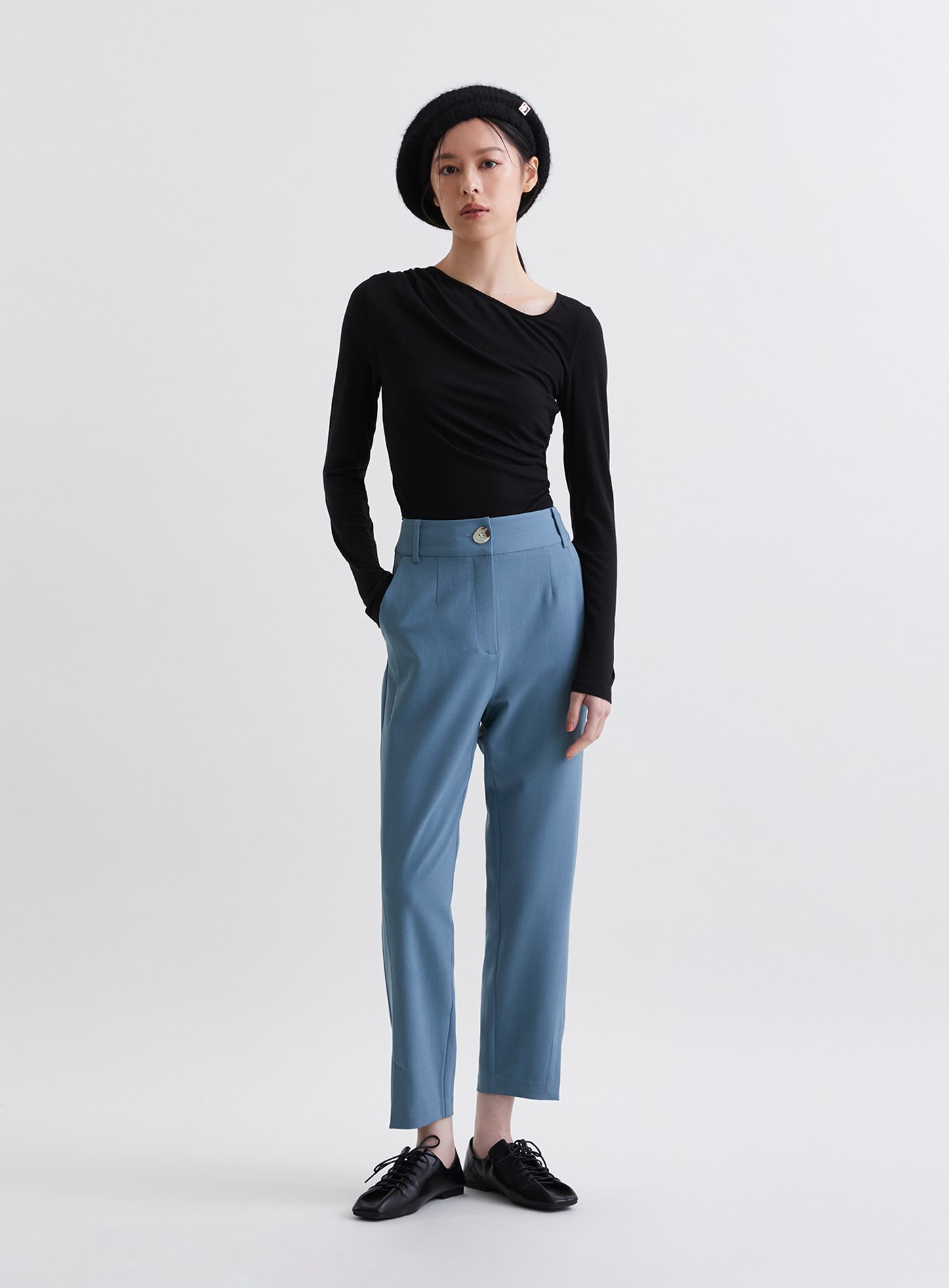 - 前側身抓斜皺設計,腰部保有空間,修身不貼身