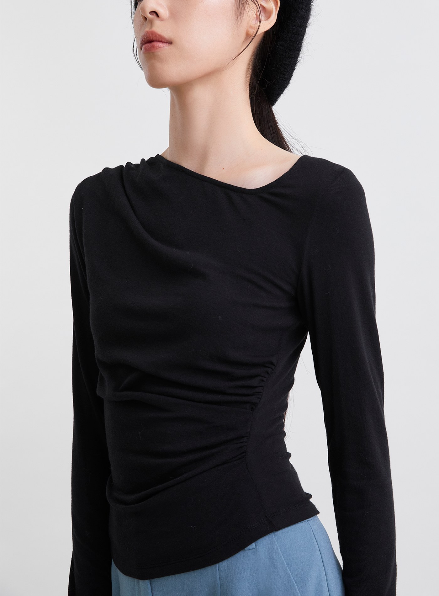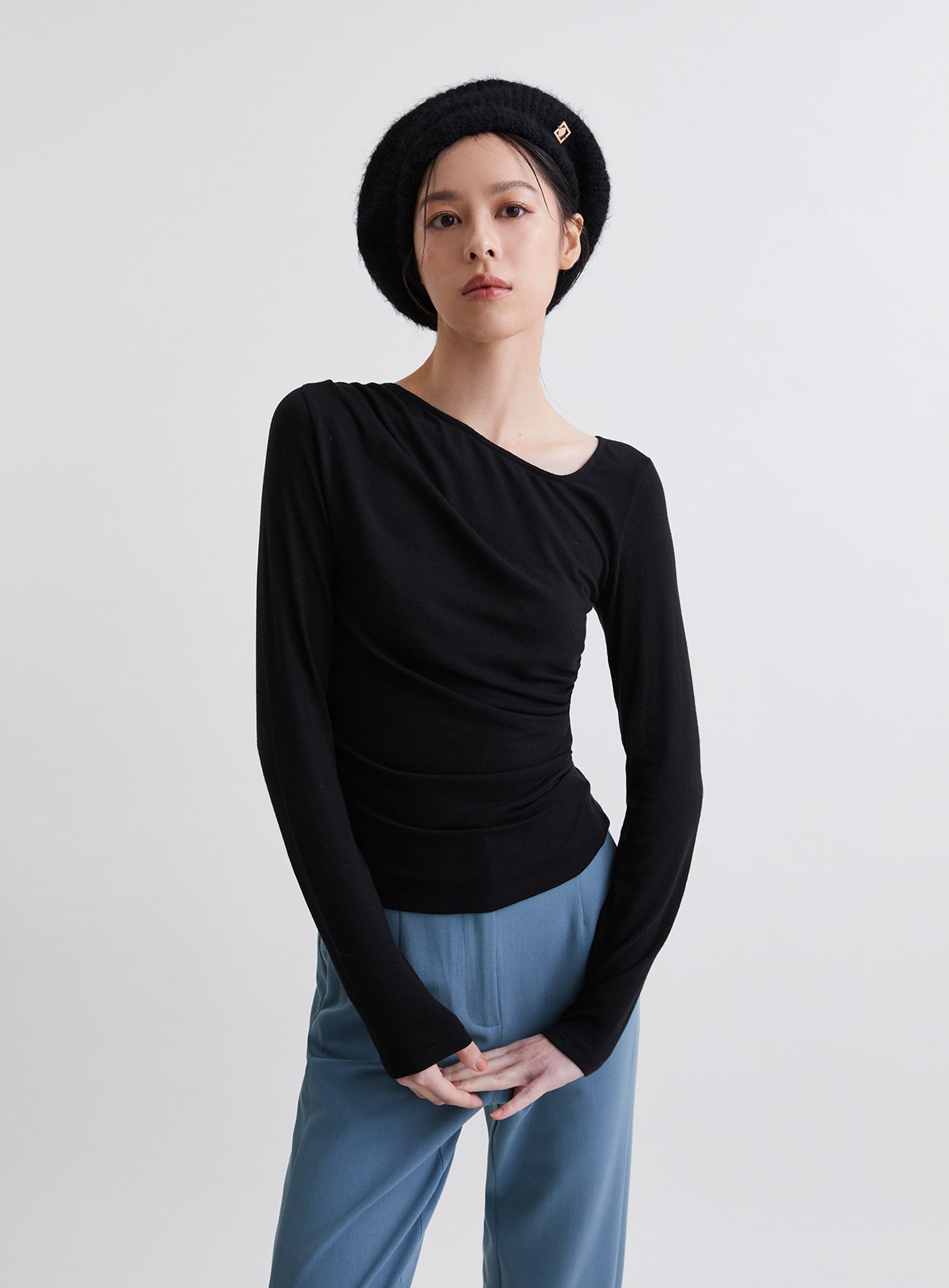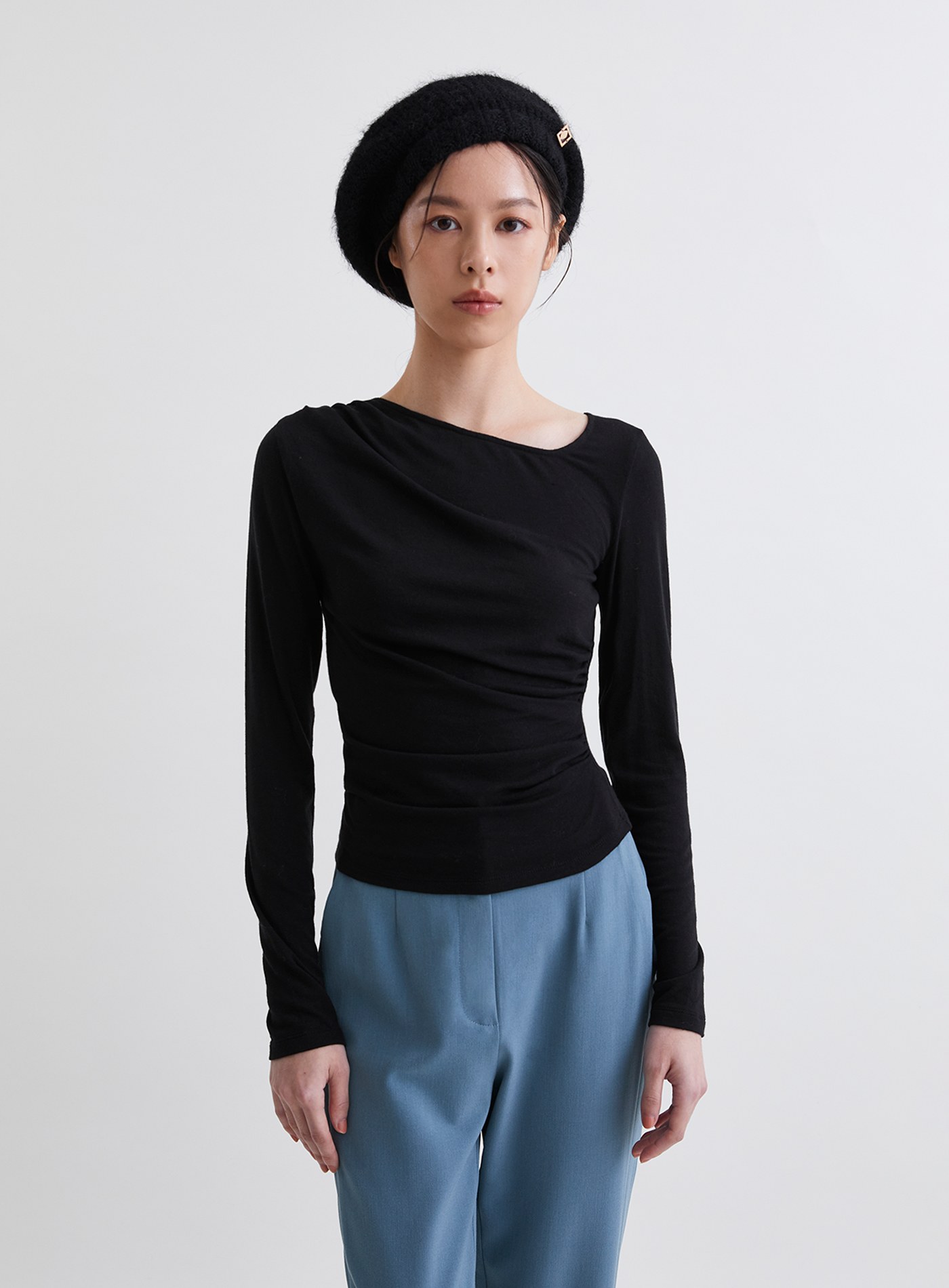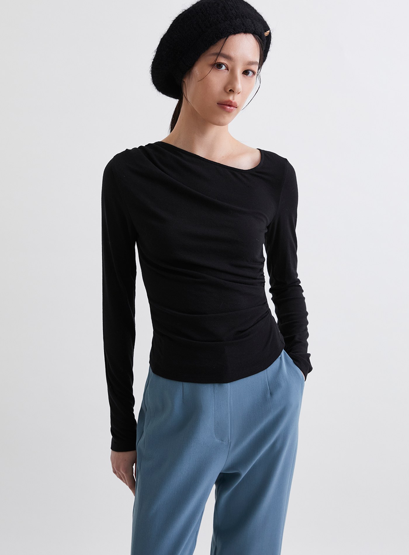 - 前側身抓斜皺設計,腰部保有空間,修身不貼身