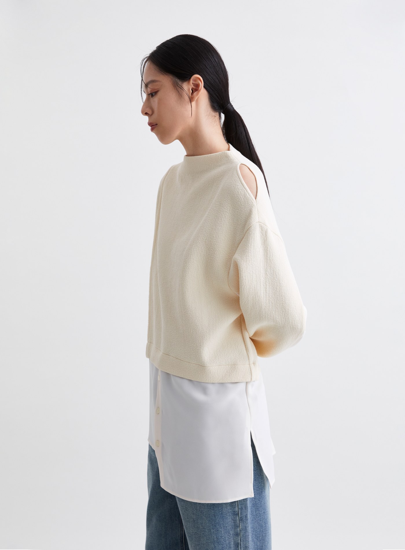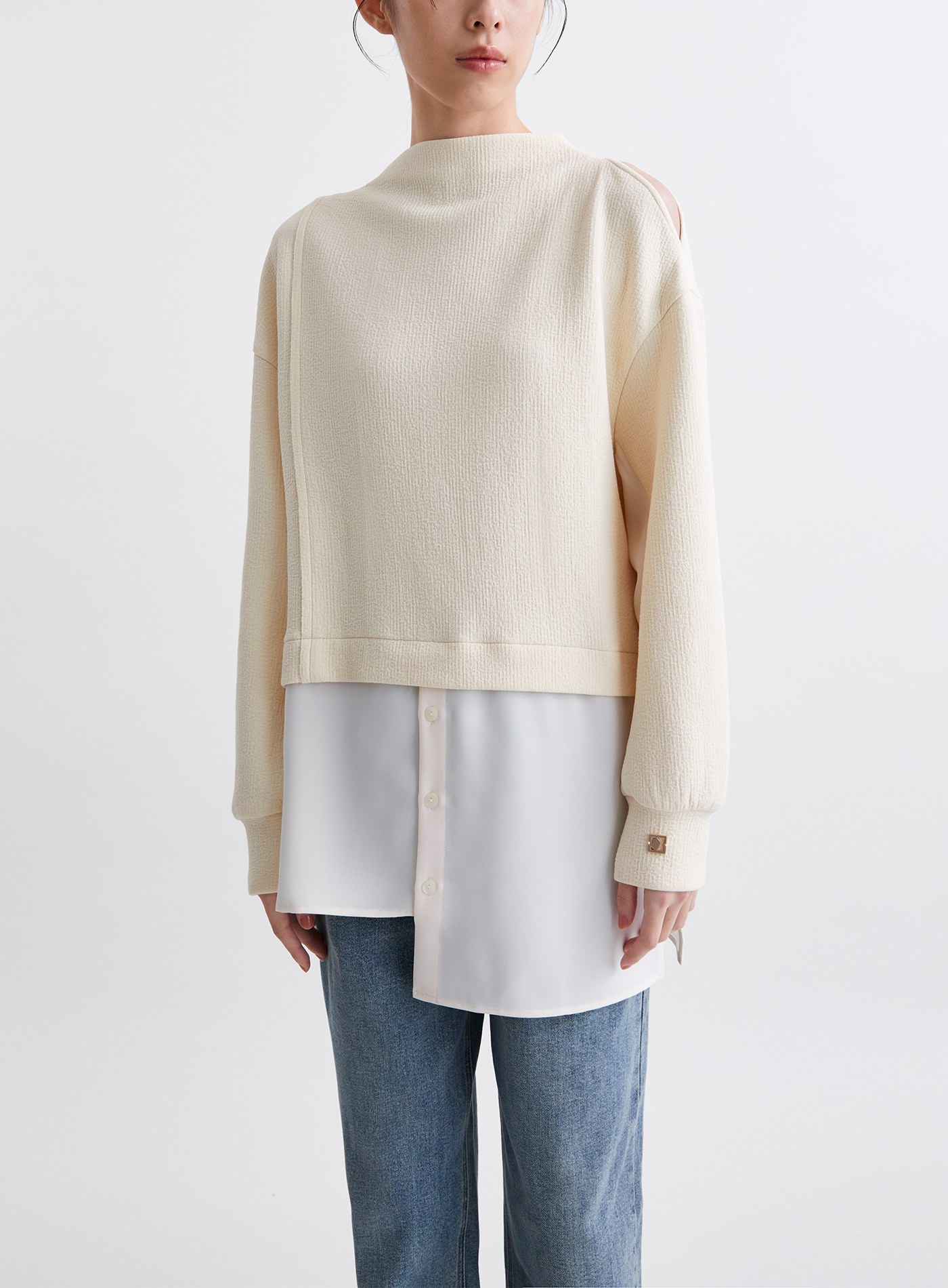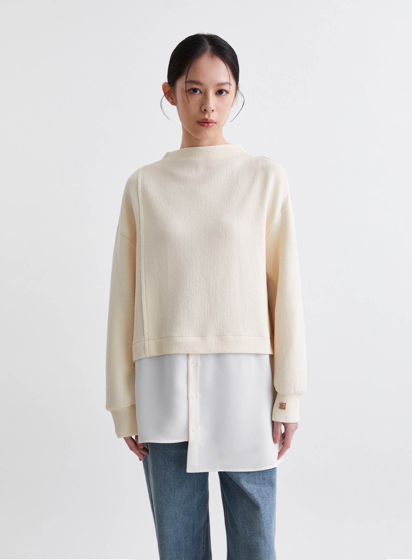 - 仿襯衫假兩件設計,寬鬆落肩版型,前身壓線不收邊細節