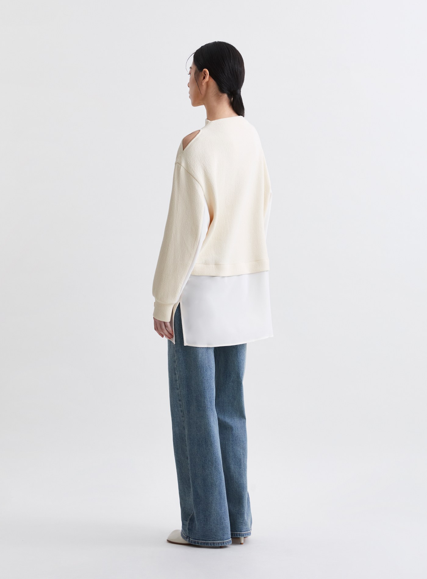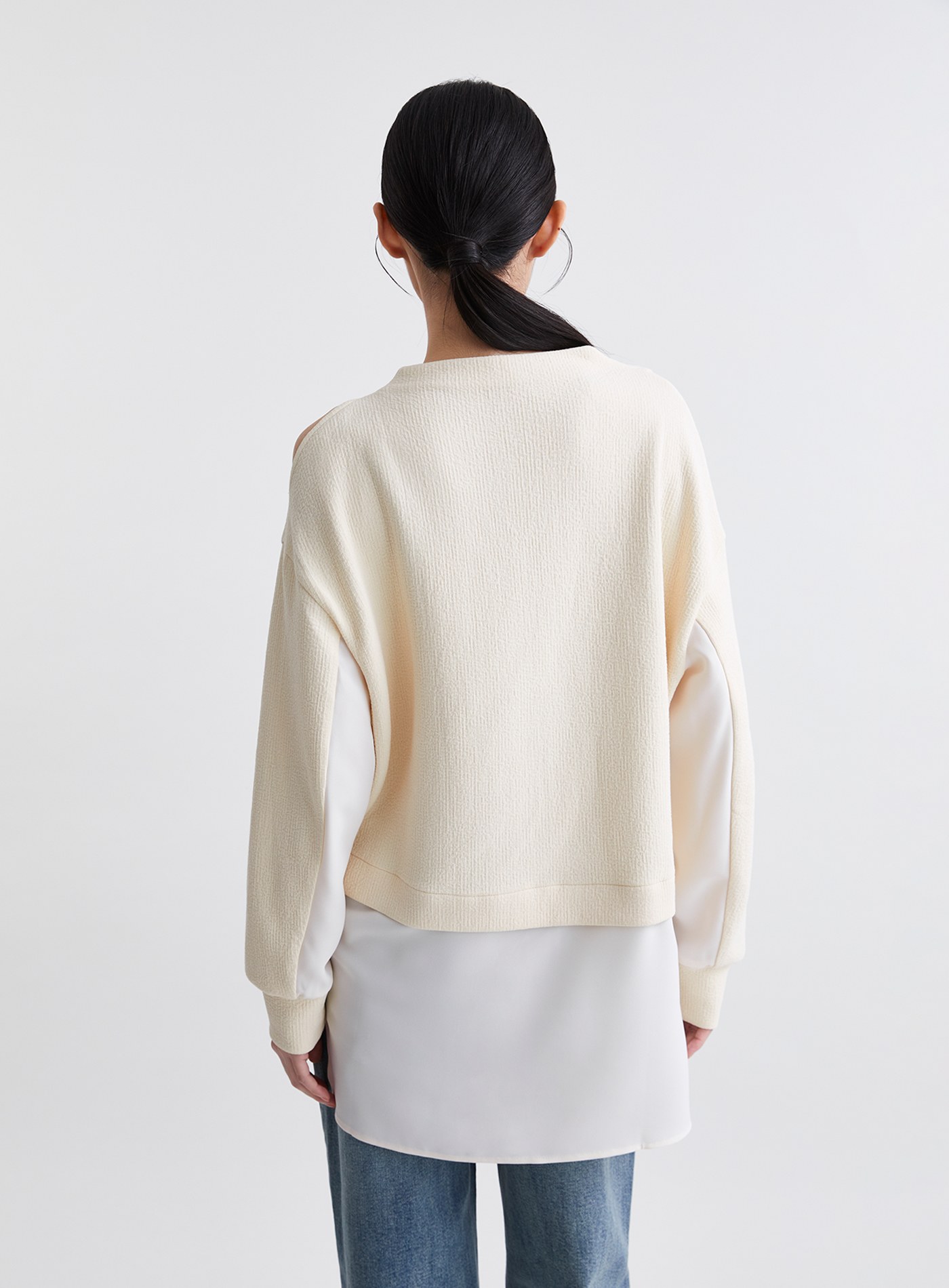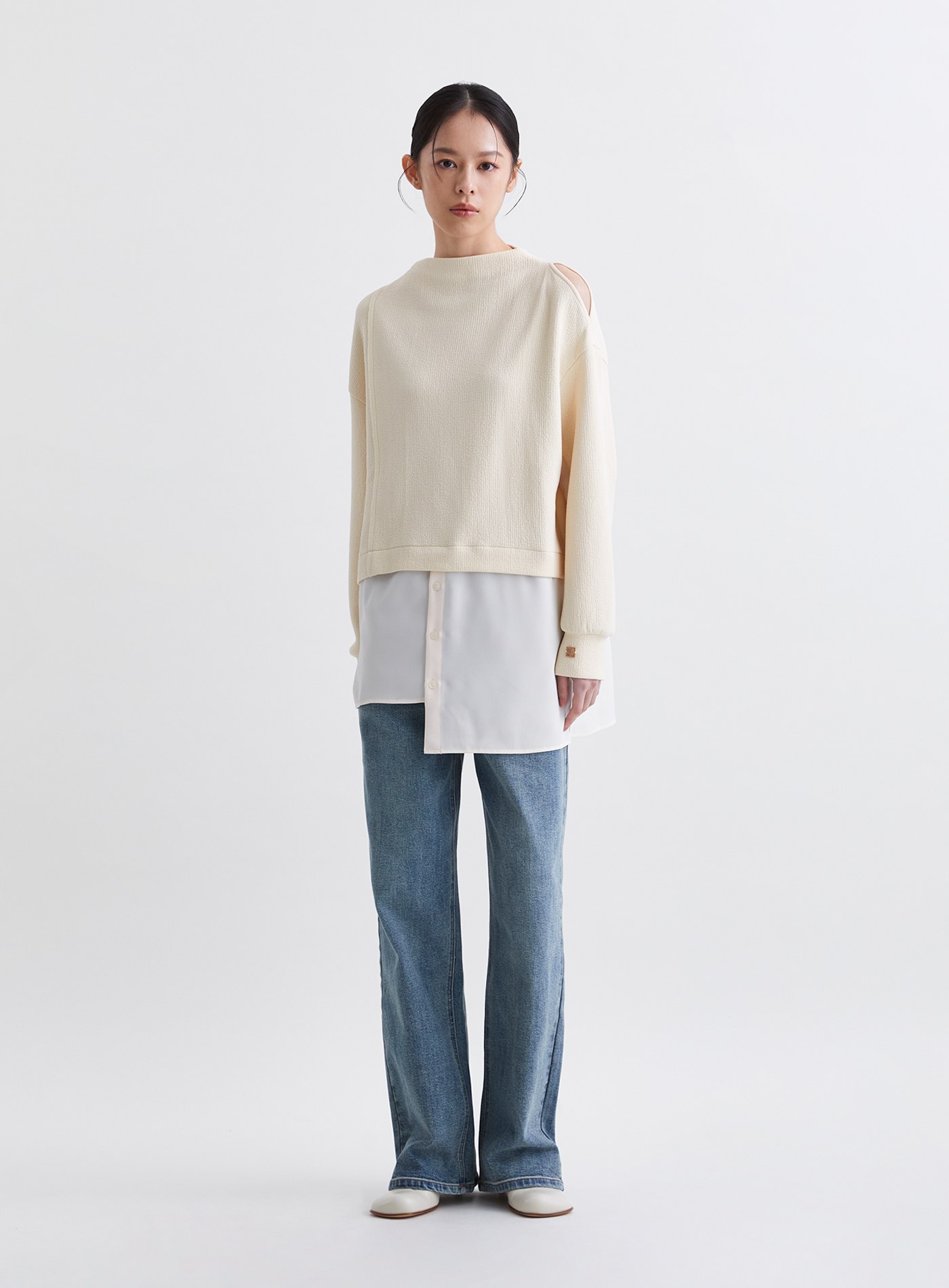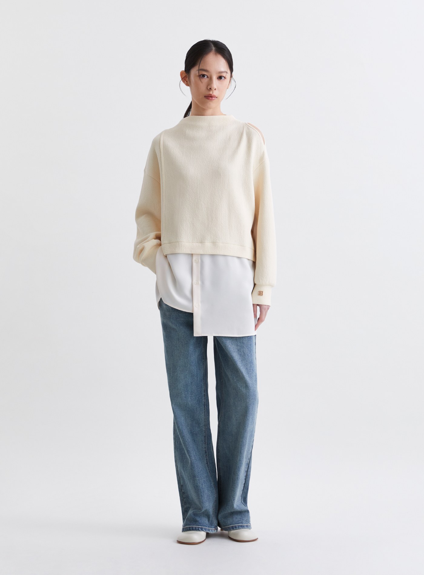 - 仿襯衫假兩件設計,寬鬆落肩版型,前身壓線不收邊細節
