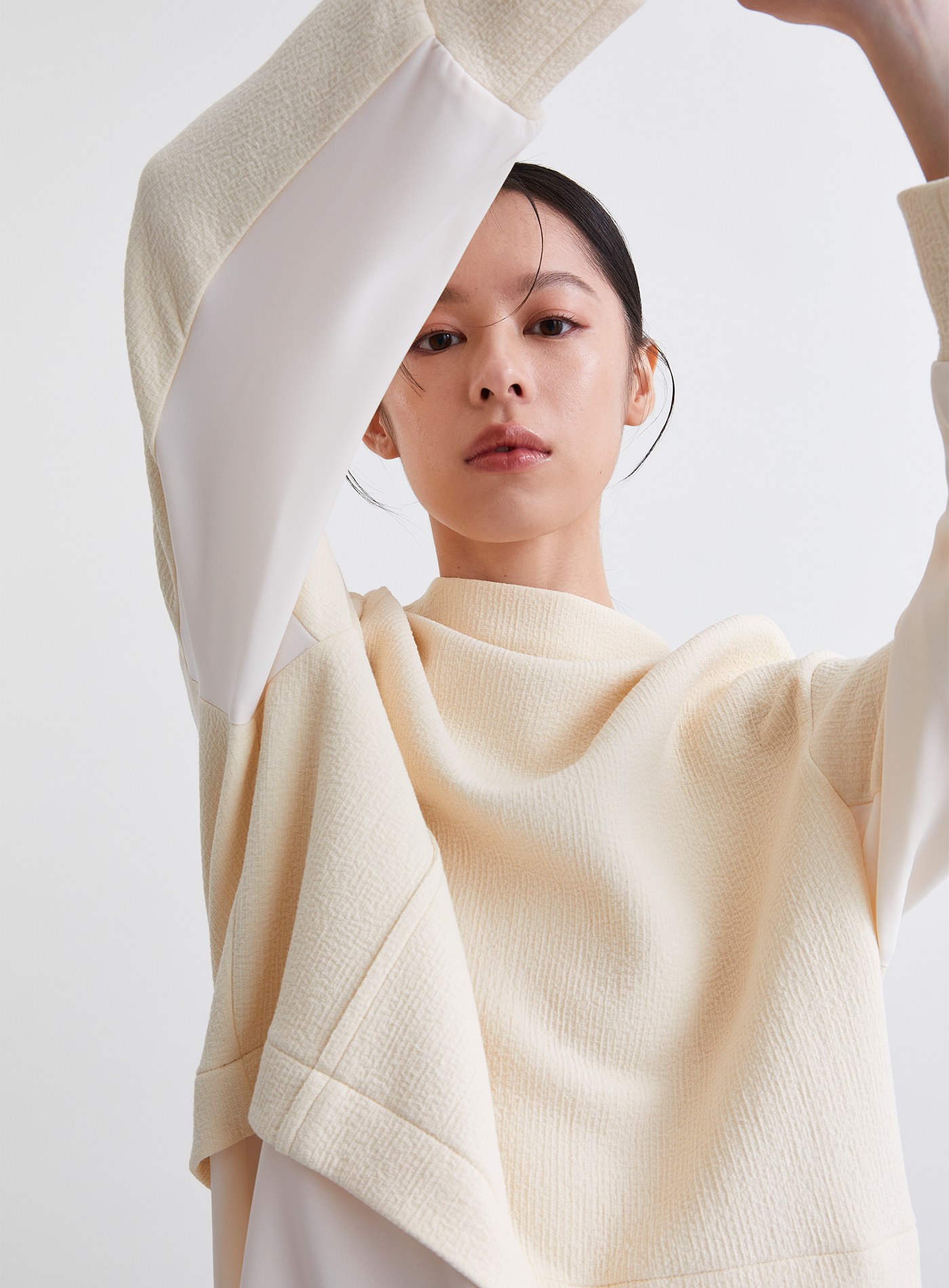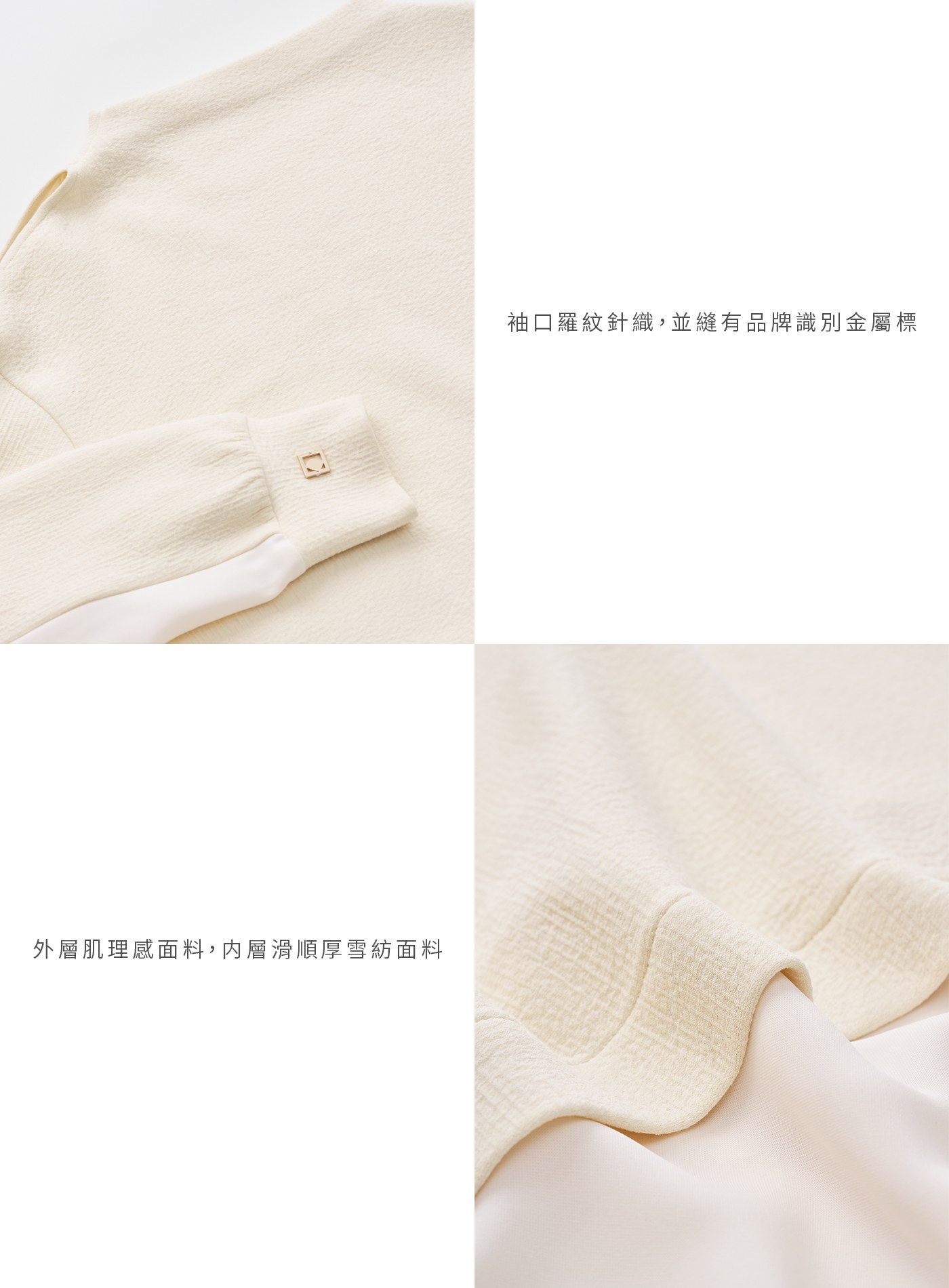 - 異素材拼接設計,外層肌理感面料,内層滑順厚雪紡面料