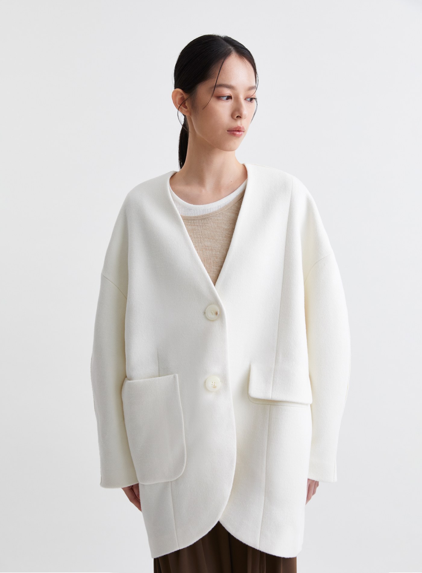 - 無領繭型oversize廓形,更顯率性大器
