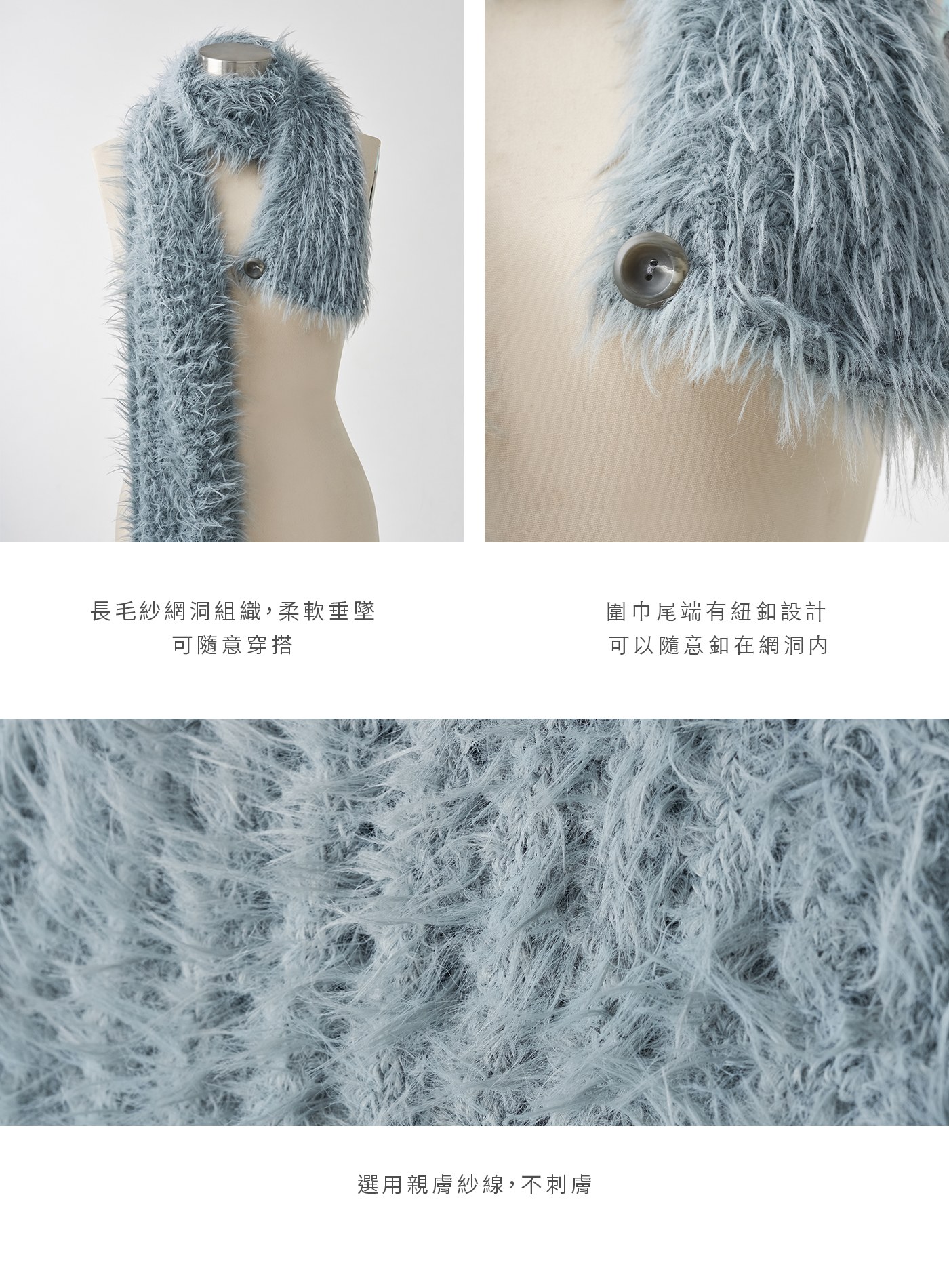 - 圍巾尾端有紐釦設計 可以隨意扣在網洞内