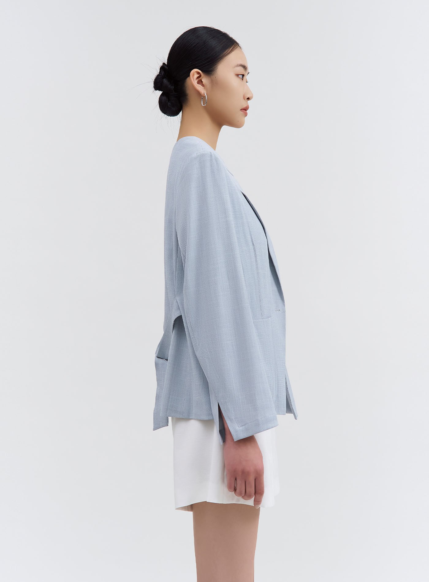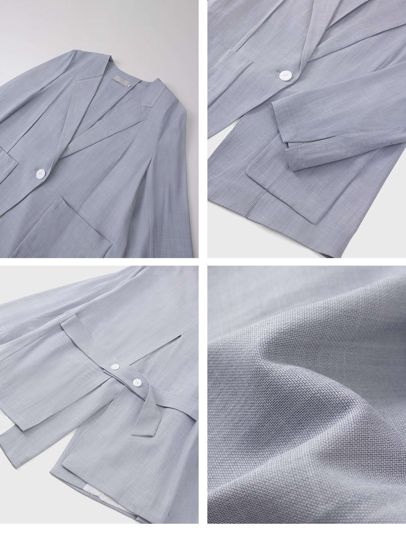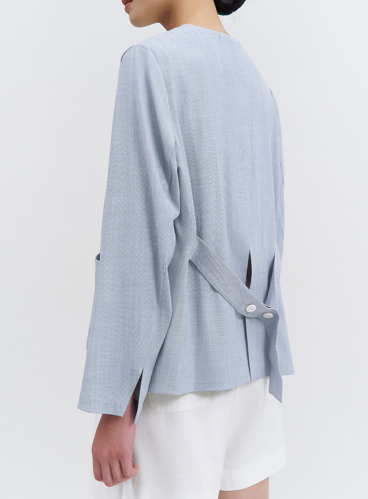 - 無領設計,下領片以裝飾活片呈現仿西裝領