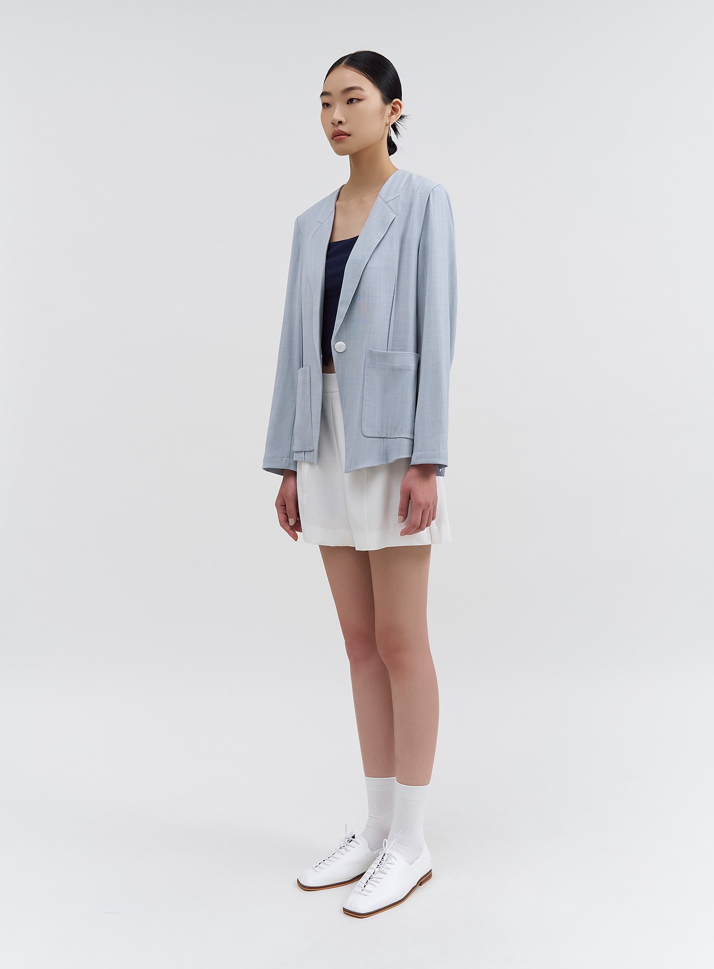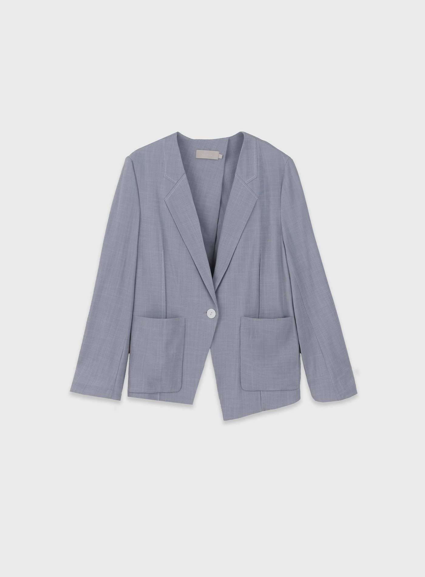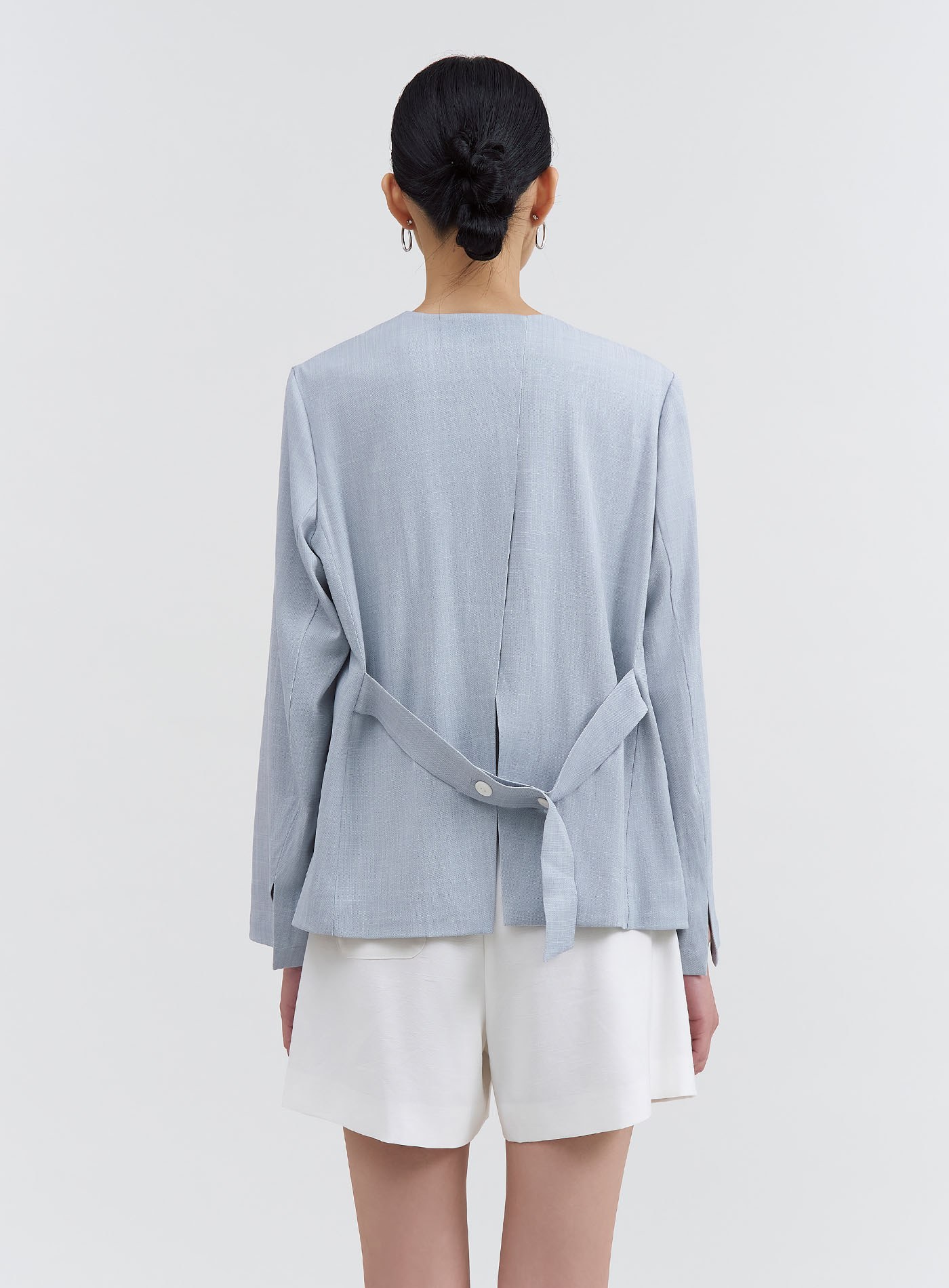 - 無領設計,下領片以裝飾活片呈現仿西裝領