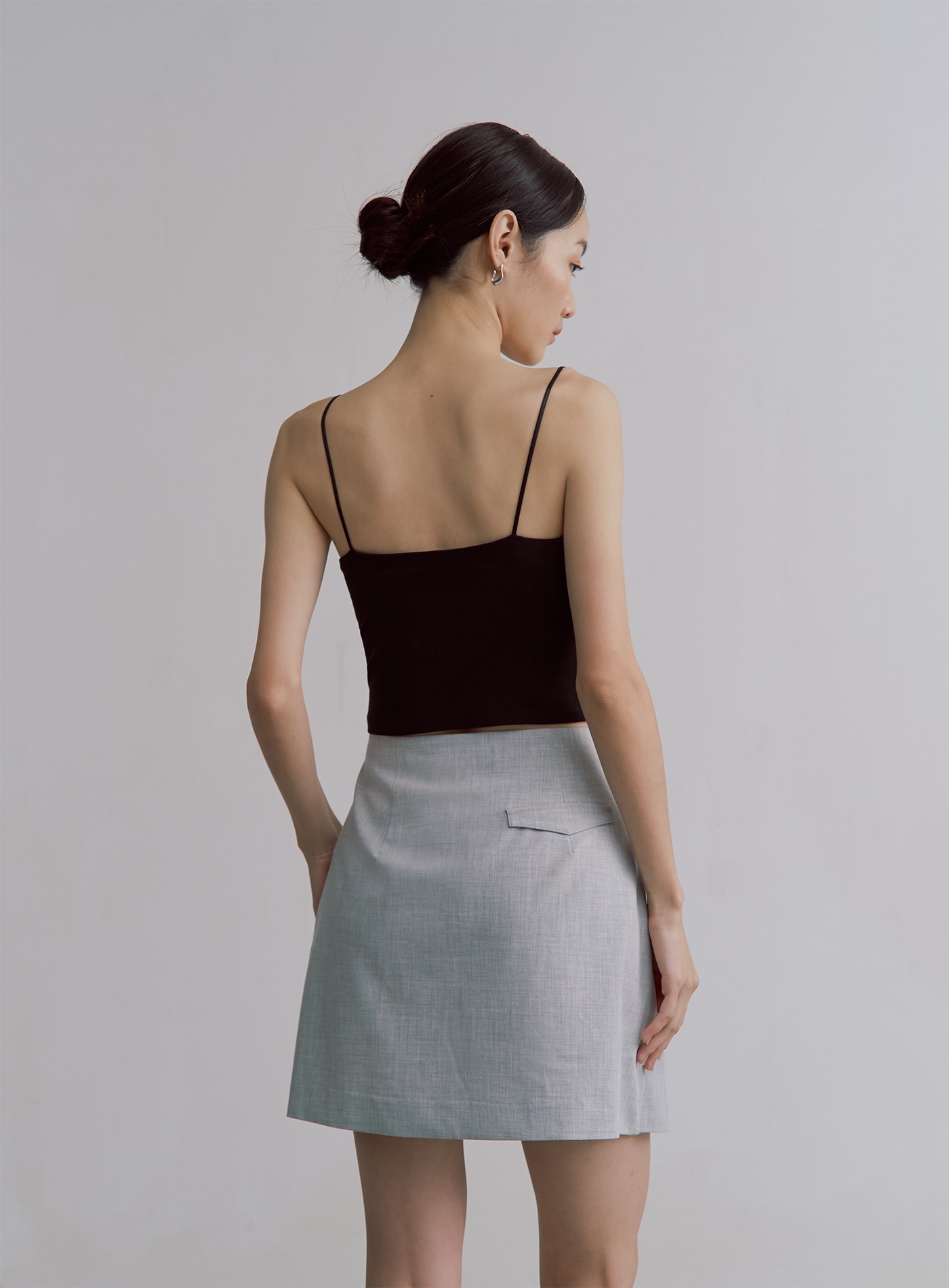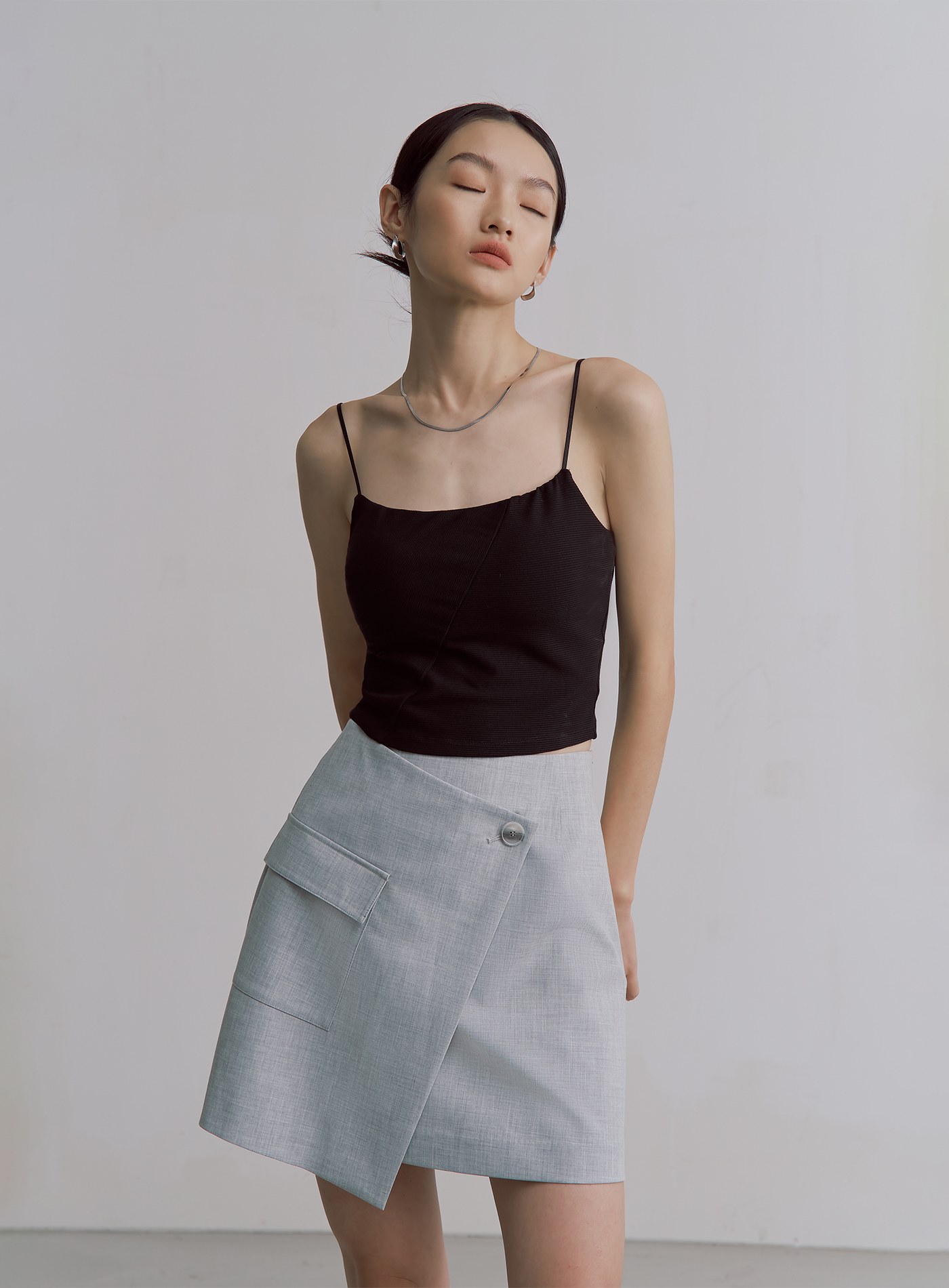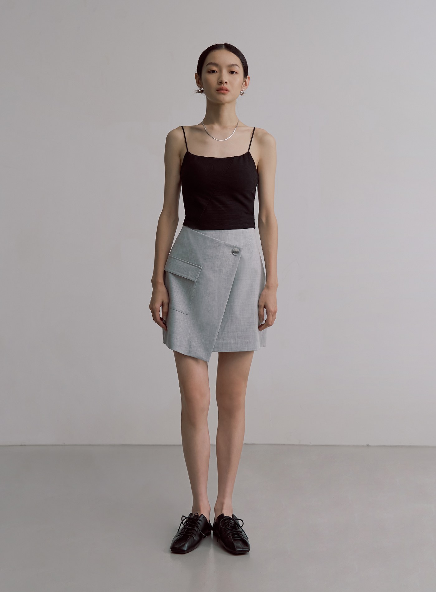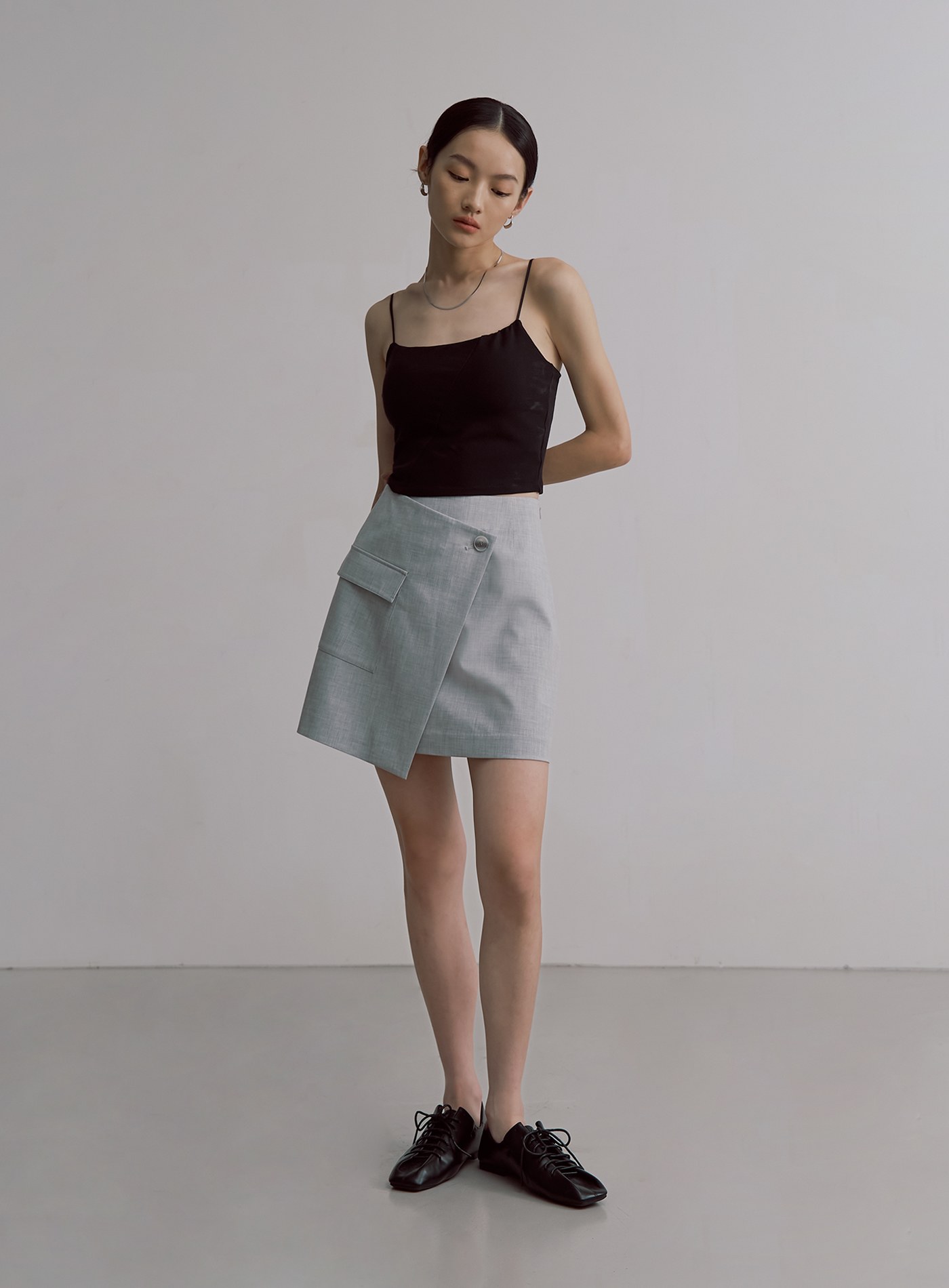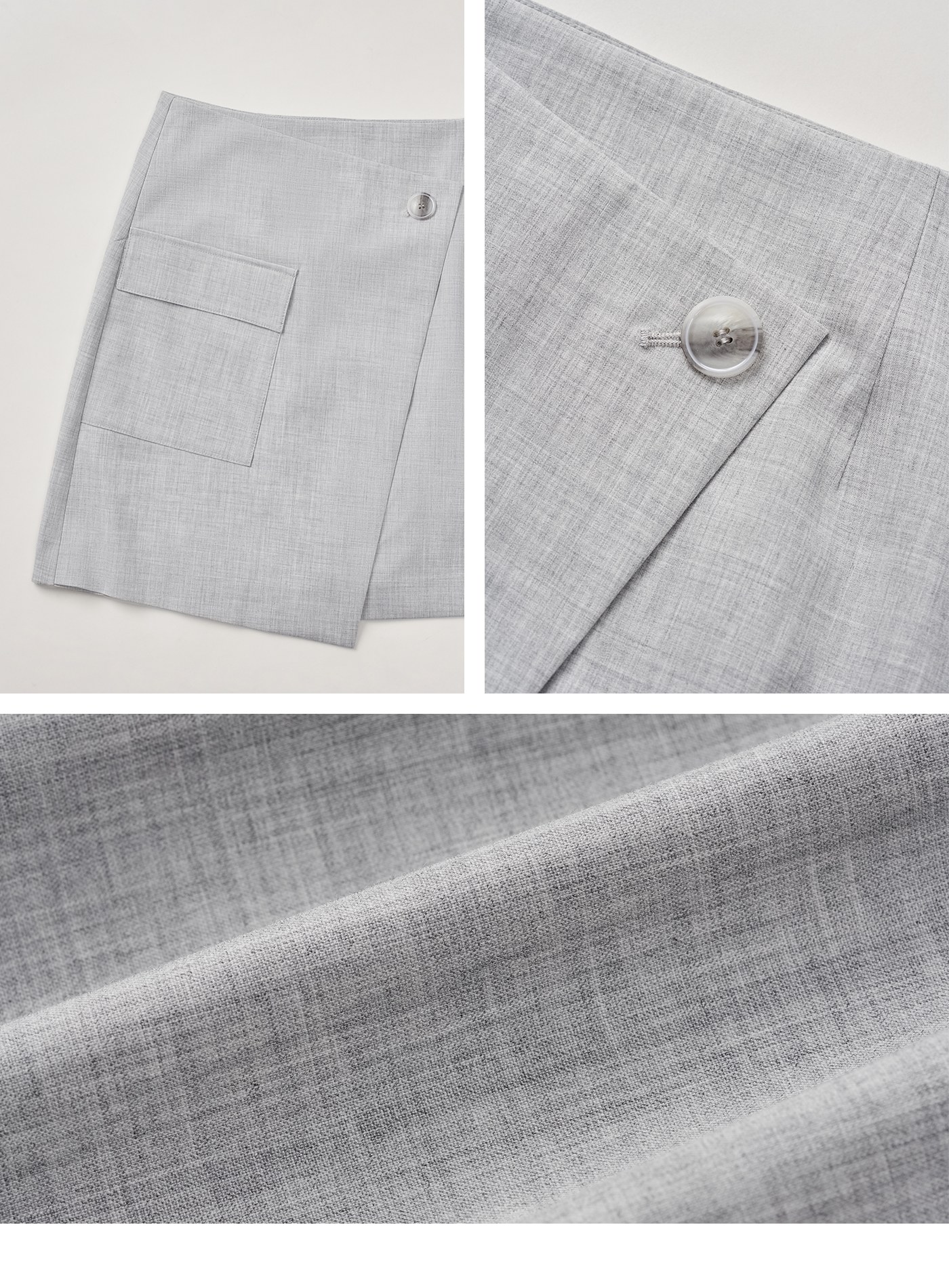 - 前片斜切交曡設計,側邊工裝貼袋,後片裝飾口袋
