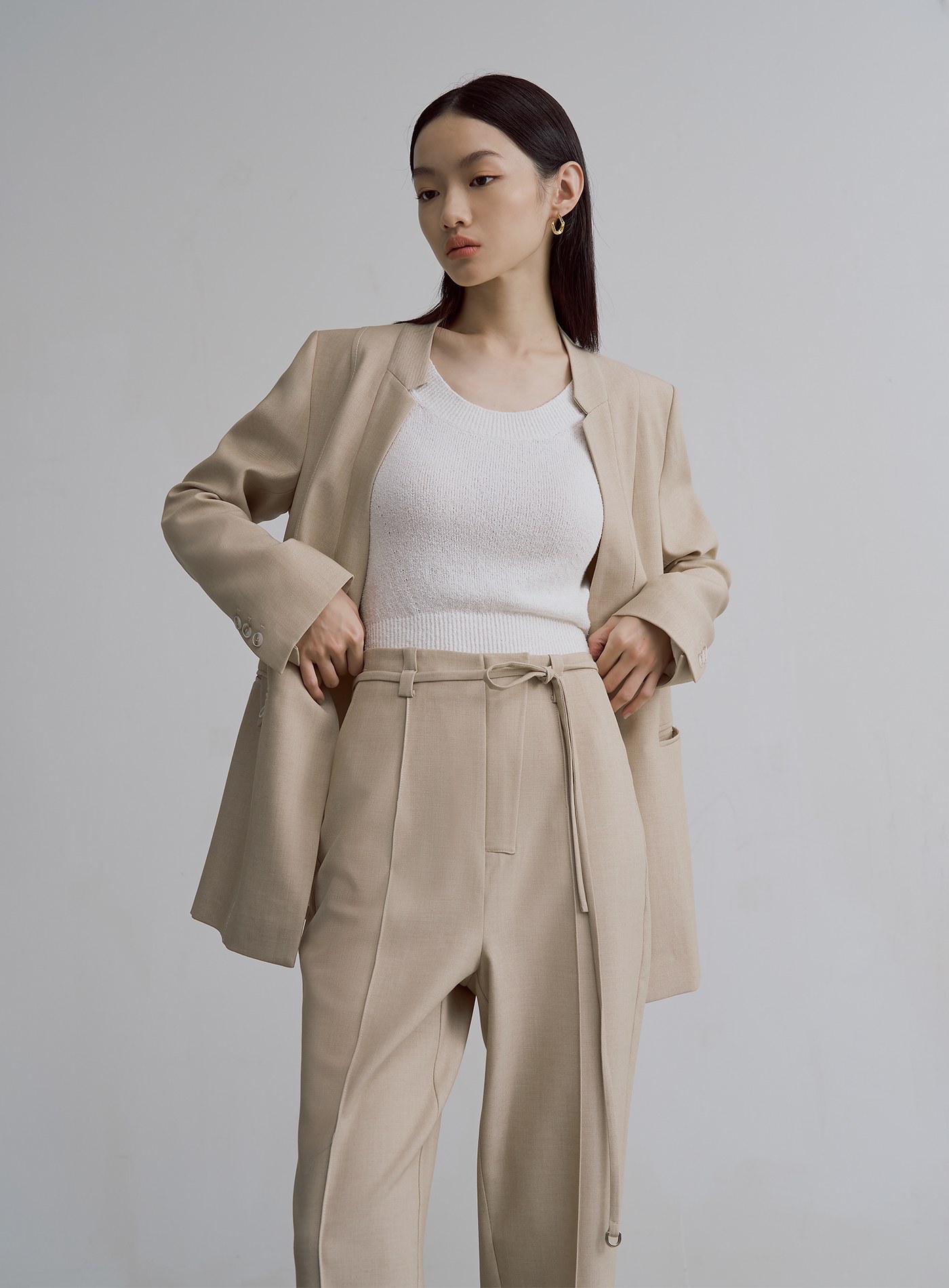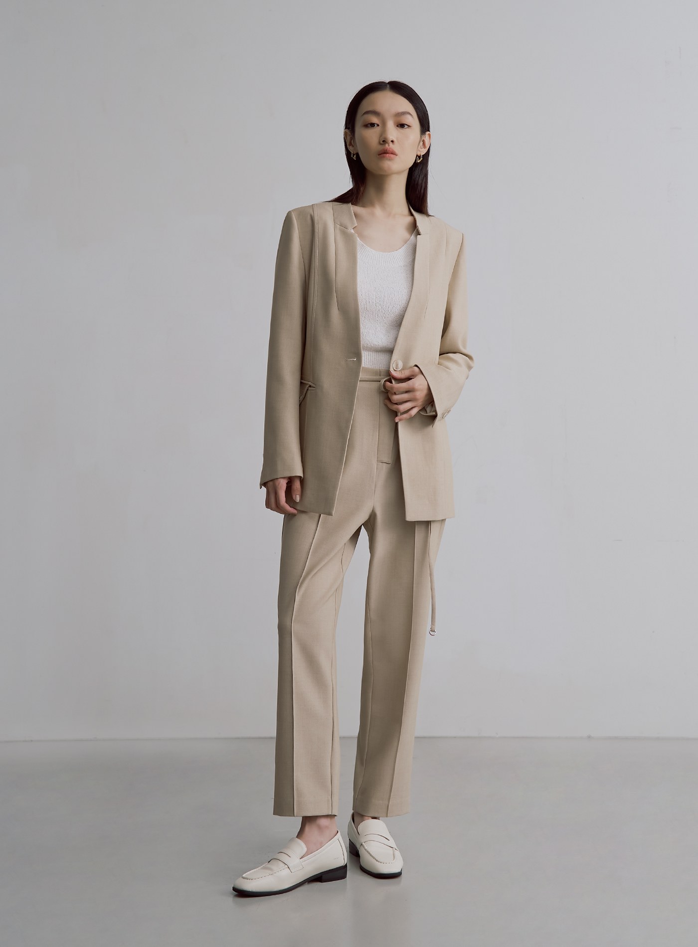 - 簡約無腰頭,特殊門襟設計,打破經典西裝廓形