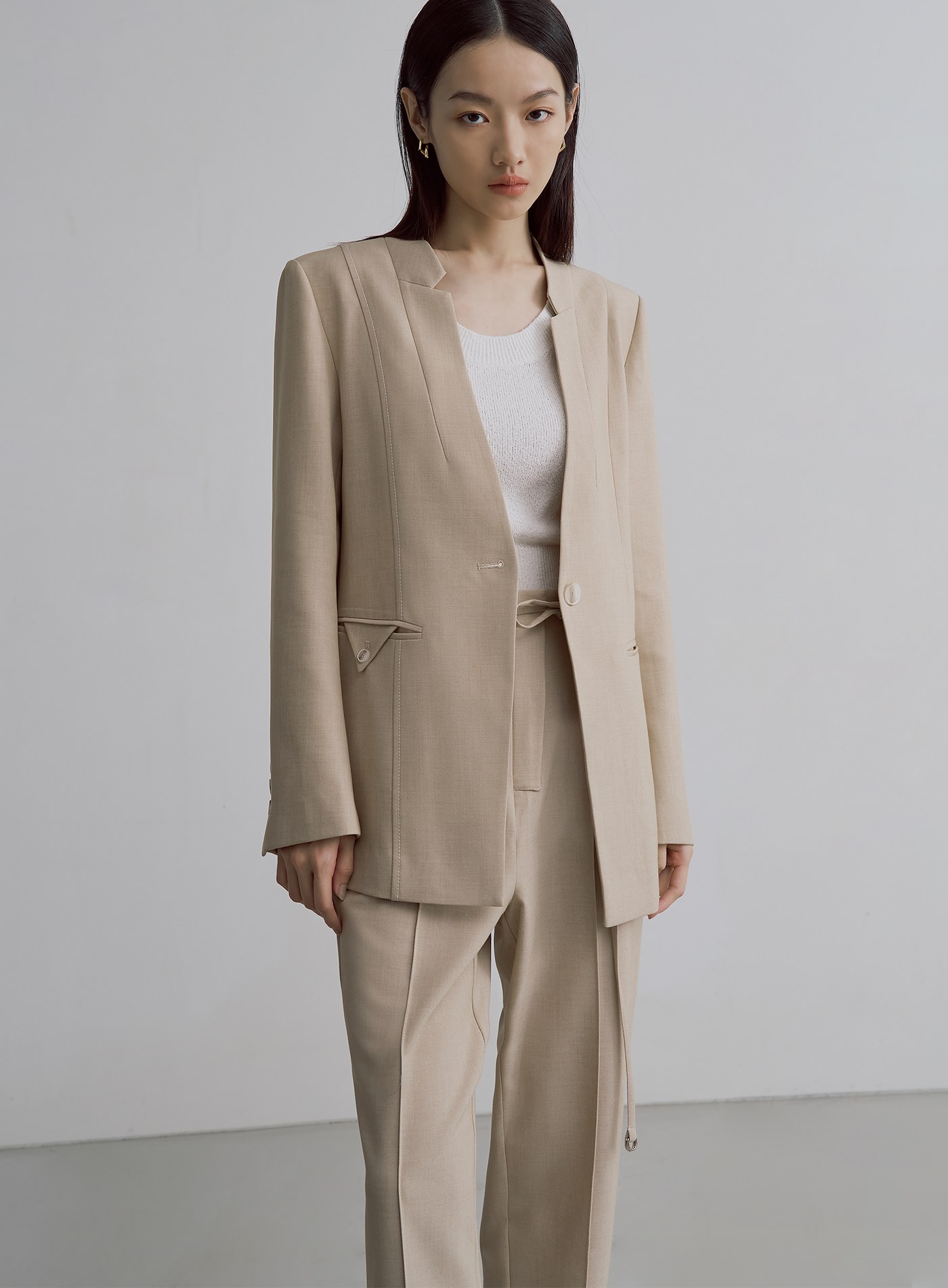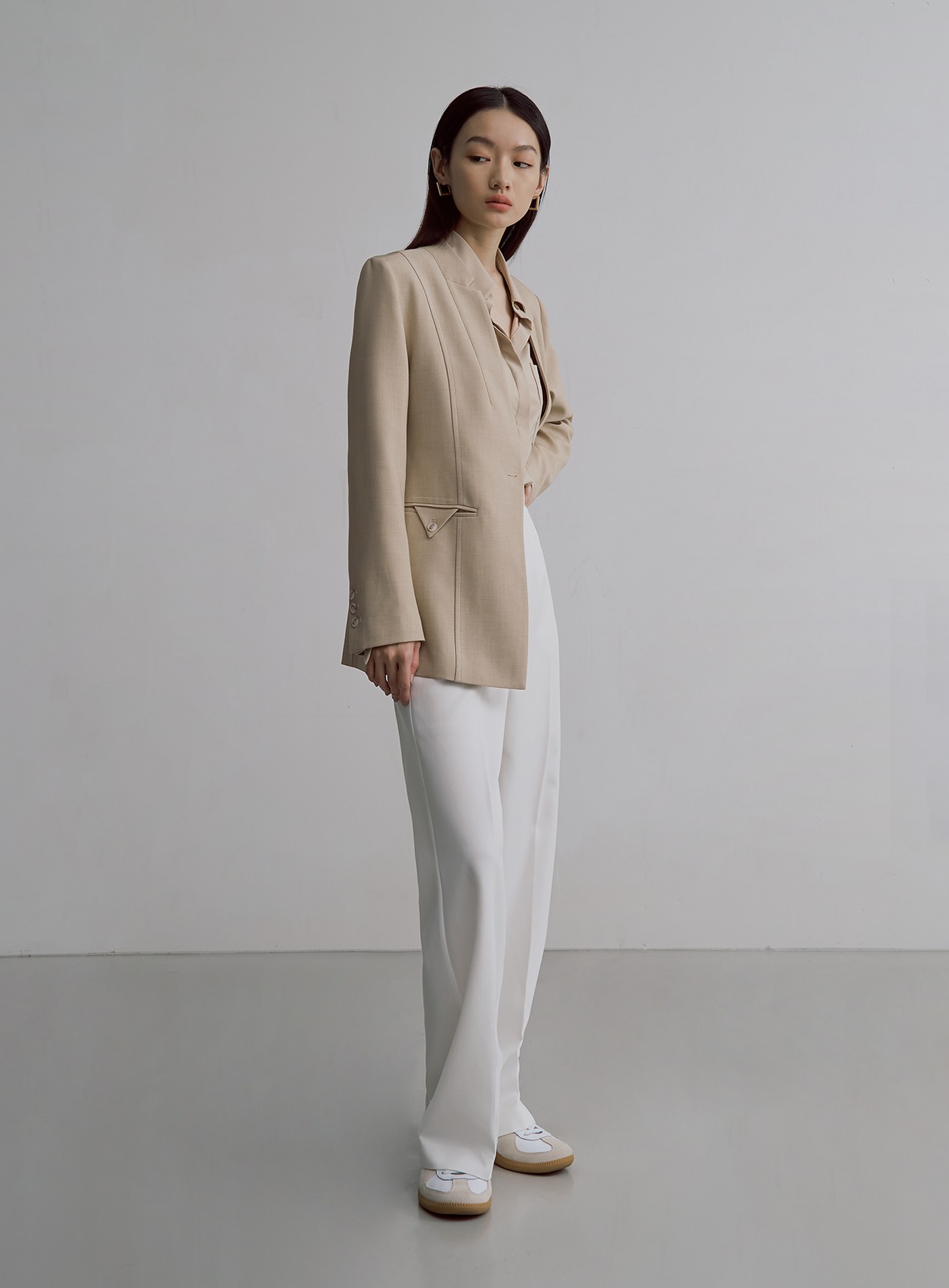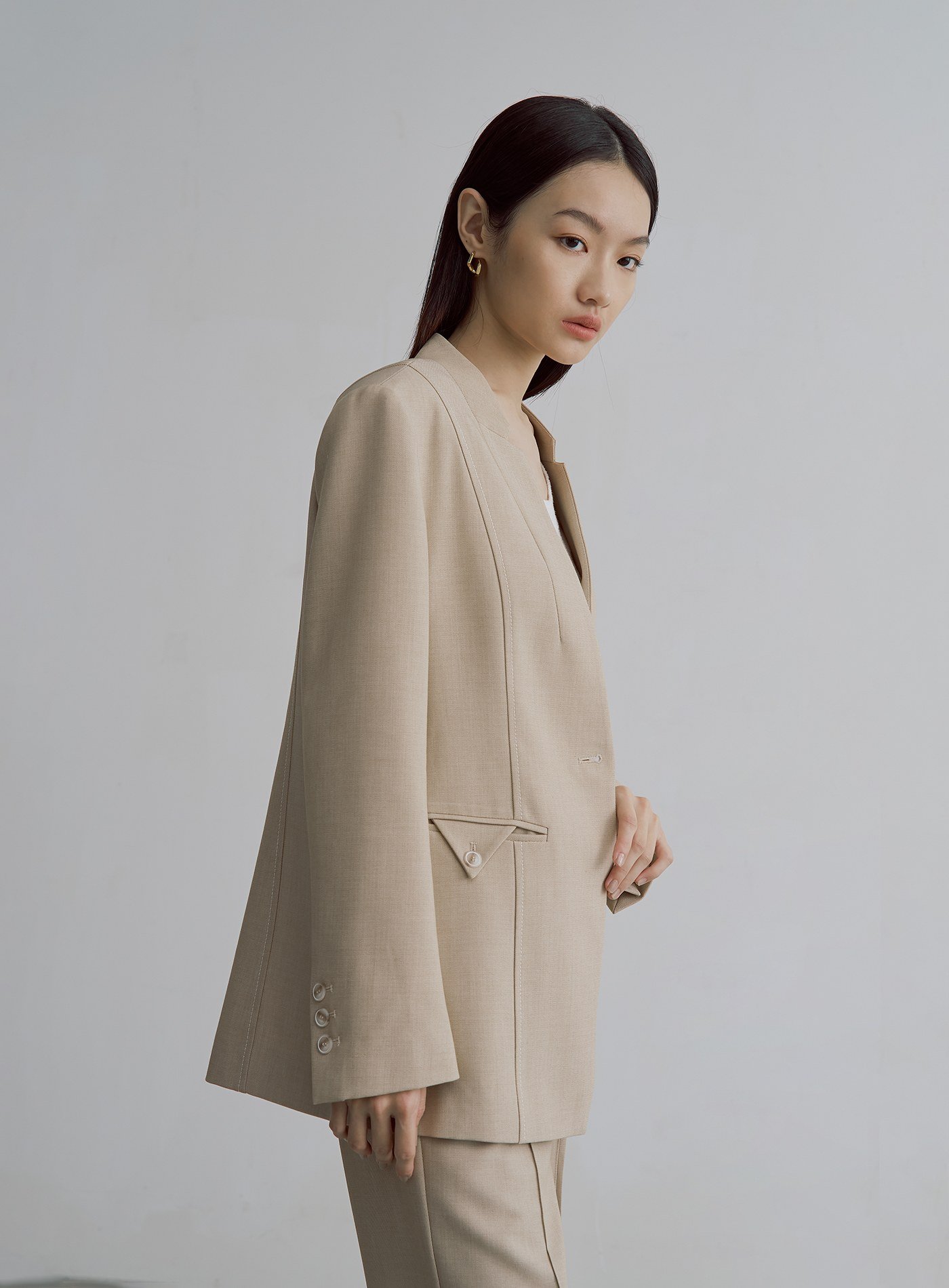 - 反向領型設計,兩側不對稱口袋設計,打破西裝的制式框架