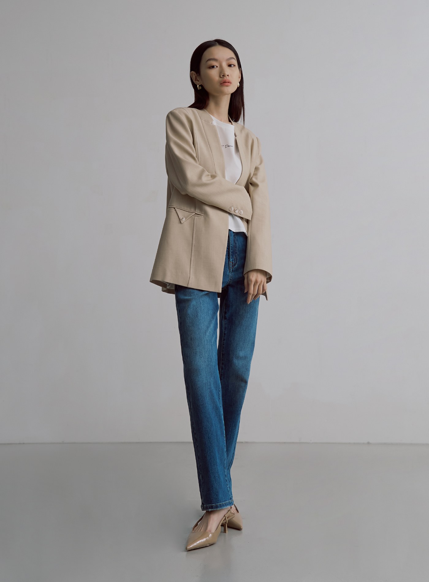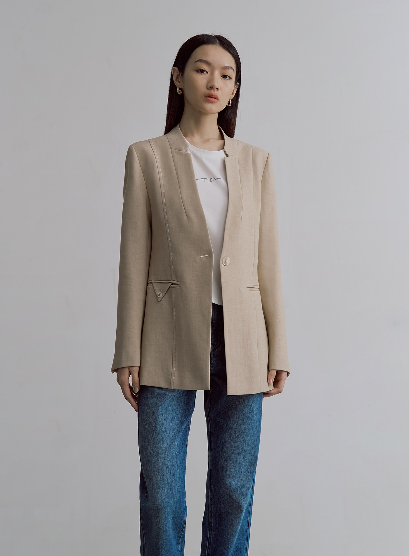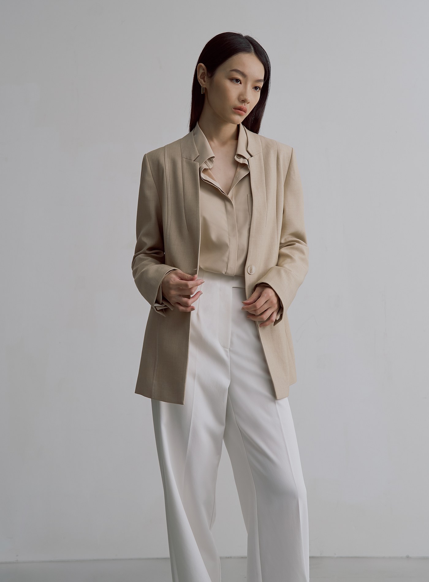 - 反向領型設計,兩側不對稱口袋設計,打破西裝的制式框架