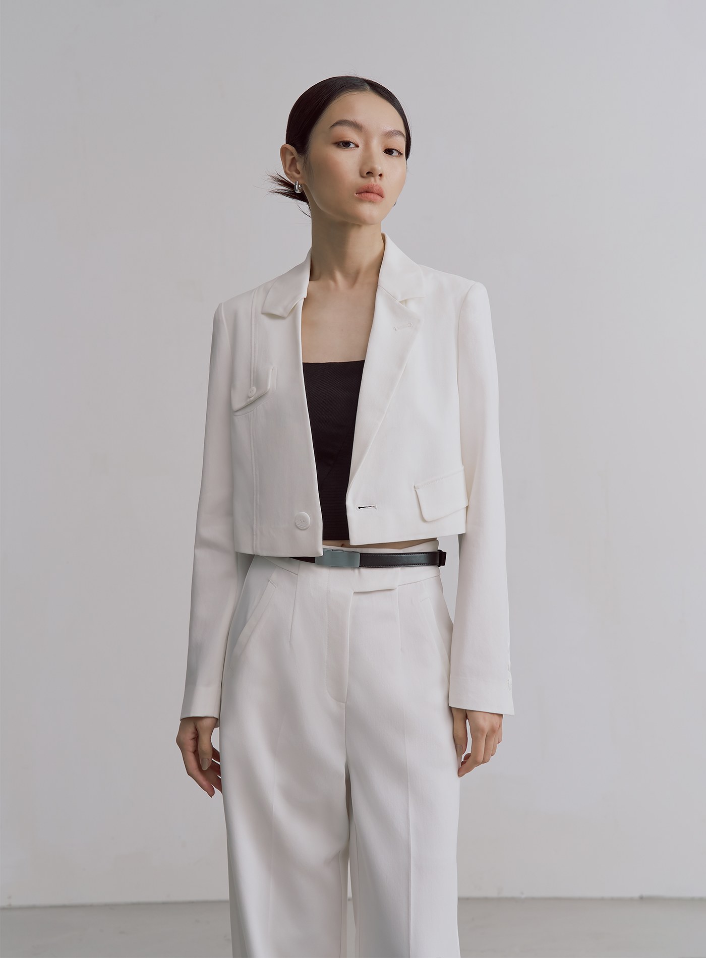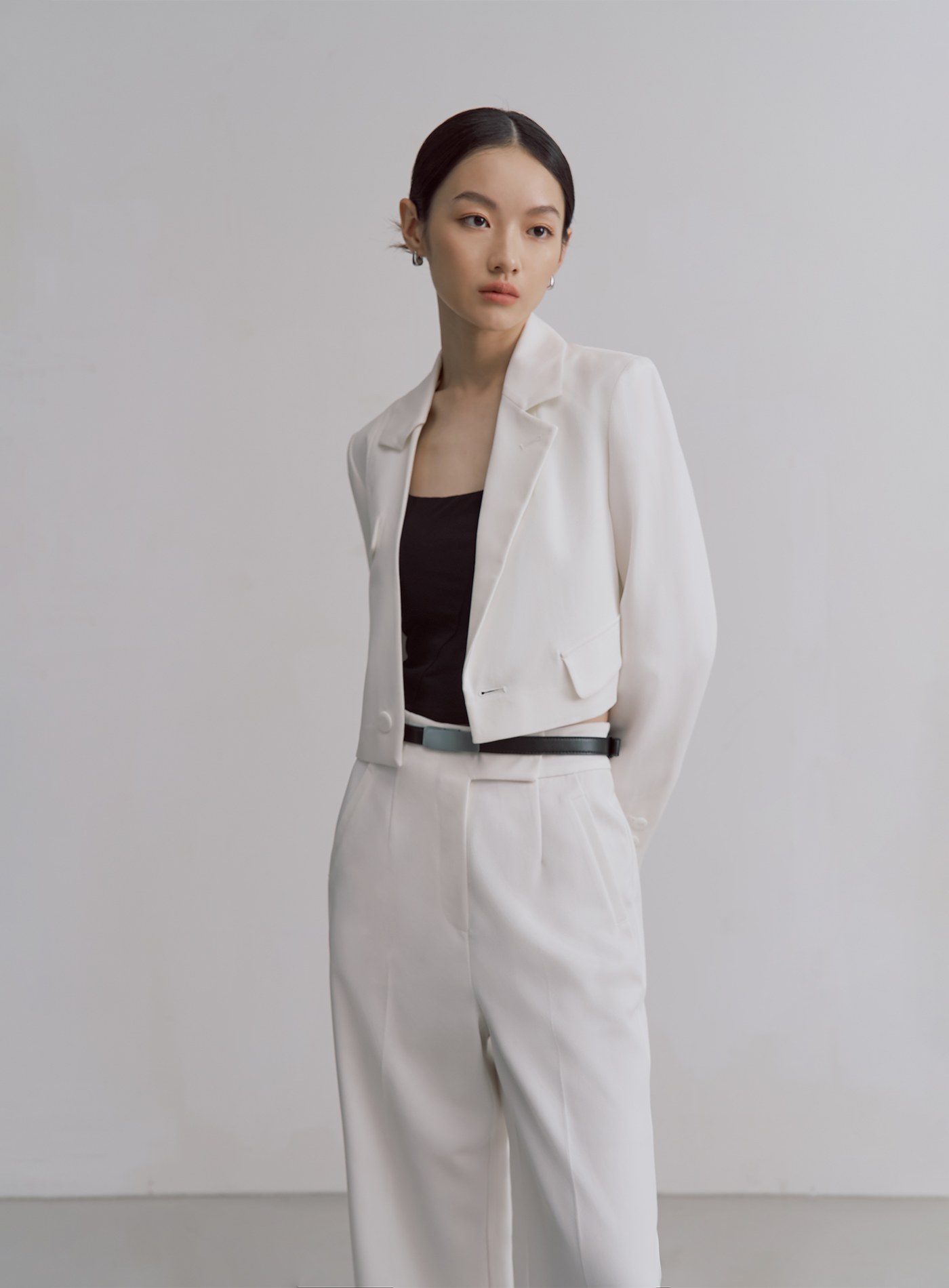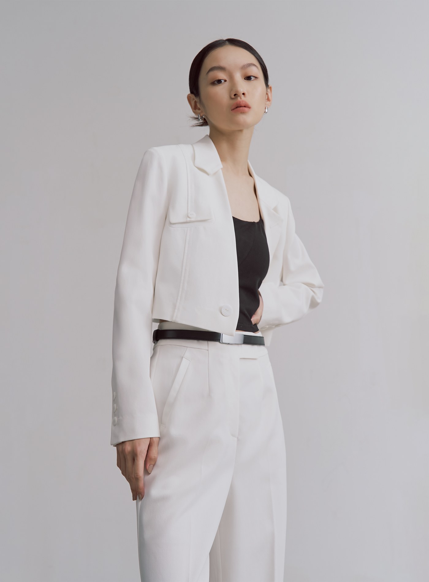 - 短版西裝版型,直順剪裁,展現俐落精神氣息